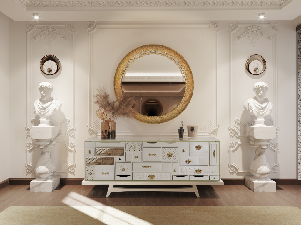 The Heritage Sideboard brings cultural richness, while the Halo Mirror introduces a soft, radiant glow. This combination creates a refined luxury entryway design where history and modern elegance coexist effortlessly.