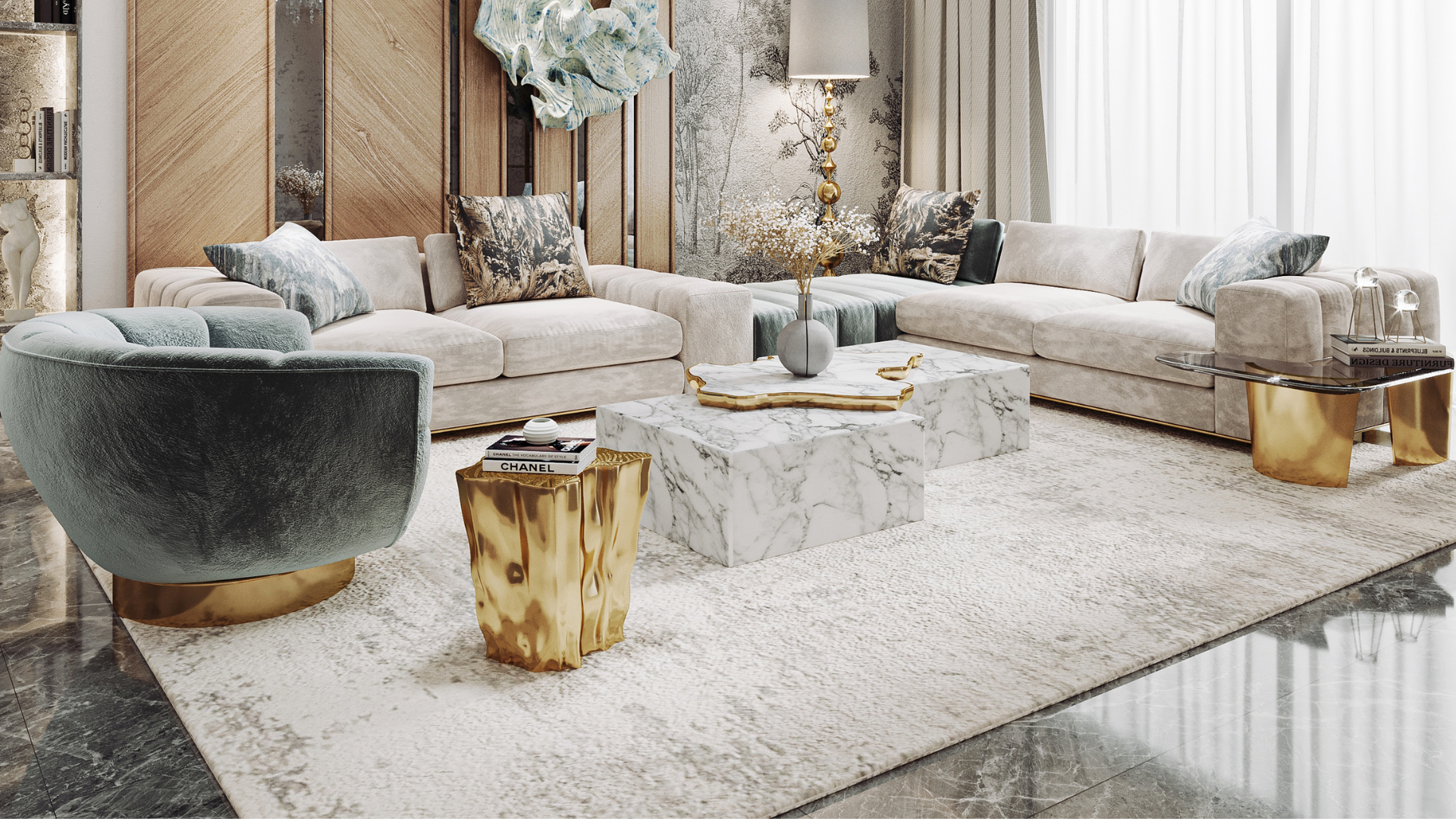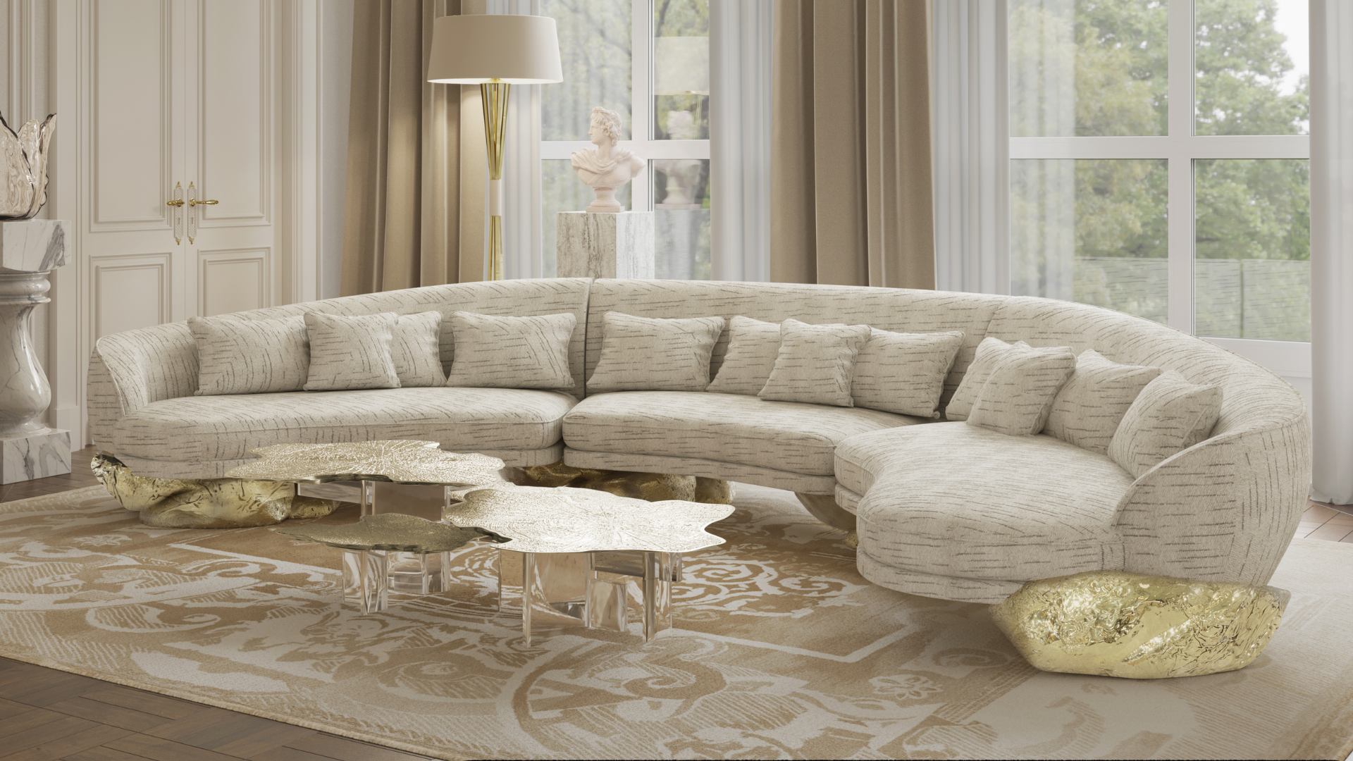 Aside from the stunning design, the color palette of this luxury hallway design is absolutely amazing! Limited edition furniture is the star, enhancing an exclusive ambiance, together with a contemporary feel. Diamond Amethyst sideboard is sensuously sharp yet with alluring details of 19th century Romanticism that inspire and ignites excitement and wonder to the surroundings.
