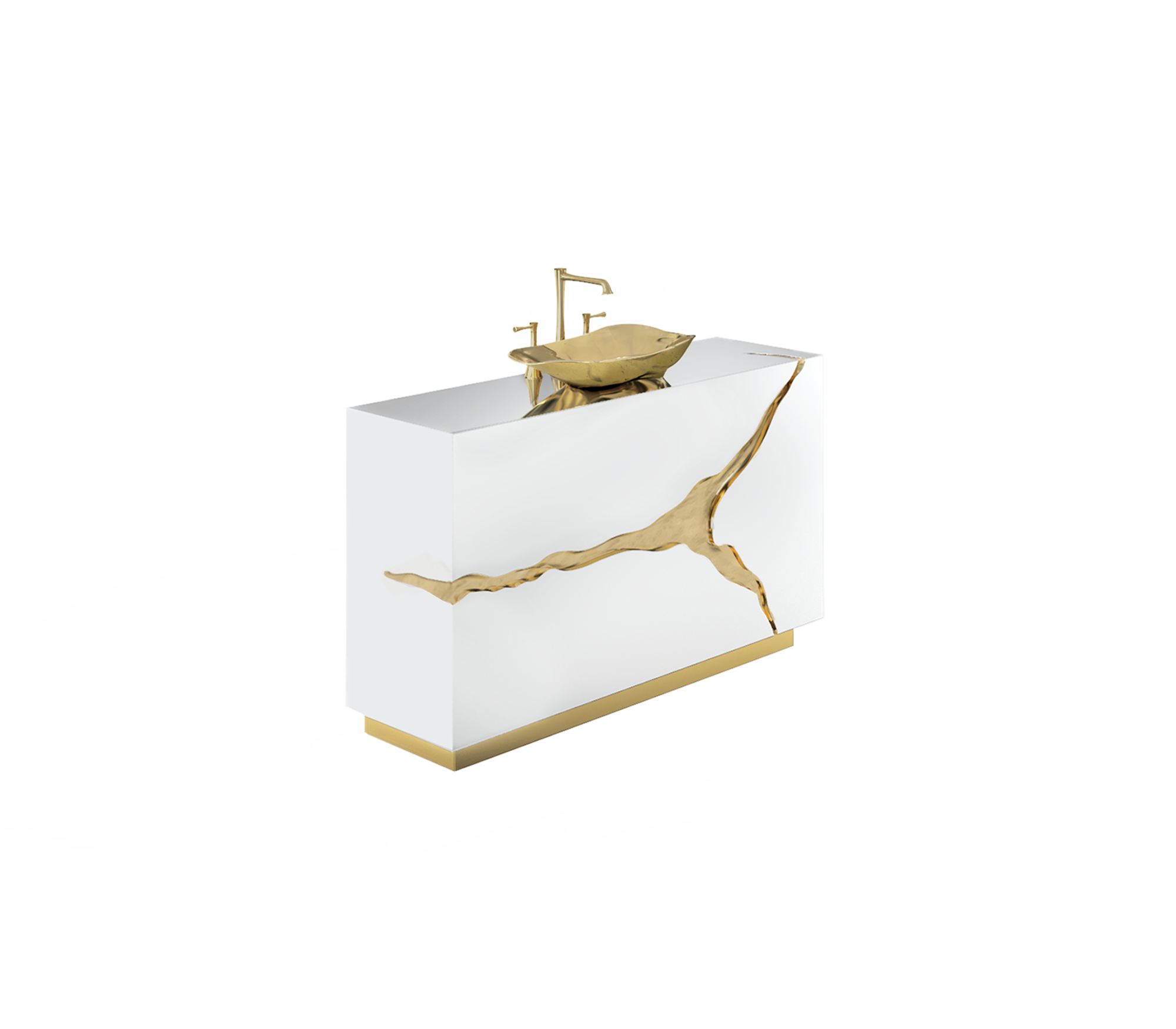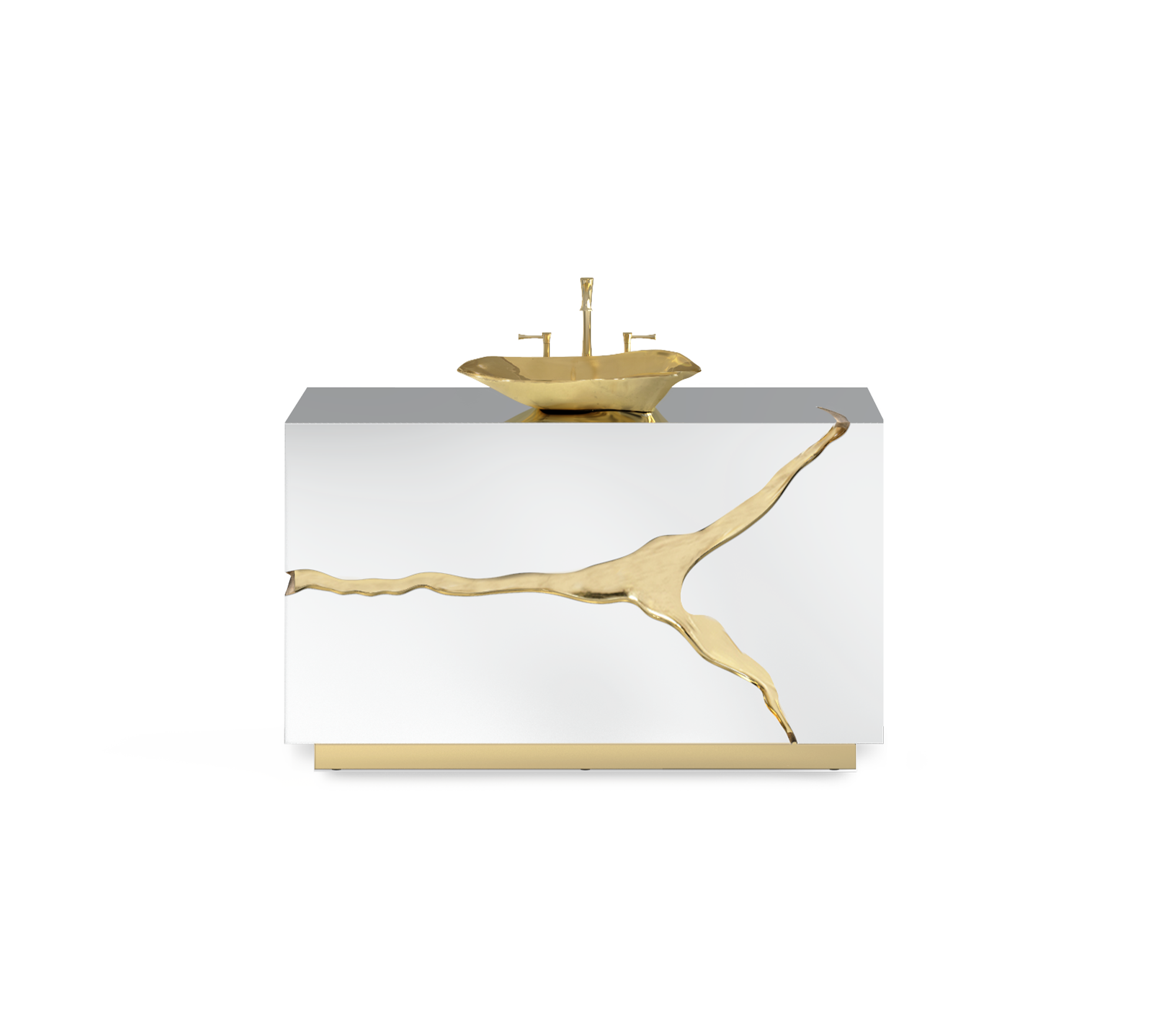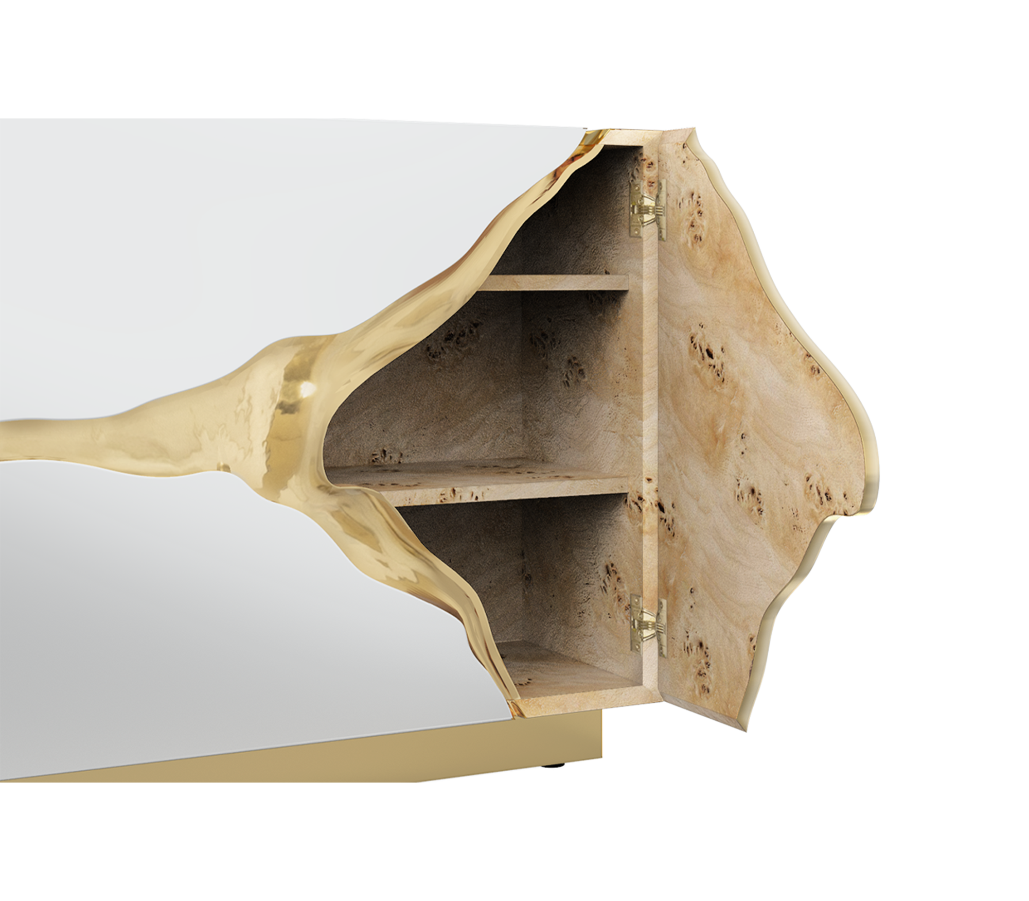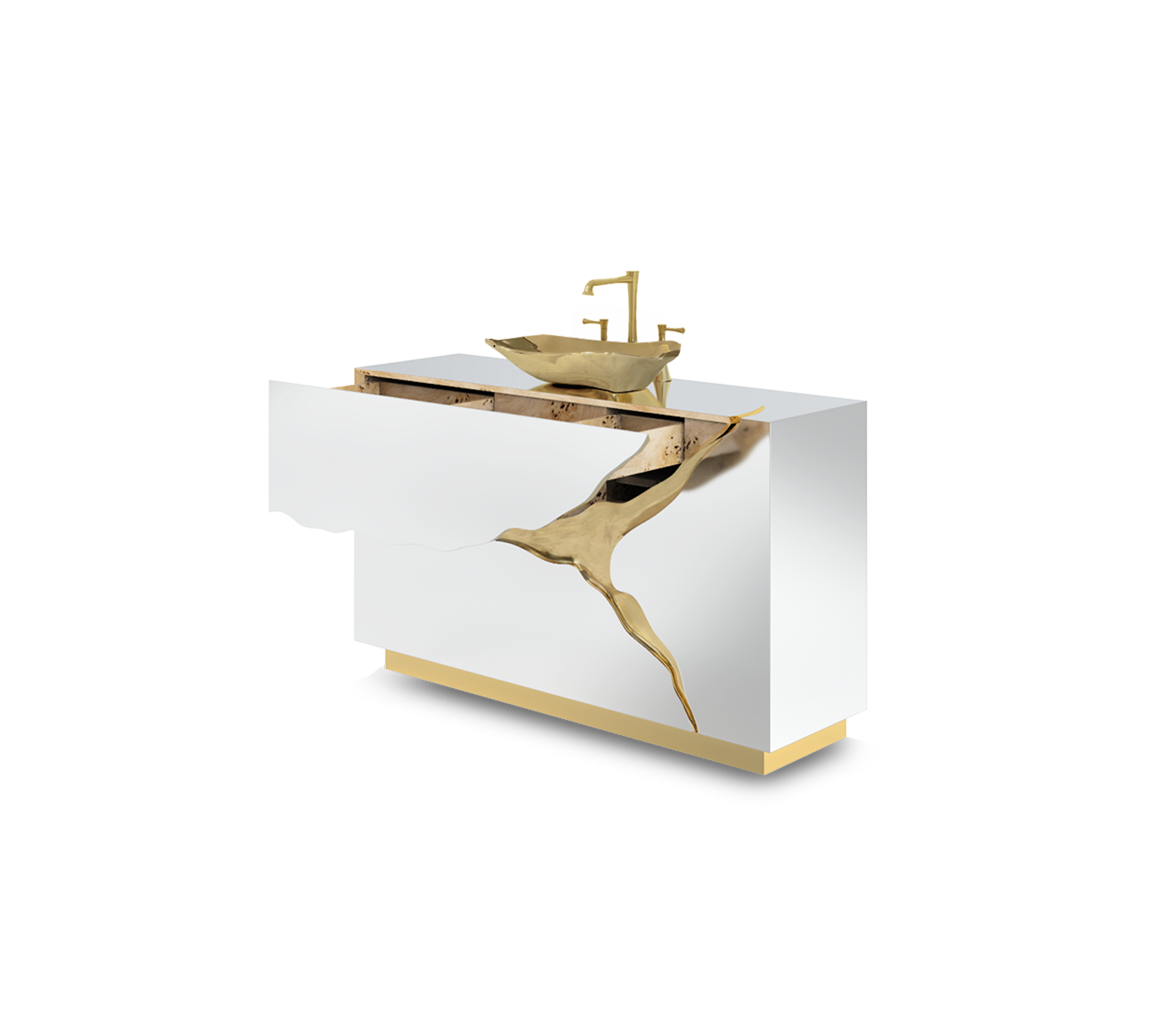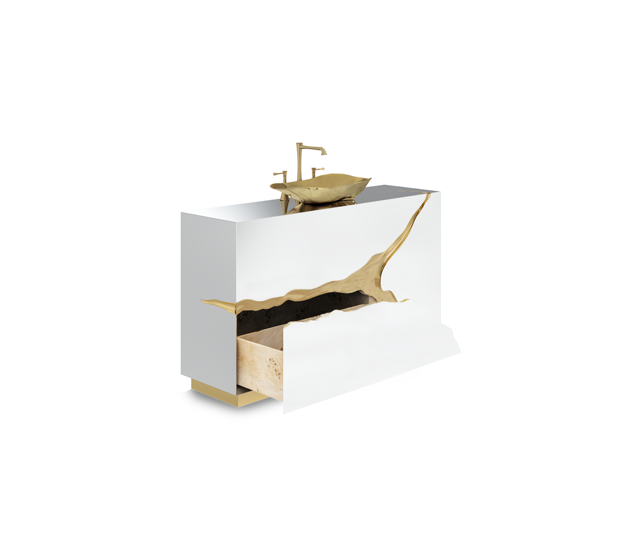 Lapiaz was inspired by the typical karst formations produced by the dissolution of limestone rocks. With a polished brass tear enhanced by its rich aesthetic as well as a set of one door and two drawers finished in poplar root veneer, this Lapiaz Single Vanity Cabinet is such a statement that stands out in your bathroom interior design.