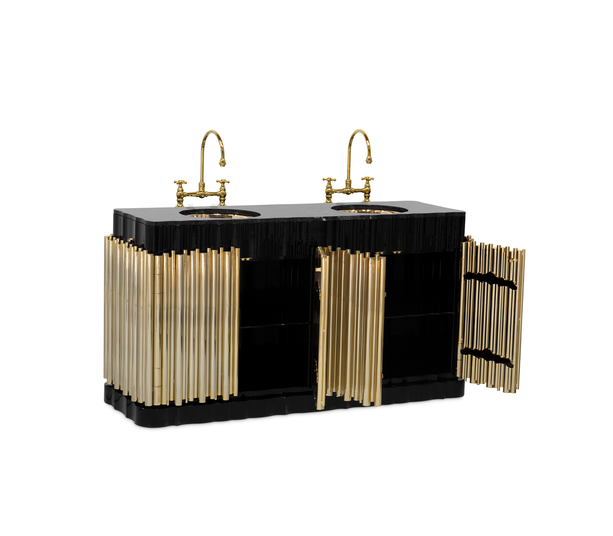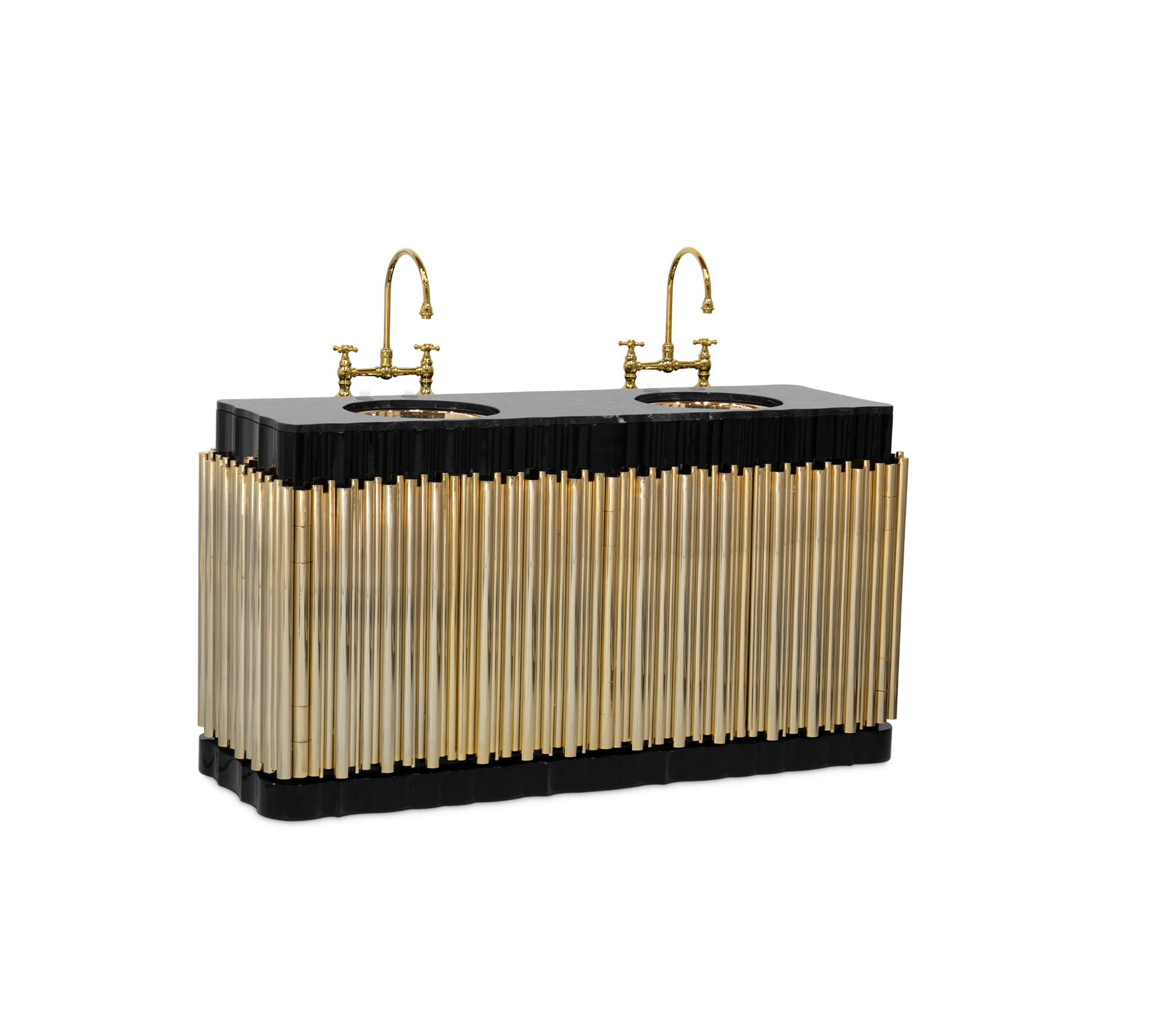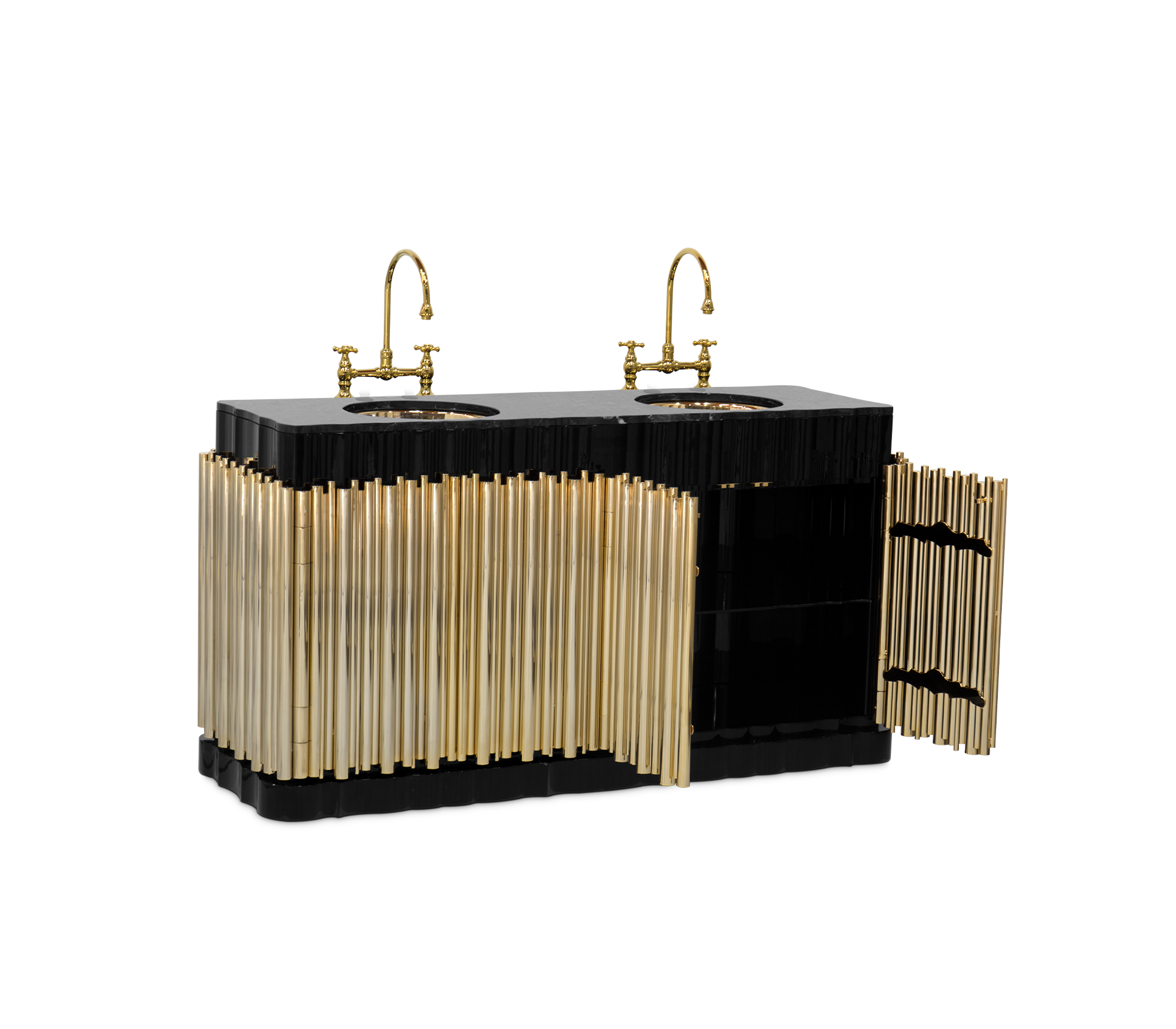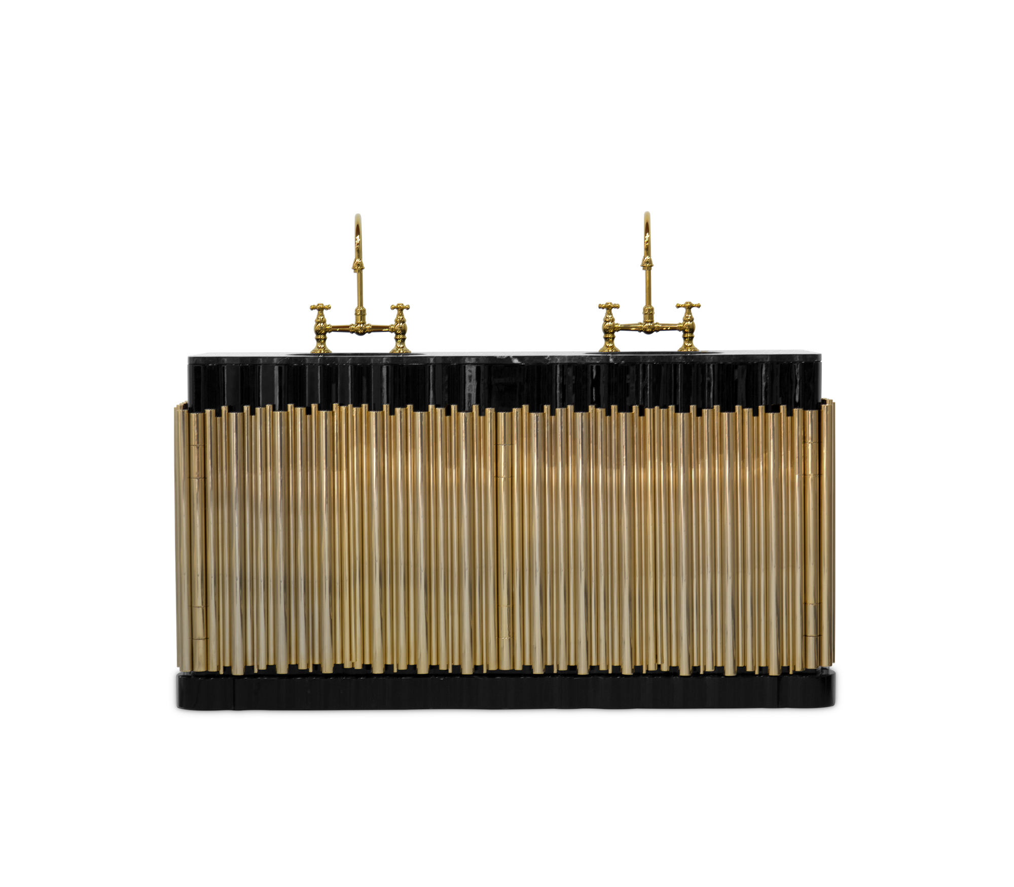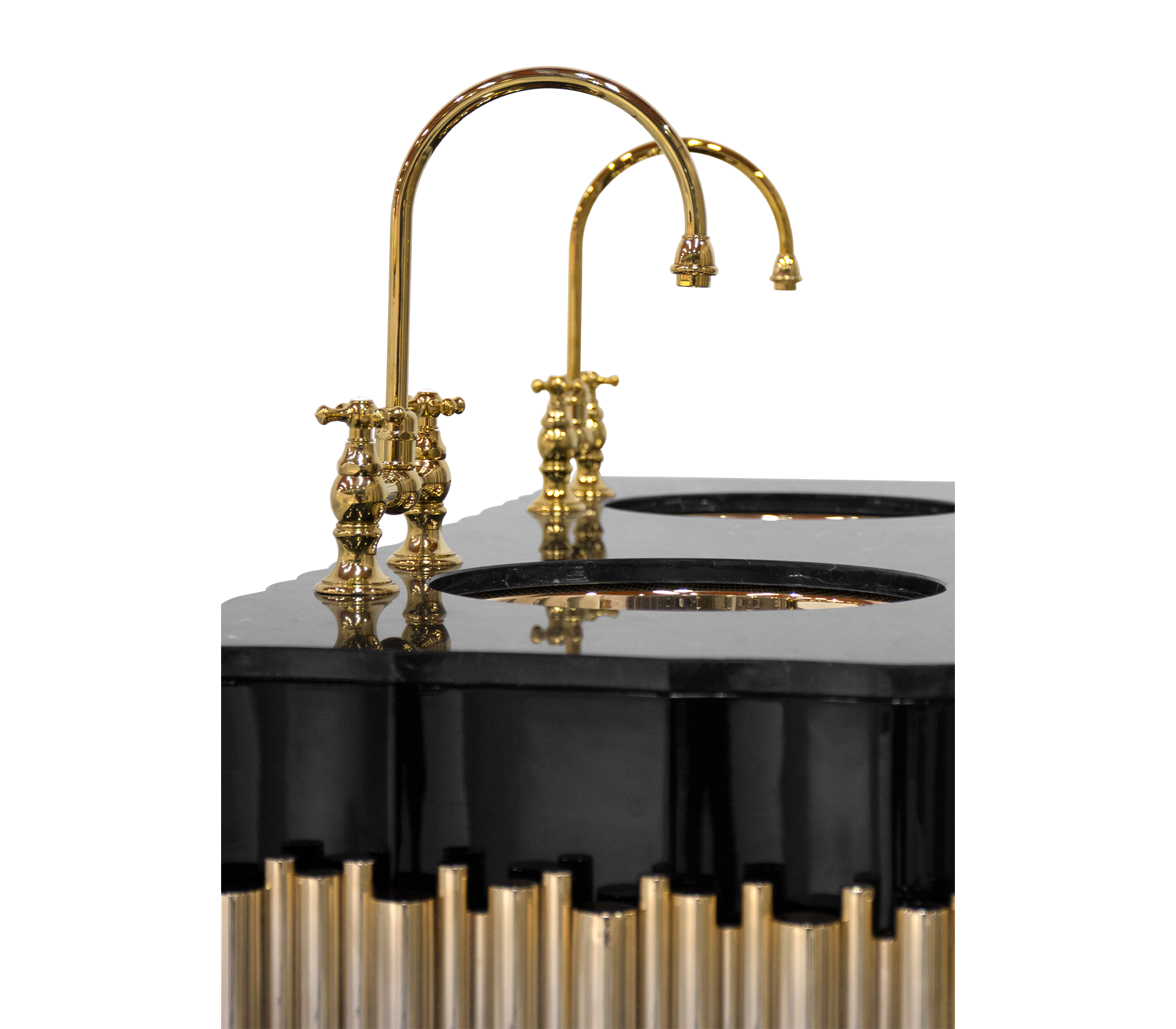 Structure: Wood, High Gloss black lacquered | Gold plated brass tubes, High gloss varnish; Top: Nero Marquina marble; Sink: Polished Brass, High Gloss Varnish; Water drainage: Wall