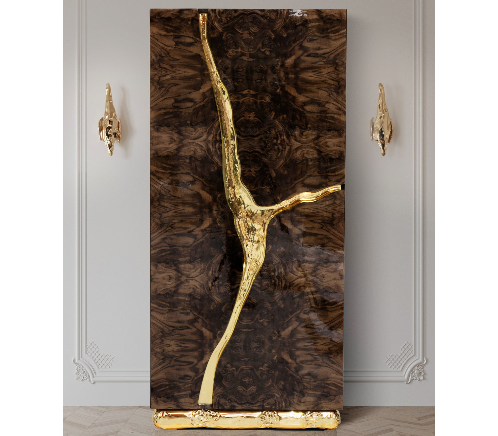 Coated exterior in ebony macassar veneer and gold finishes in hammered polished brass. Interior in Poplar Root & Polished Brass. Features 3 doors, 6 drawers, 6 glass shelves.