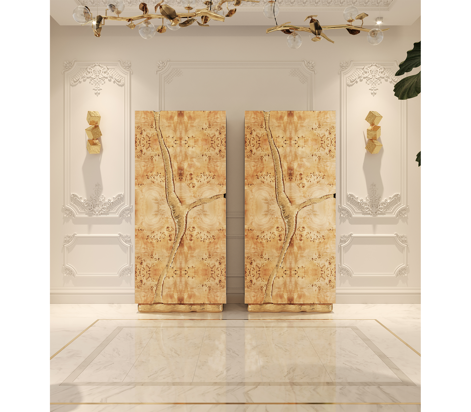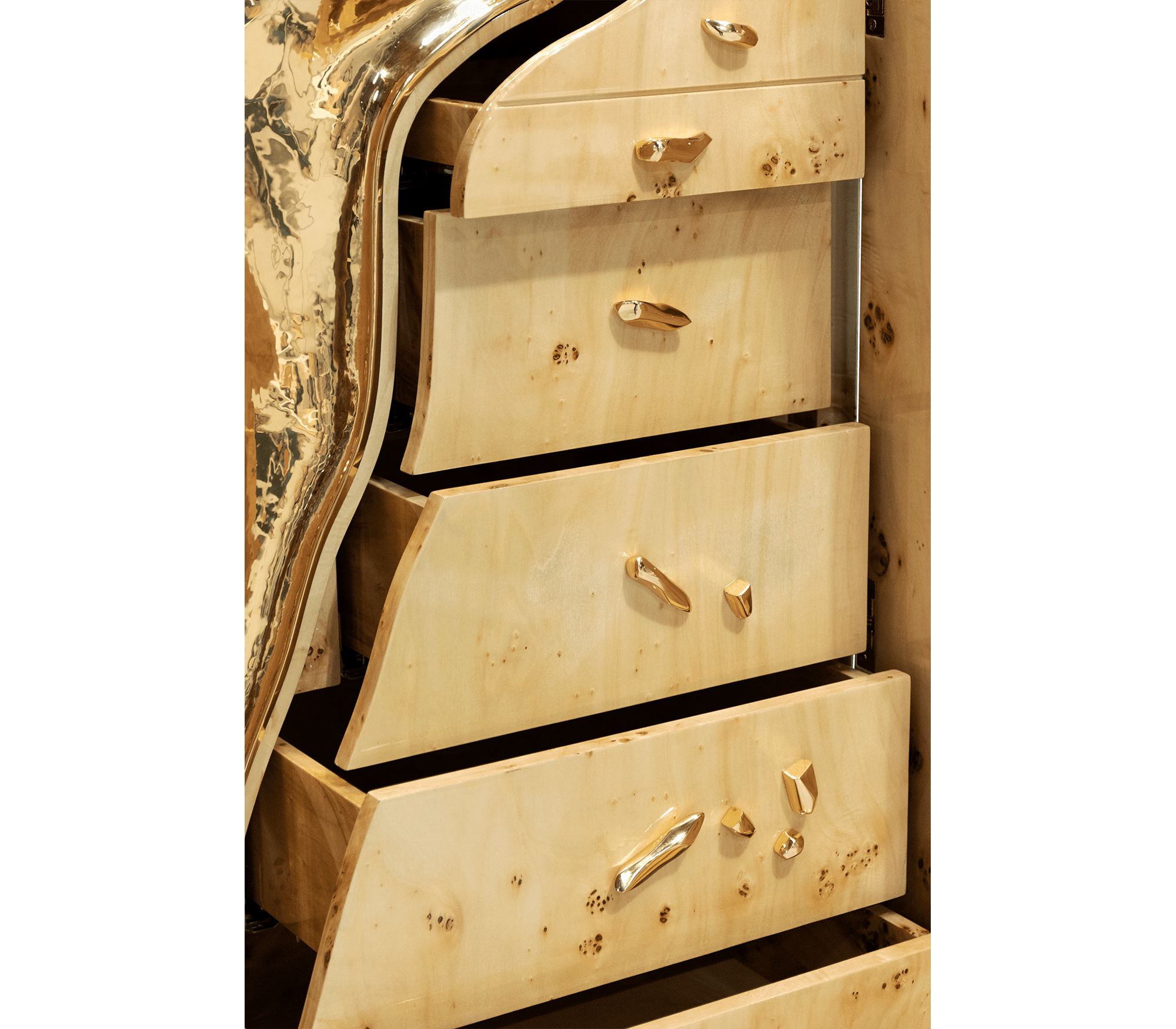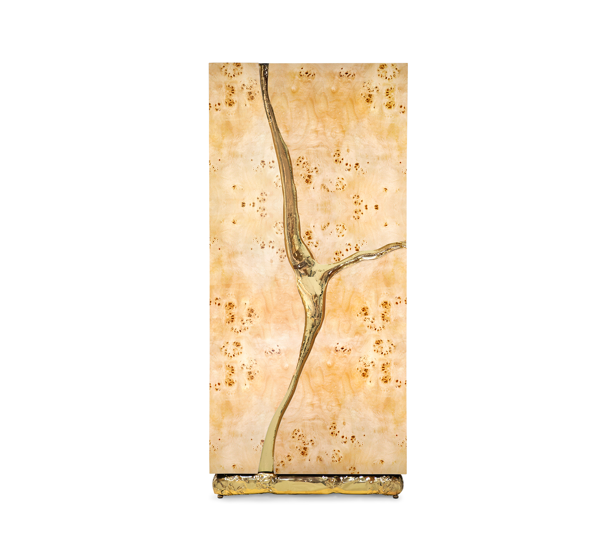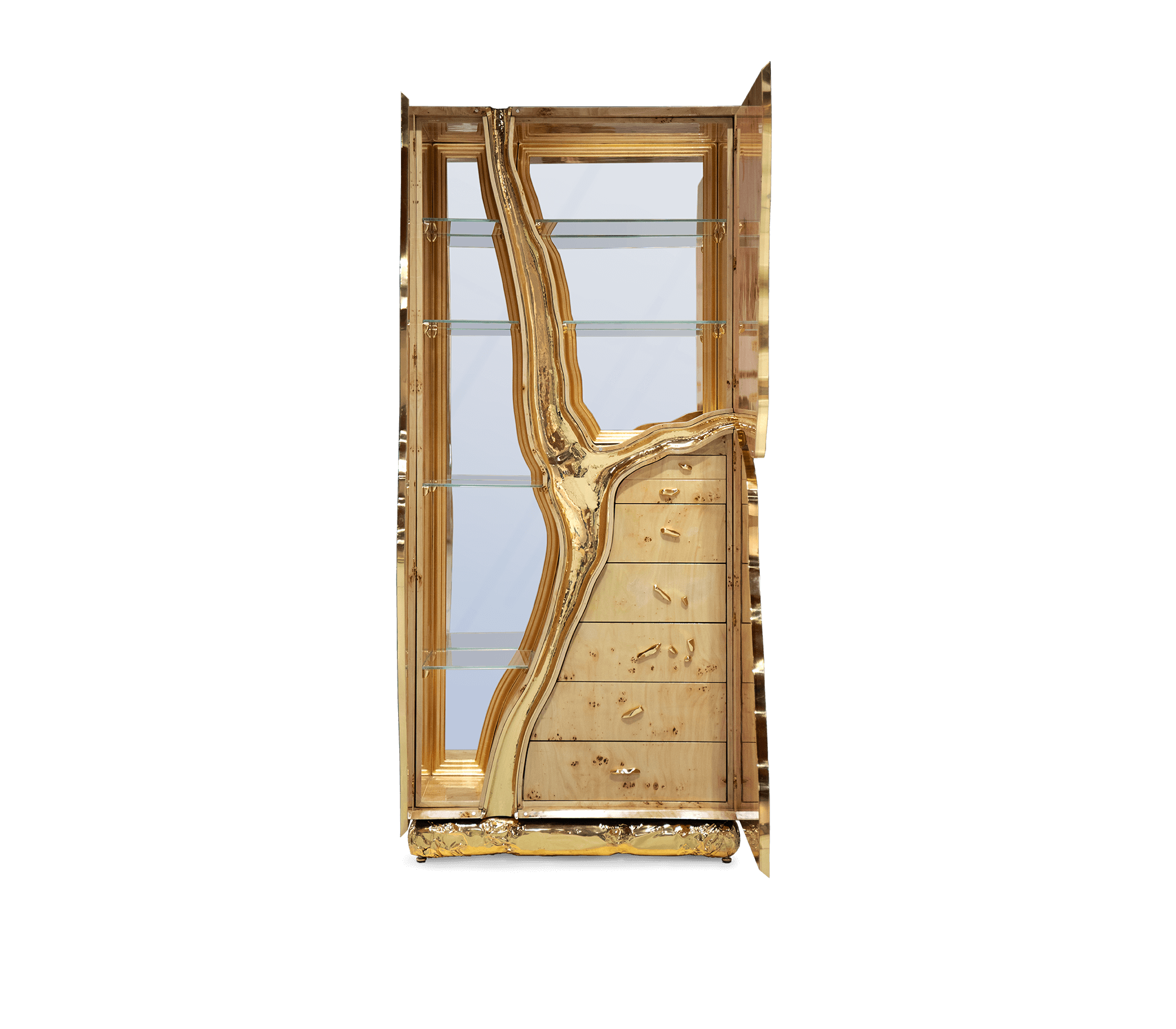 Coated exterior in poplar root veneer and gold finishes in hammered polished brass. Interior in Poplar Root & Polished Brass. Features 3 doors, 6 drawers, 6 glass shelves.