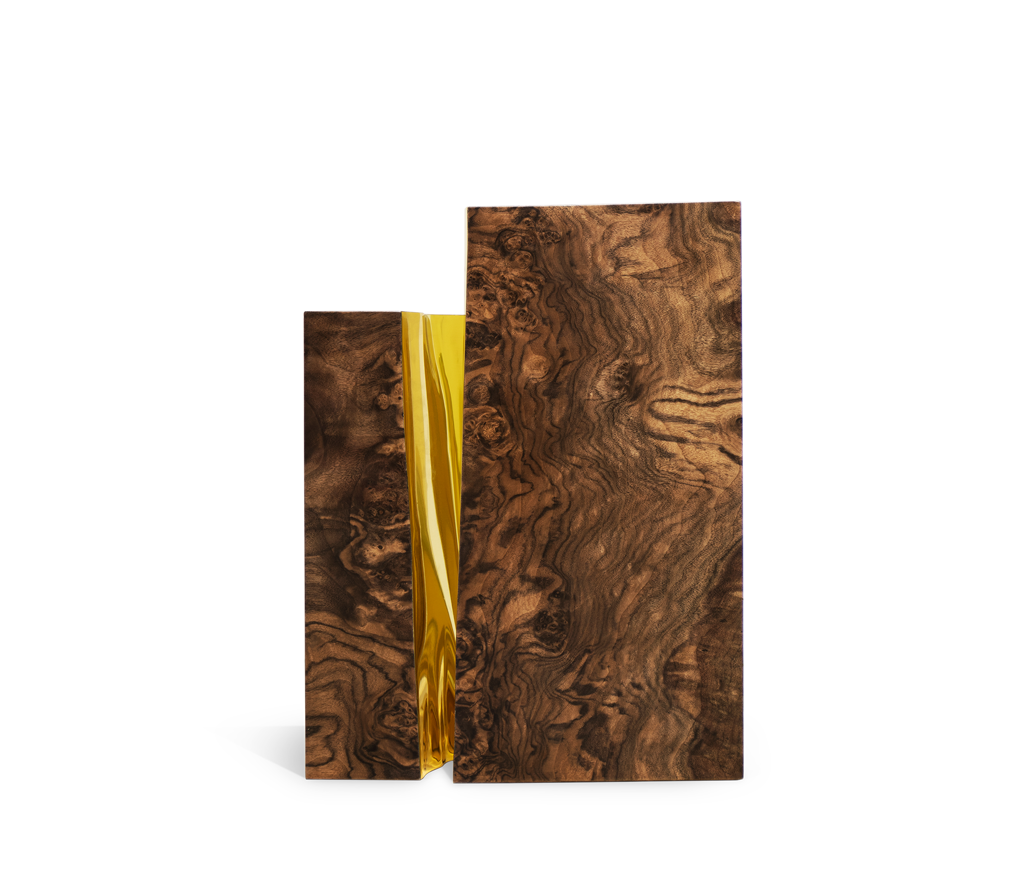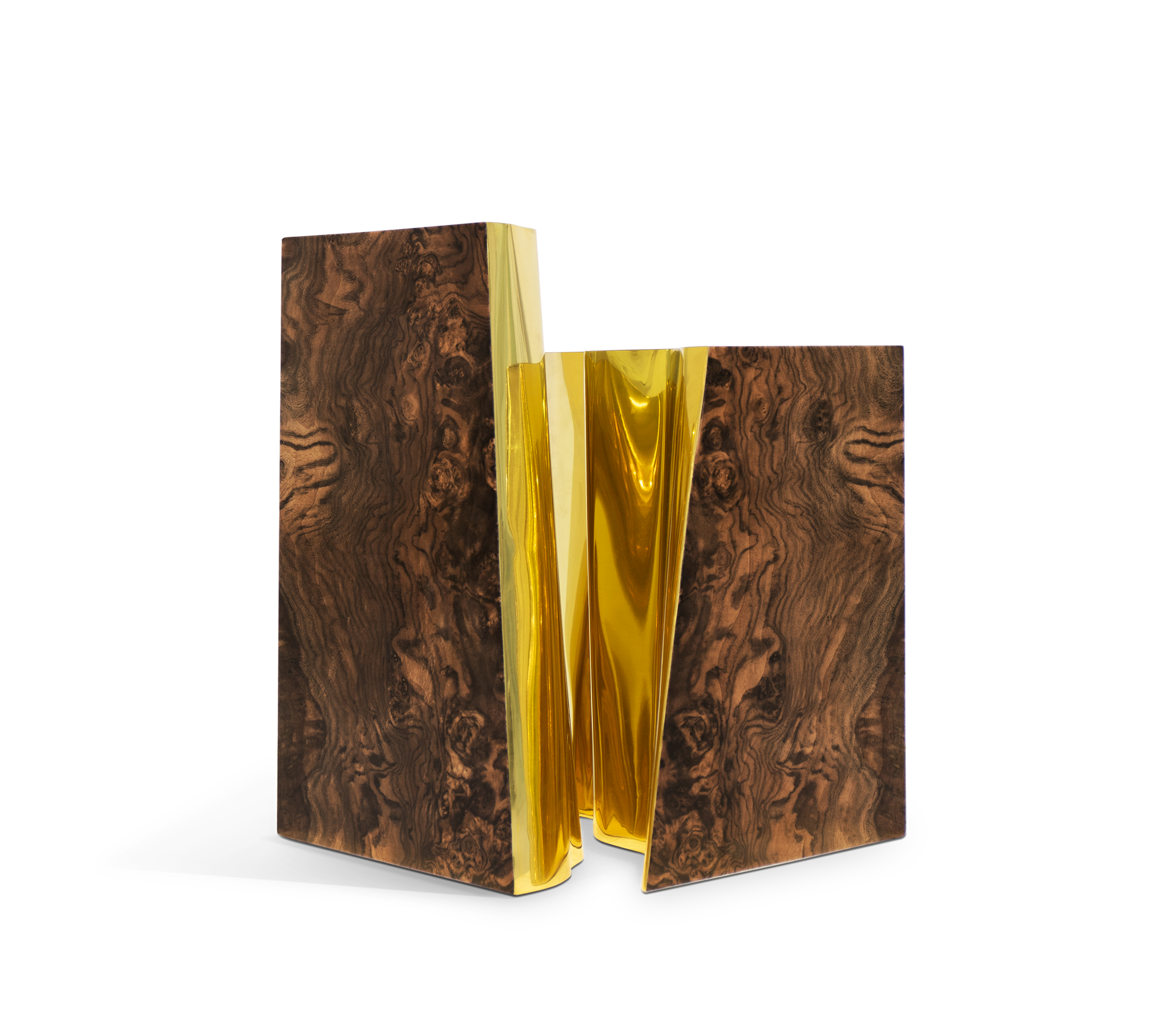 Lapiaz side table takes exceptional craftsmanship and design to a new realm. Its organic feature are achieved through the manual fitting of the polished brass sheet, and a warmth glossy walnut root veneer finish. The hammered brass details and the wood veneer convey both dynamics and elegance to bring a new contemporary verve into refined interiors.