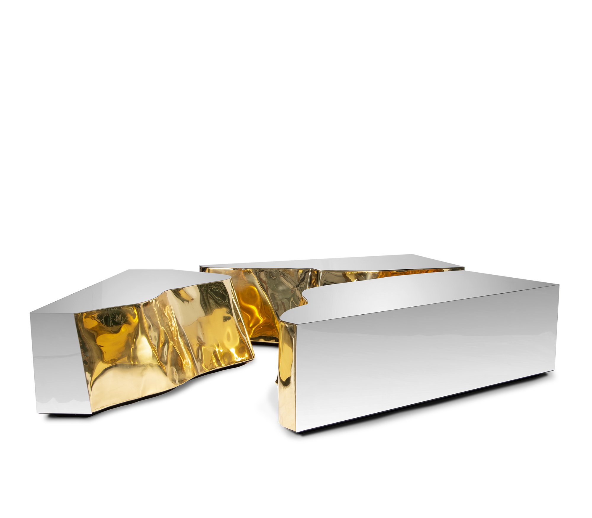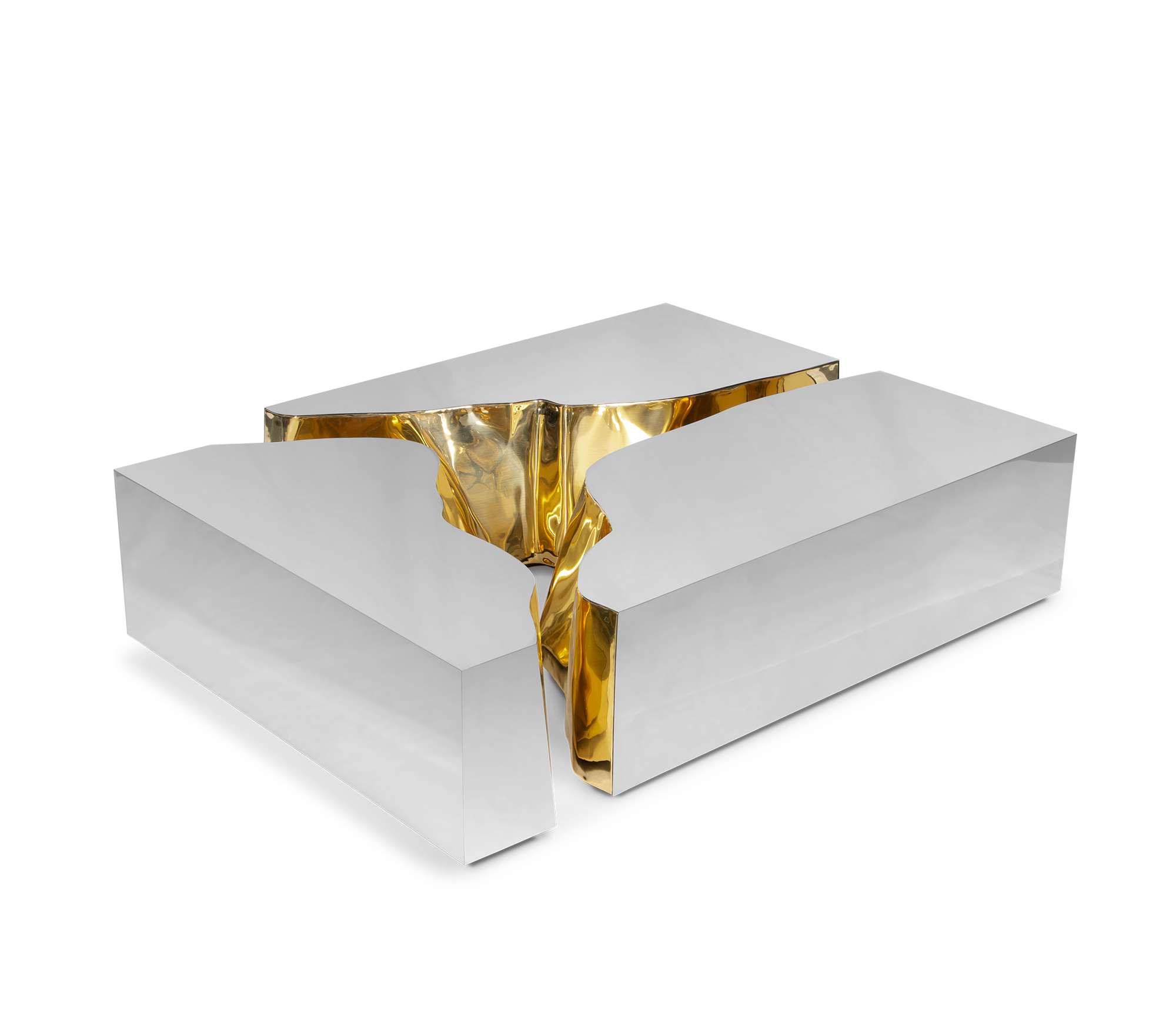 Lapiaz center table takes exceptional craftsmanship and design to a new realm. Finding beauty in the most unexpected places, this contemporary design piece is inspired by authentic karst formations. Its organic features are achieved through the manual fitting of the polished brass sheet, and a sharp exterior finished in polished stainless steel that portrays a perfect mirror. The hammered brass details and mirrored sides conveys both dynamics and elegance, a beautiful duality between power and refinement to bring a new contemporary verve into interior design. A functional artwork conceived in three modules for unexpected combinations. Born from cold and freshly cracked to showing off the world rich, golden interior.