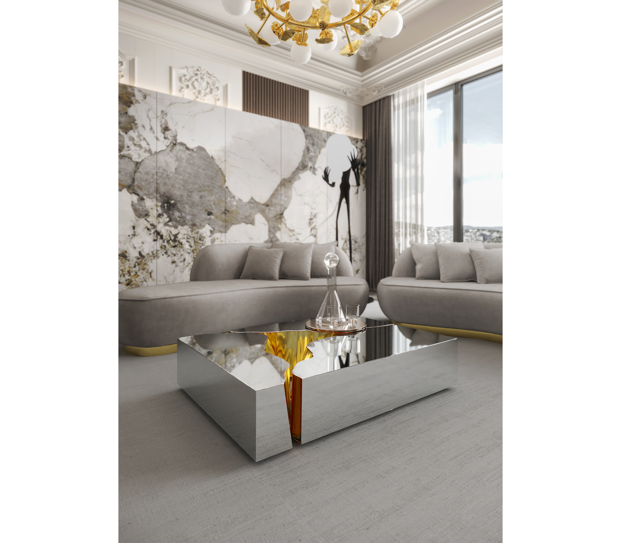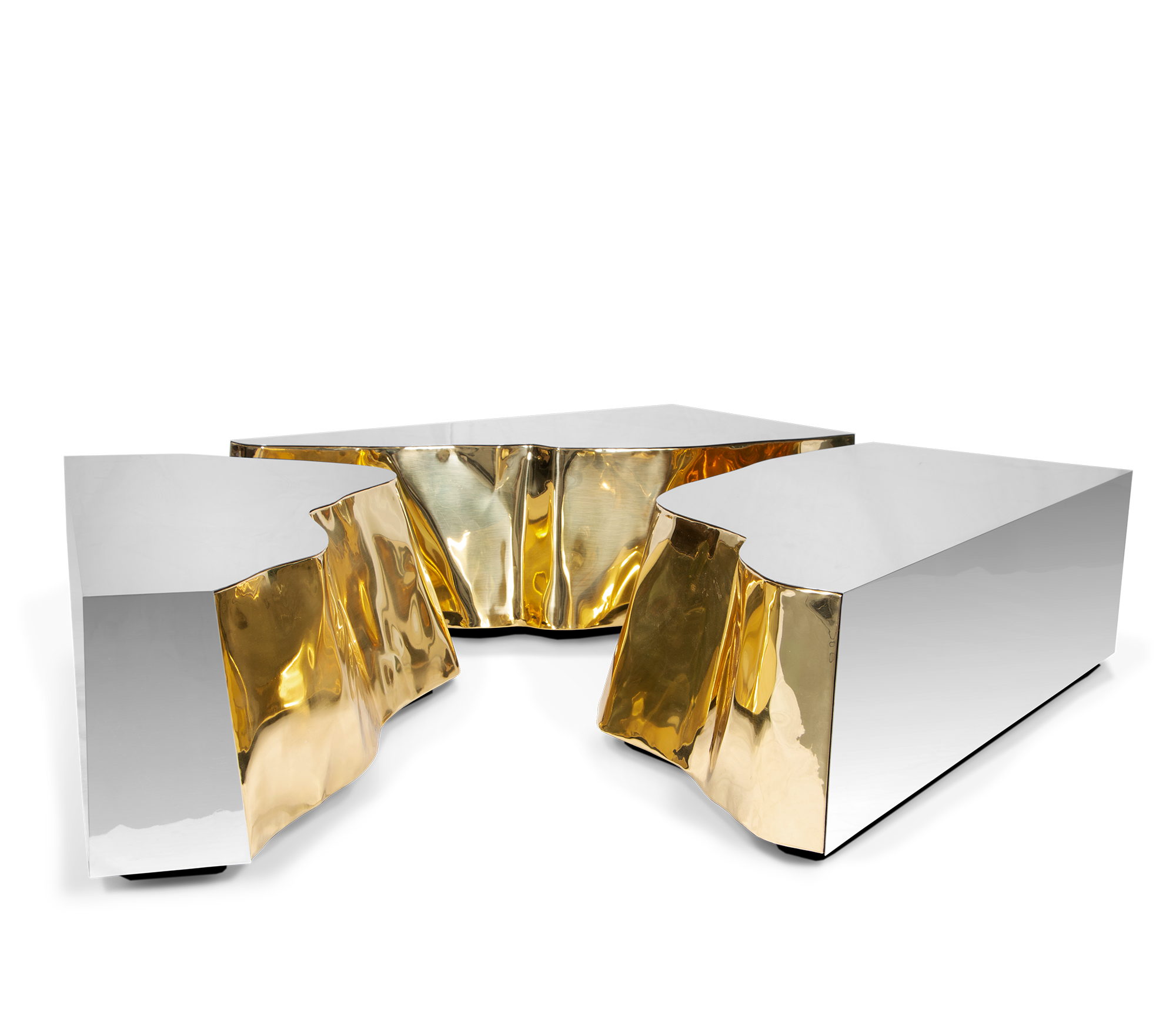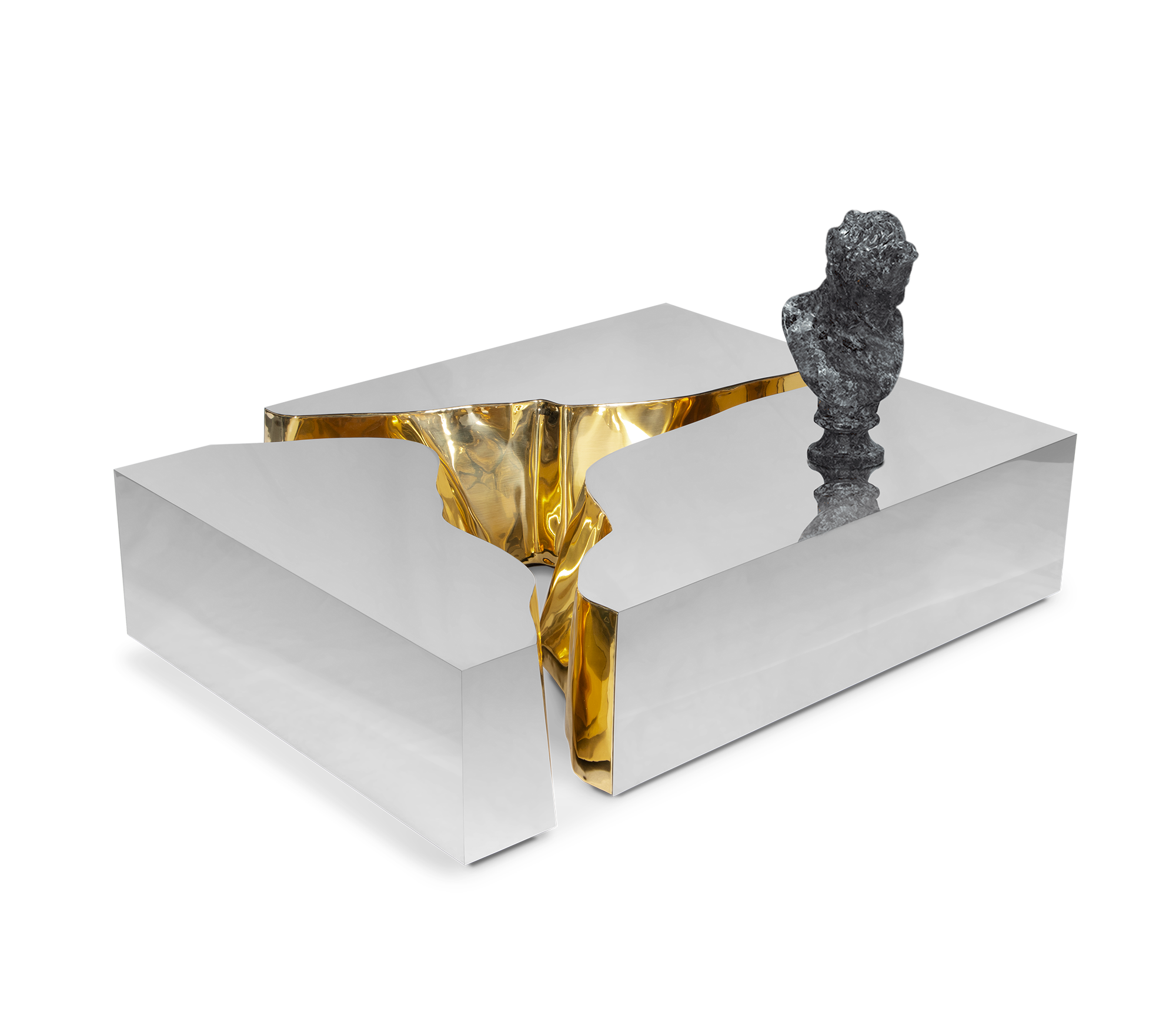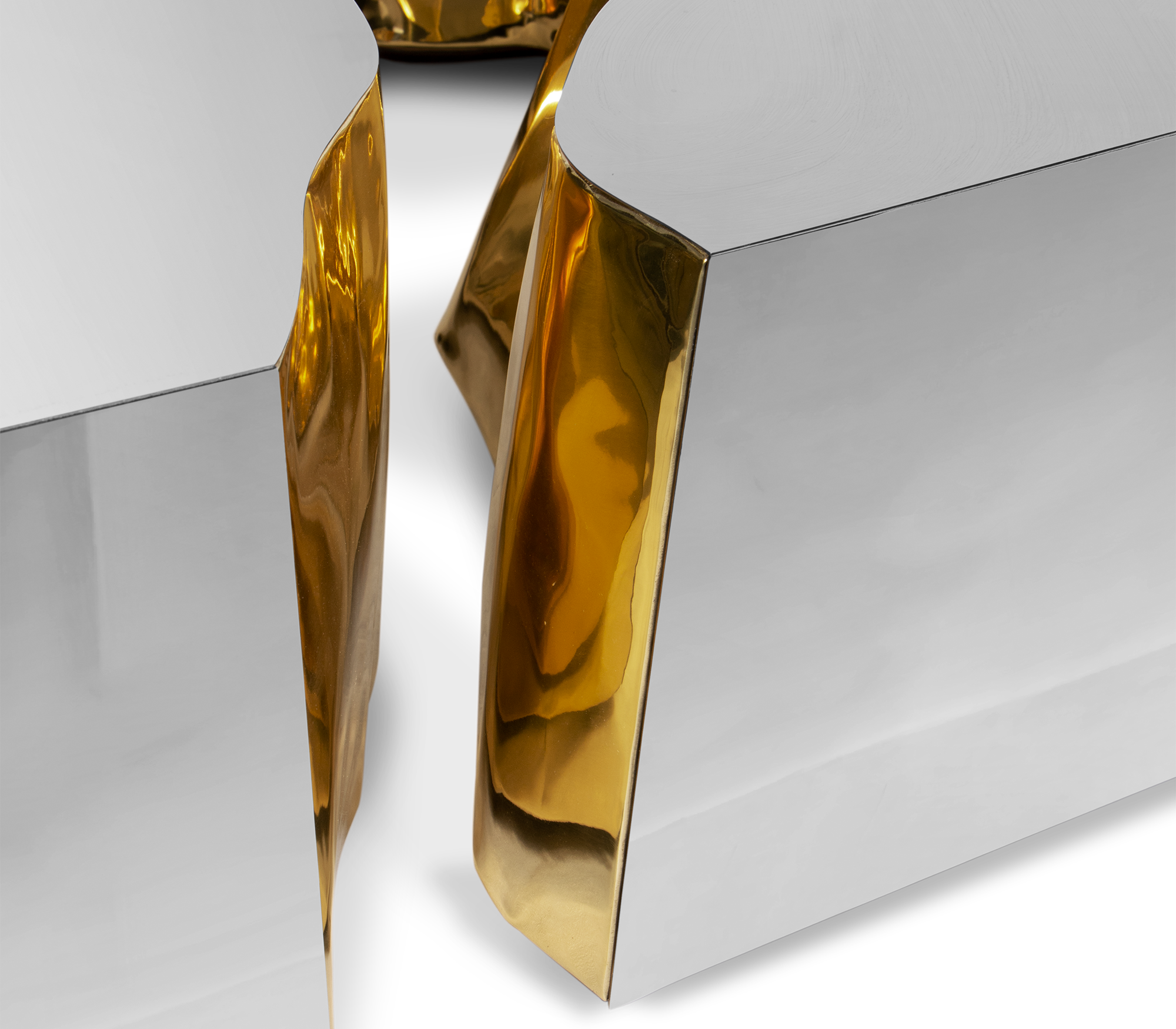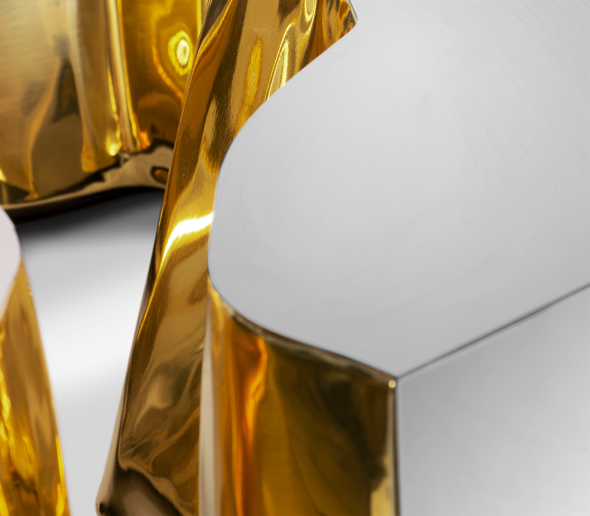 Its organic features are achieved through the manual fitting of the polished brass sheet, and a sharp exterior finished in polished stainless steel that portrays a perfect mirror. The hammered brass details and mirrored sides conveys both dynamics and elegance, a beautiful duality between power and refinement to bring a new contemporary verve into interior design.