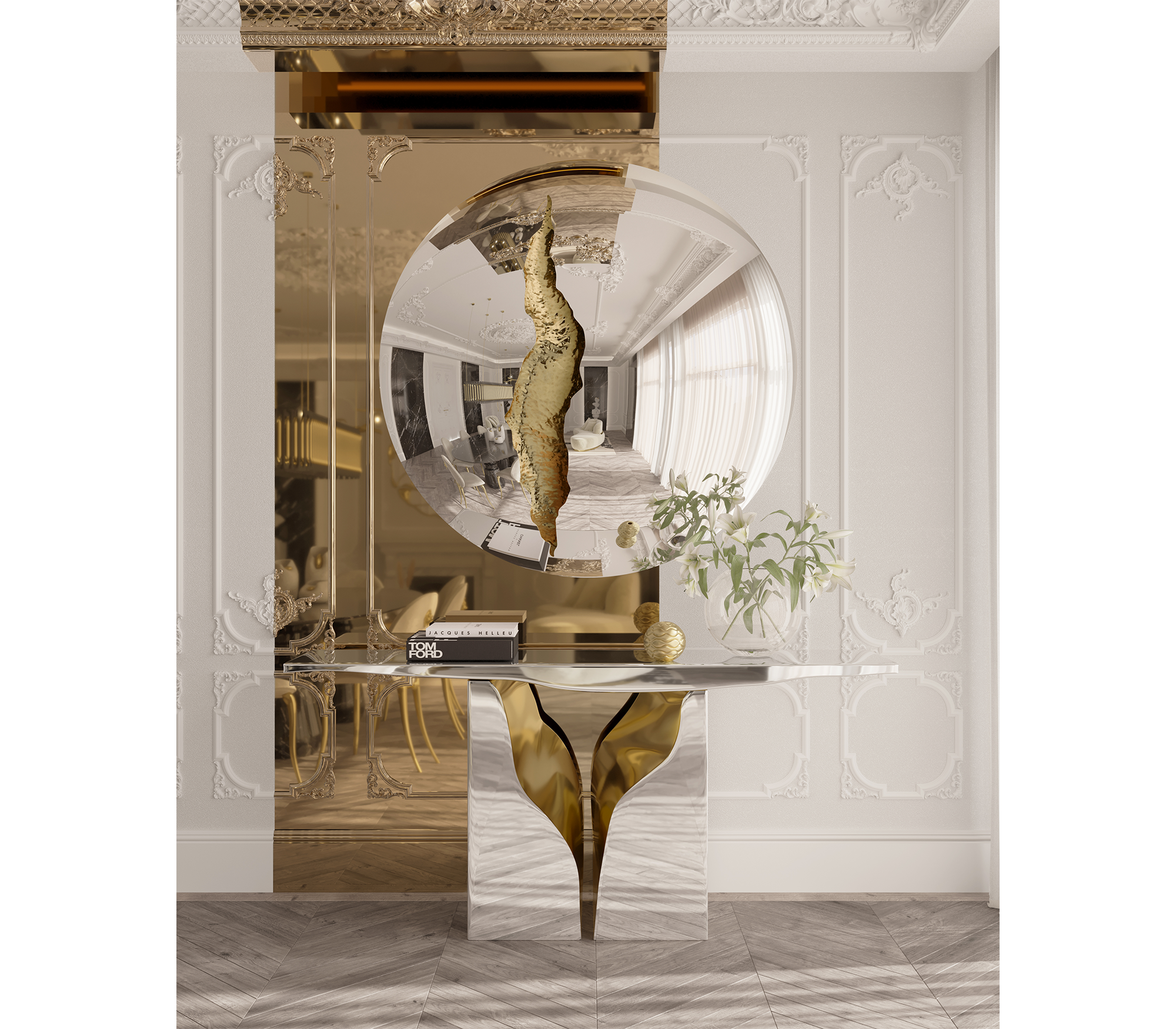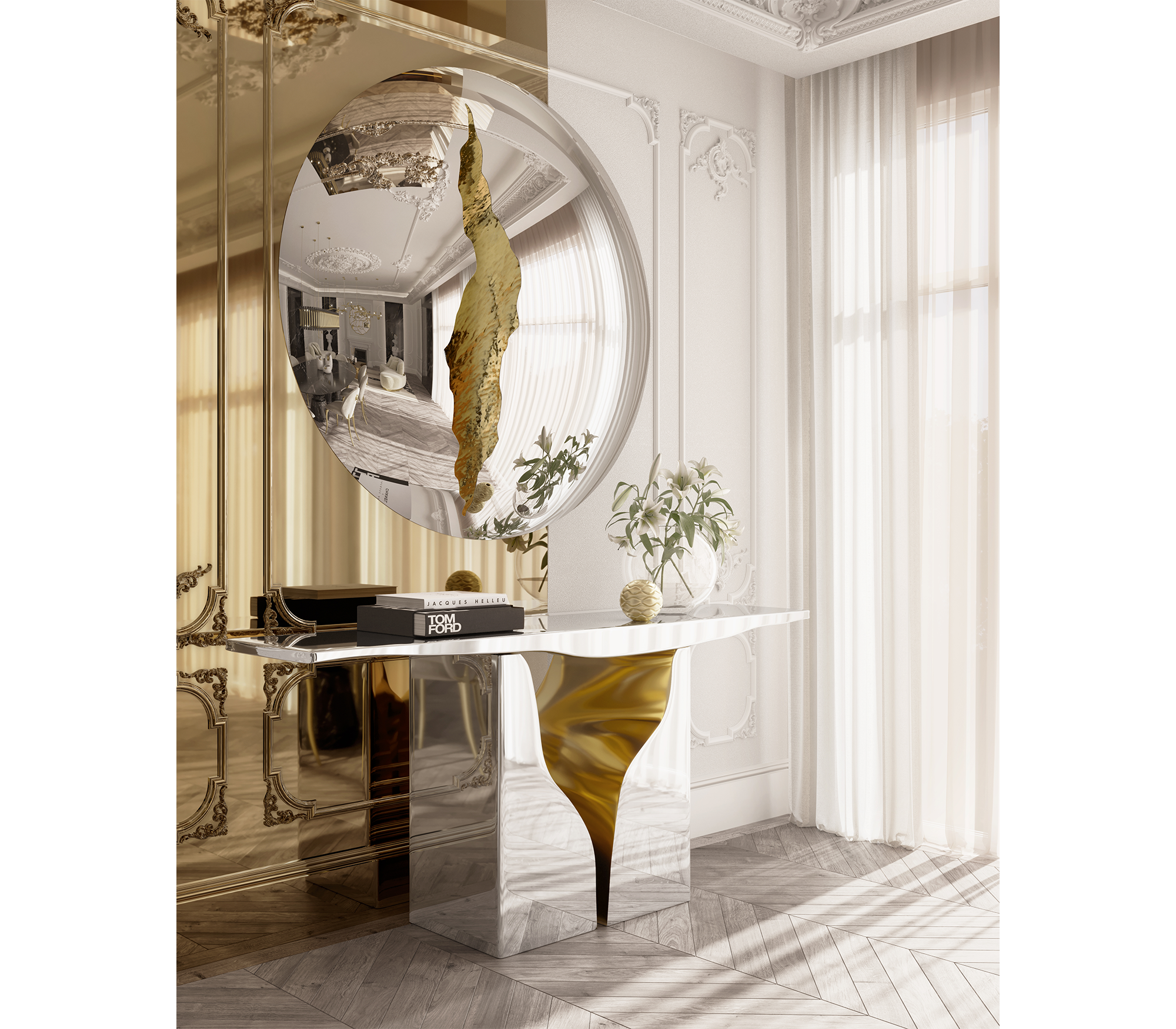 Its organic features are achieved through the manual fitting of the polished brass sheet, and a sharp exterior finished in polished stainless steel that portrays a perfect mirror. The hammered brass details and mirrored sides conveys both dynamics and elegance, a beautiful duality between power and refinement to bring a new contemporary verve into interior design.