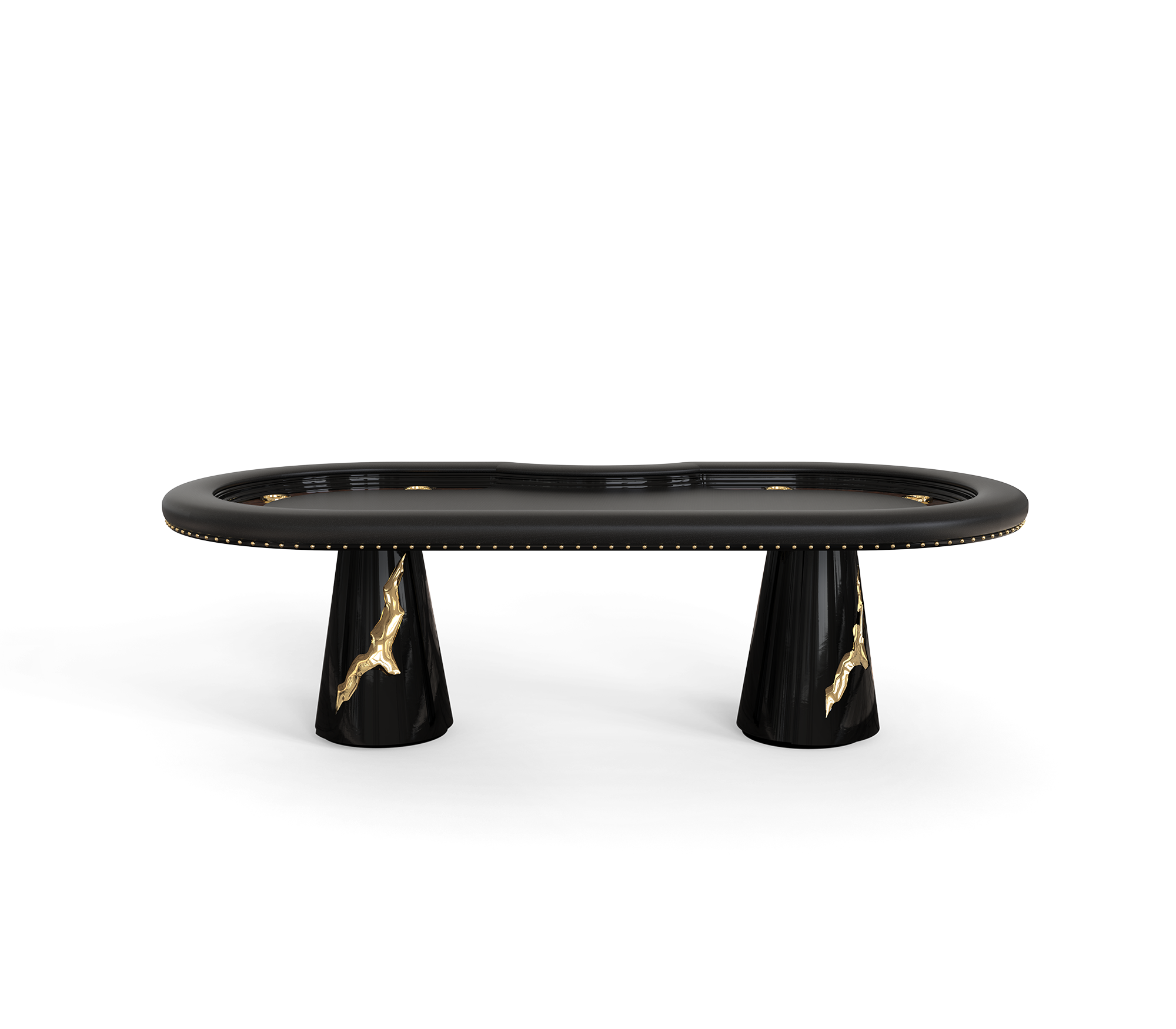 The Lapiaz poker table’s surface is made in wood, leather, and metal details.