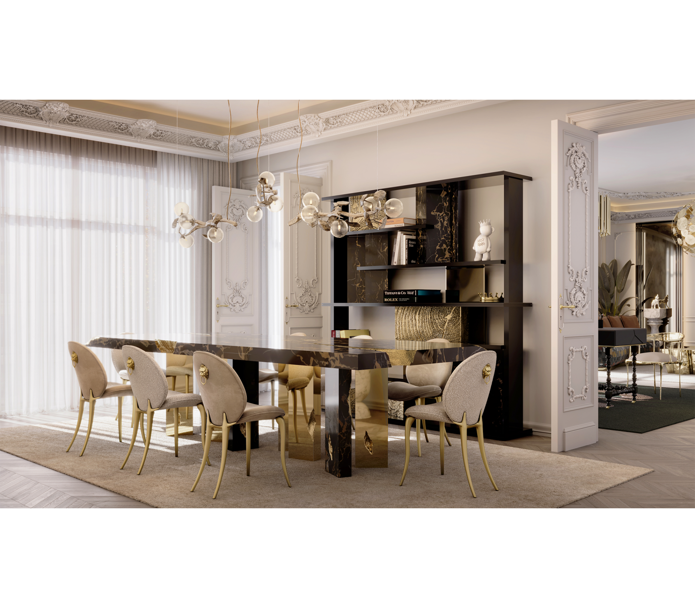 The contrast between organic stone and polished metal created a dialogue between past and future. This balance is essential in high-end interiors, where timelessness meets innovation. Boca do Lobo echoes this vision through bold designs that treat stone as art, not just material.