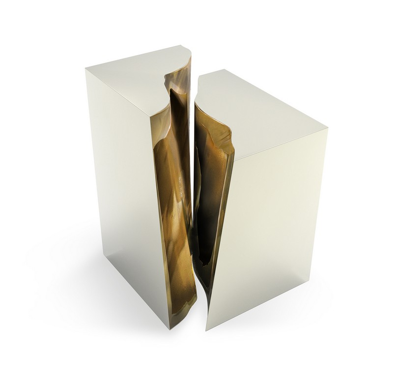The Lapiaz Side Table is a true luxury furniture piece, that boasts elegance and discerning taste. Inspired by the karst formations and cracks found on the surface of limestone and dolomite rocks, the Lapiaz features a minimalist geometric exterior surface, which by contrast is met with an organic and rich inside. Its reflective surface, made from clean-cut mirror, and brass sheets guarantee an inexplicable attraction, which fills any space with energy.