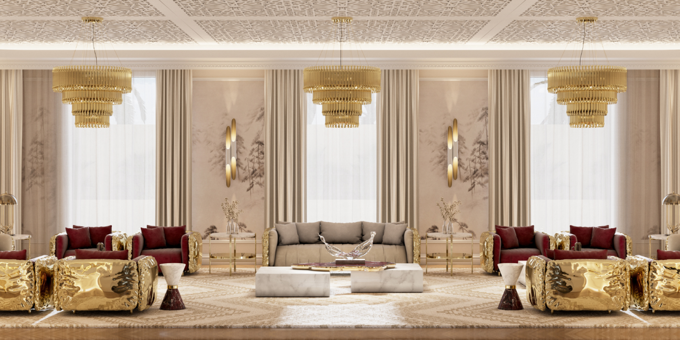 At the heart of the room, the Navarra Center Tables with matching bergamot tops provide architectural weight and visual intrigue, while a grand golden chandelier illuminates the space, creating a gallery of contemporary artistry that defines luxury living in Dubai.