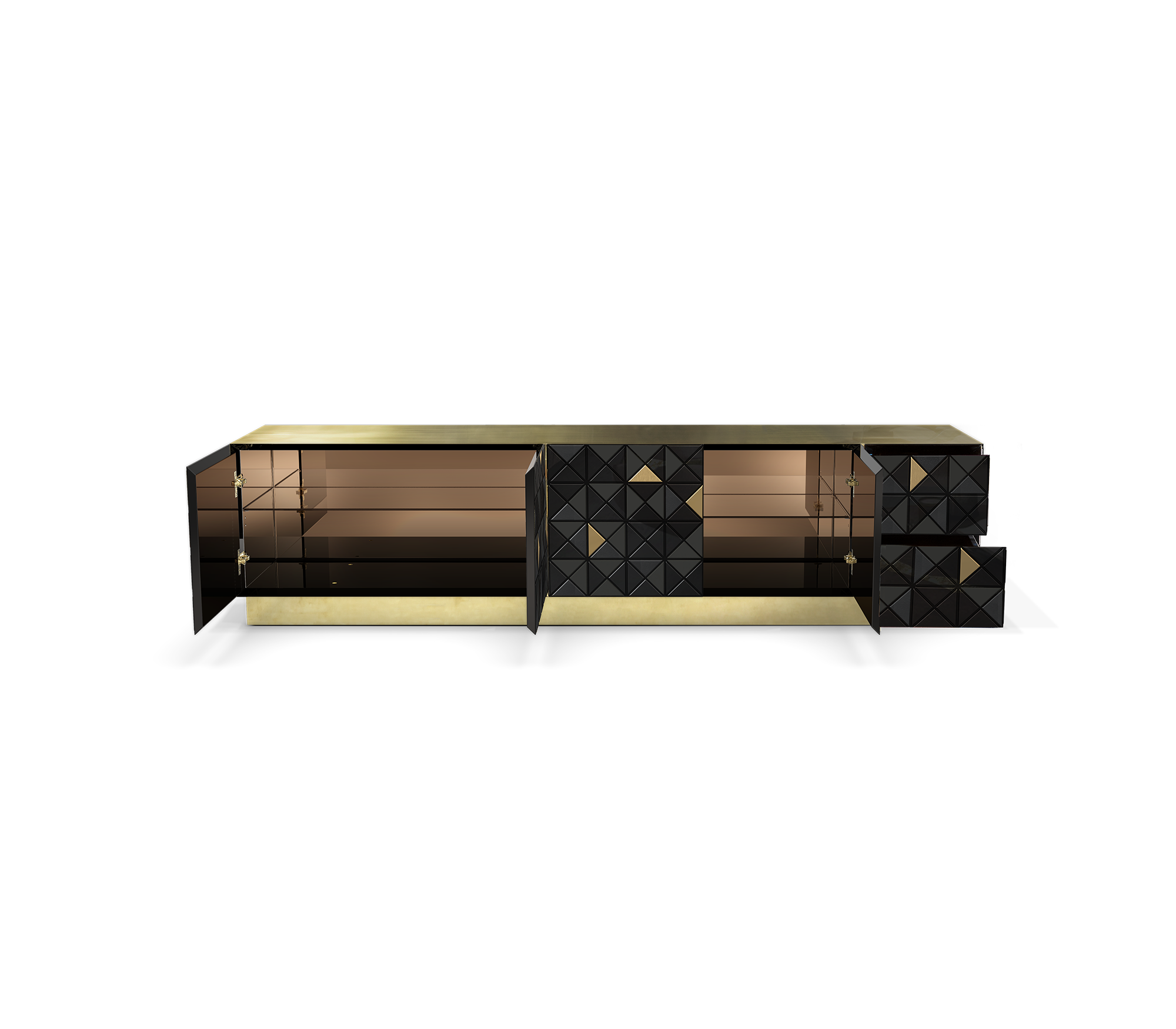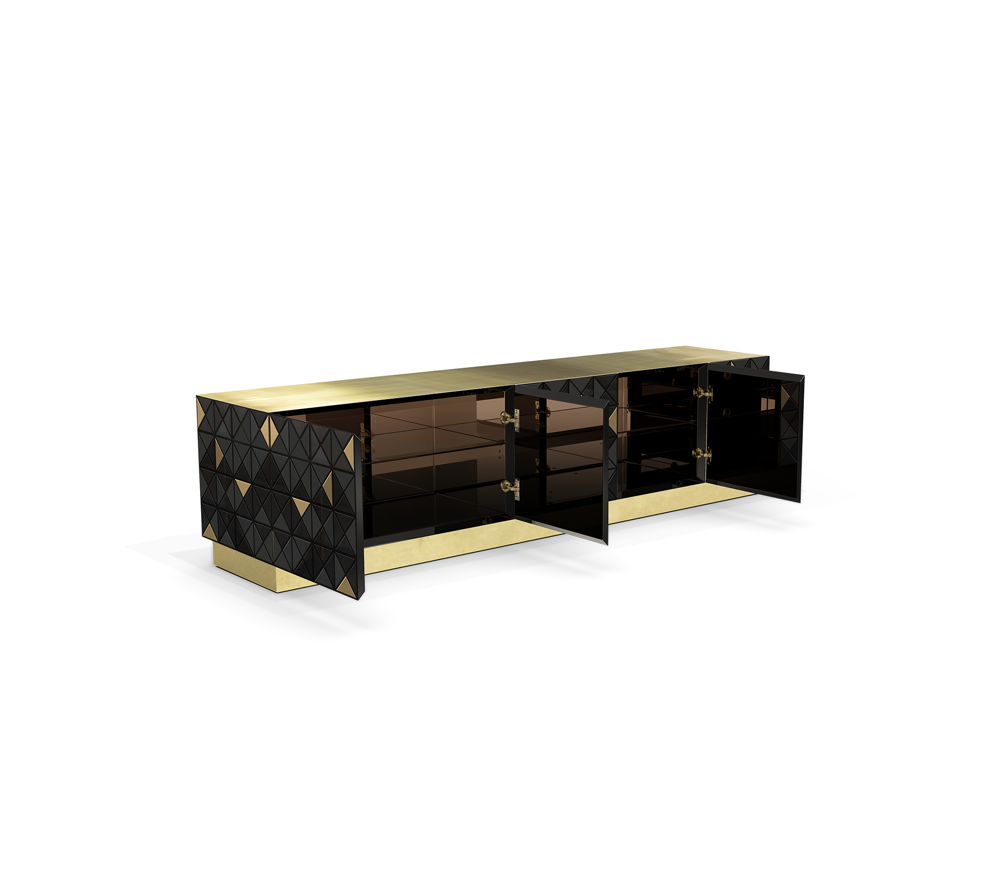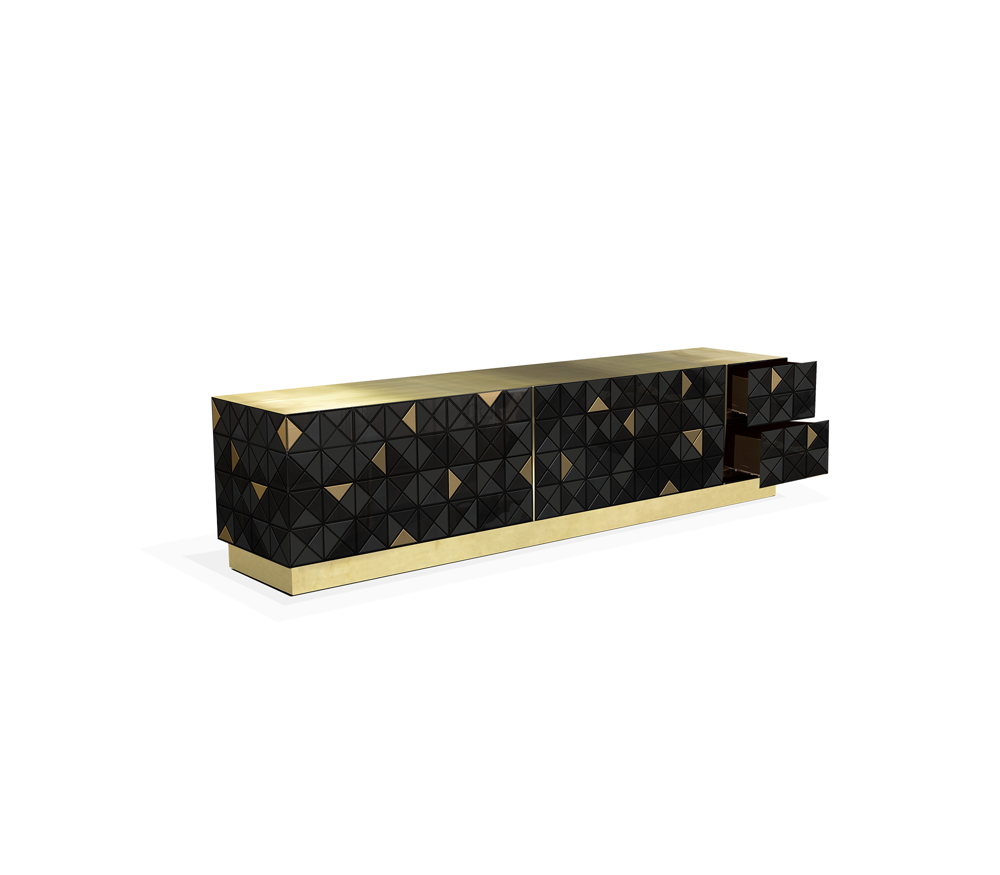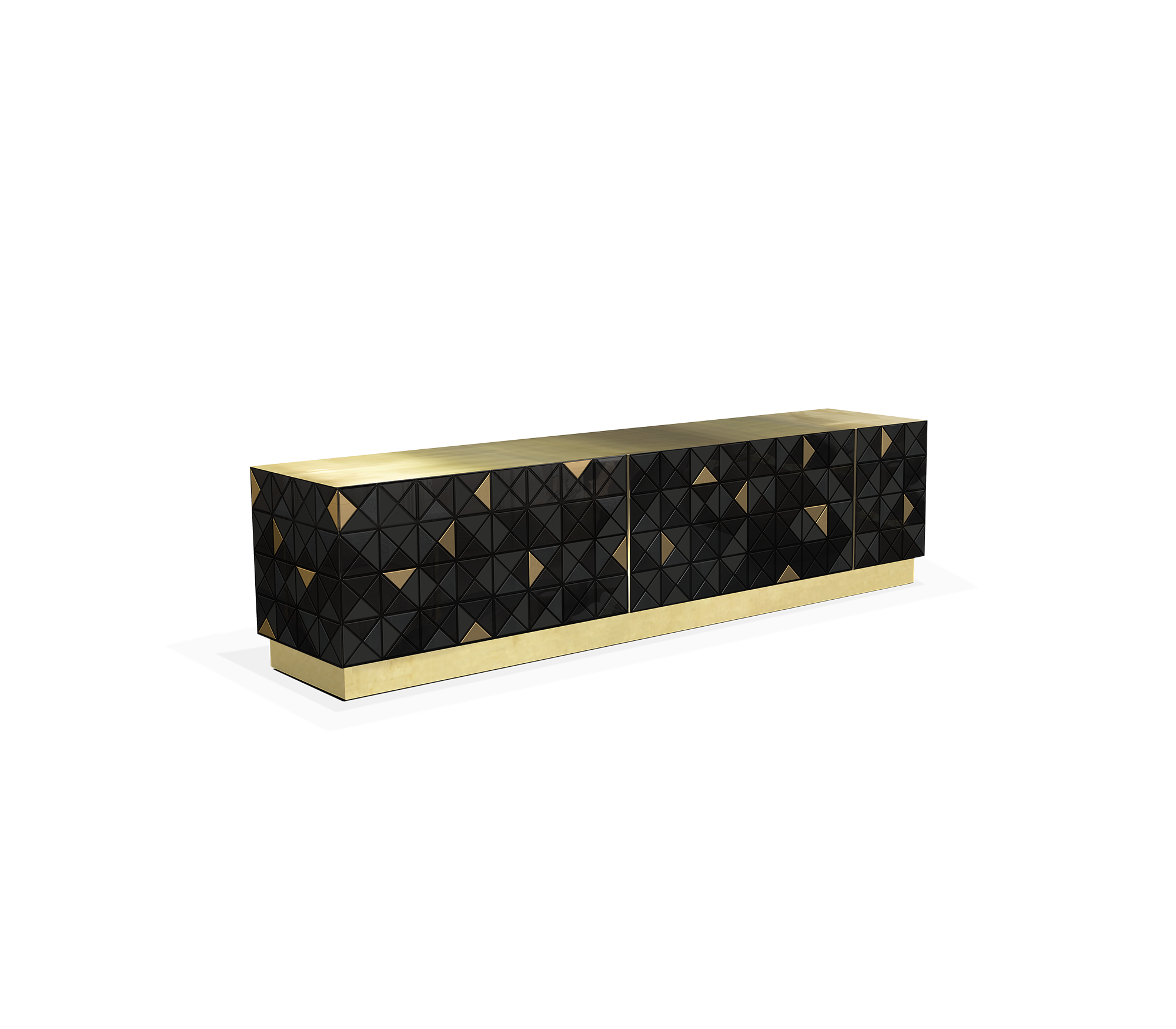 Iconic and unparalleled, the Pixel TV Cabinet introduces a groundbreaking work of pioneering design. This piece embodies the dedication and artistry of its creators, employing a variety of traditional production techniques to craft an avant-garde furniture piece that aligns with the digital age. Its playful character is evident in both shape and colour palette, challenging conventional design norms with the finest craftsmanship. Constructed with 1088 triangles, the upper part of the Pixel TV Cabinet plays with perception, combining exceptional materials with a black and gold metal composition to give the cabinet a unique and striking design, making it a perfect addition to modern living spaces.