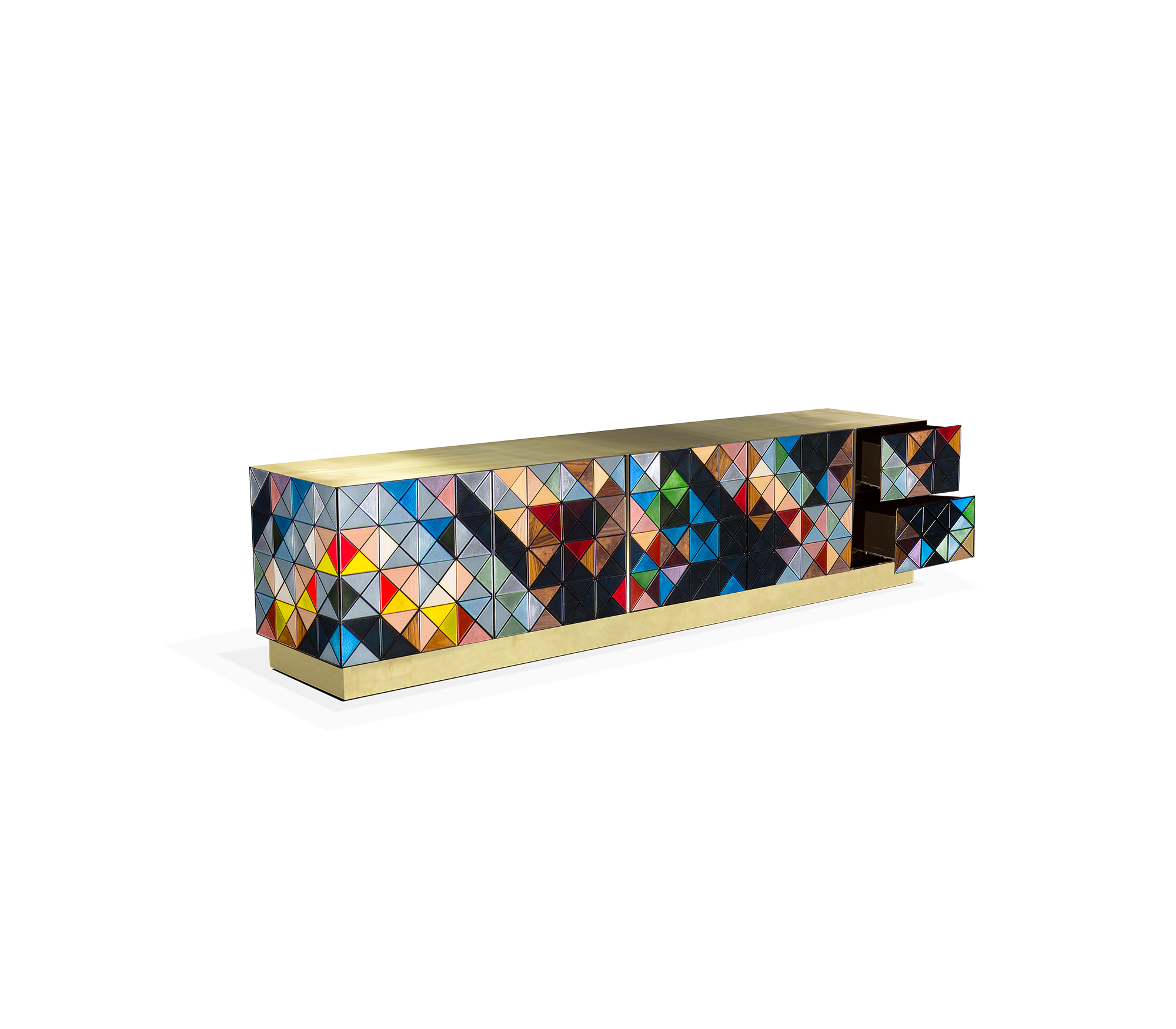 Iconic and unparalleled, the Pixel TV Cabinet introduces a groundbreaking work of pioneering design. This piece embodies the dedication and artistry of its creators, employing a variety of traditional production techniques to craft an avant-garde furniture piece that aligns with the digital age. Its playful character is evident in both shape and colour palette, challenging conventional design norms with the finest craftsmanship. Constructed with 1088 triangles, the upper part of the Pixel TV Cabinet plays with perception, combining exceptional materials with a metal-coloured composition to give the cabinet a unique and striking design, making it a perfect addition to modern living spaces.