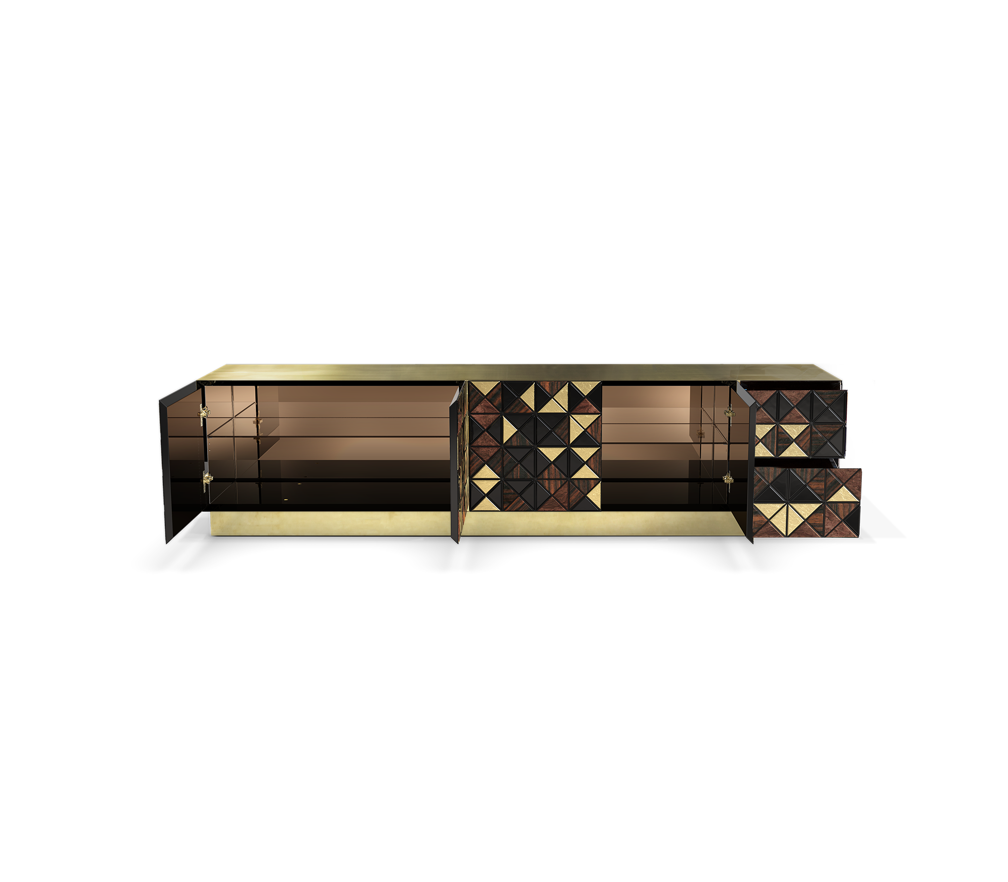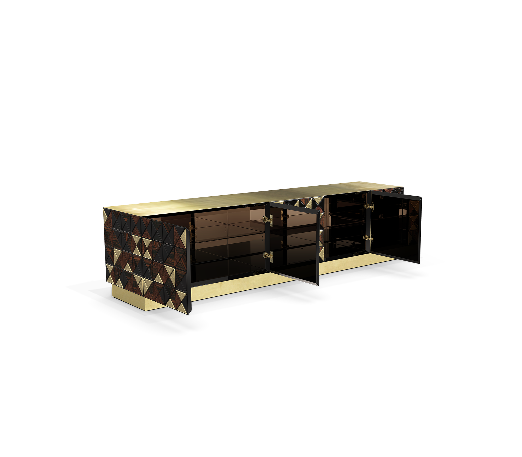 Made of wooden triangles in a diversity of wood and finishes: walnut root veneer, ebony veneer, gold leaf, and black lacquer. Behind its four doors, a bronze glass shelf and bronze mirror. Top in brushed brass with satin finish and base in polished brass.