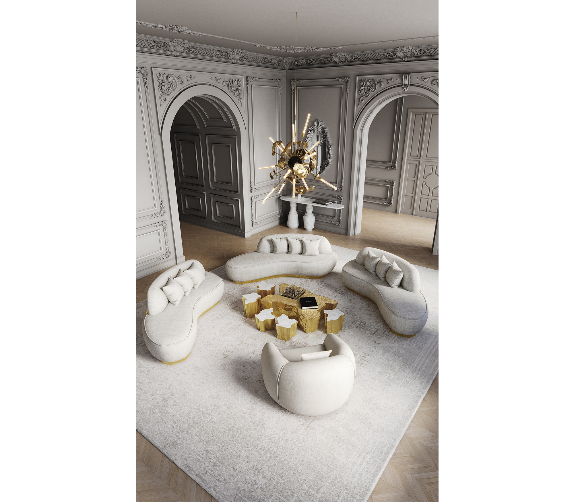 The mystic behind the name inspires Eden. A slice of the tree of life that fell from the Garden of Eden, this accent coffee table set awakens desire and curiosity with its intriguing cut. Born from master artisans and the ancient technique of polished cast brass, these statement design pieces incorporate nature-inspired design with industrious welding techniques, being manually assembled, making each piece unique. With delicate lines and bold details, a manually engraved top exposes the heart of a golden tree, boasting a sinuous gold plated base that stood the test of time. It is available in groups of 7, 8 or 14 pieces, with different heights, for unexpected combinations. The remarkable and already time-honoured piece, Eden coffee table series combine with both contemporary and modern design styles, classy rooms waiting for superior craftsmanship and iconic design.