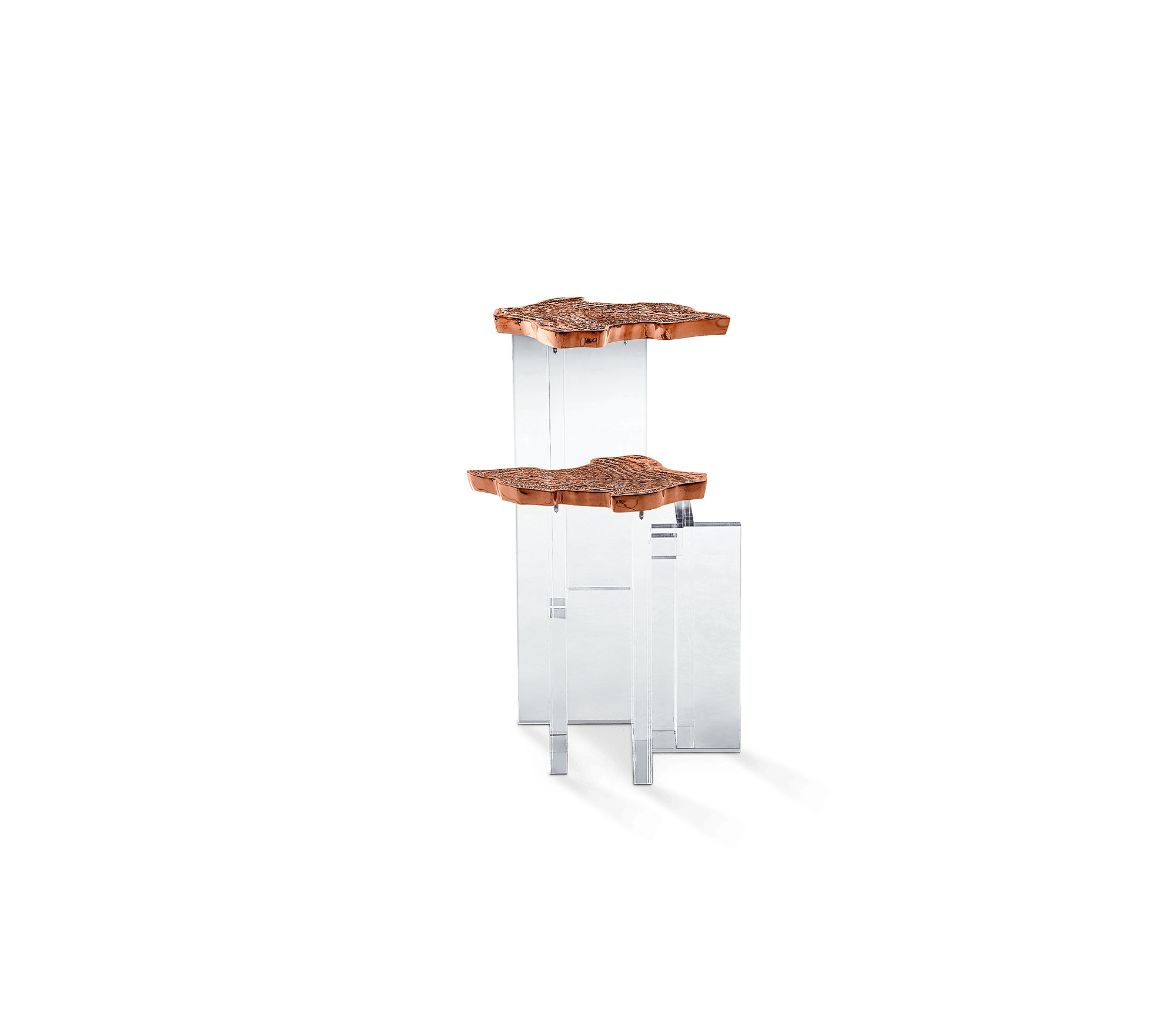 This sophisticated side table has an acrylic base, and a cast brass table top, with a unique surface texture.