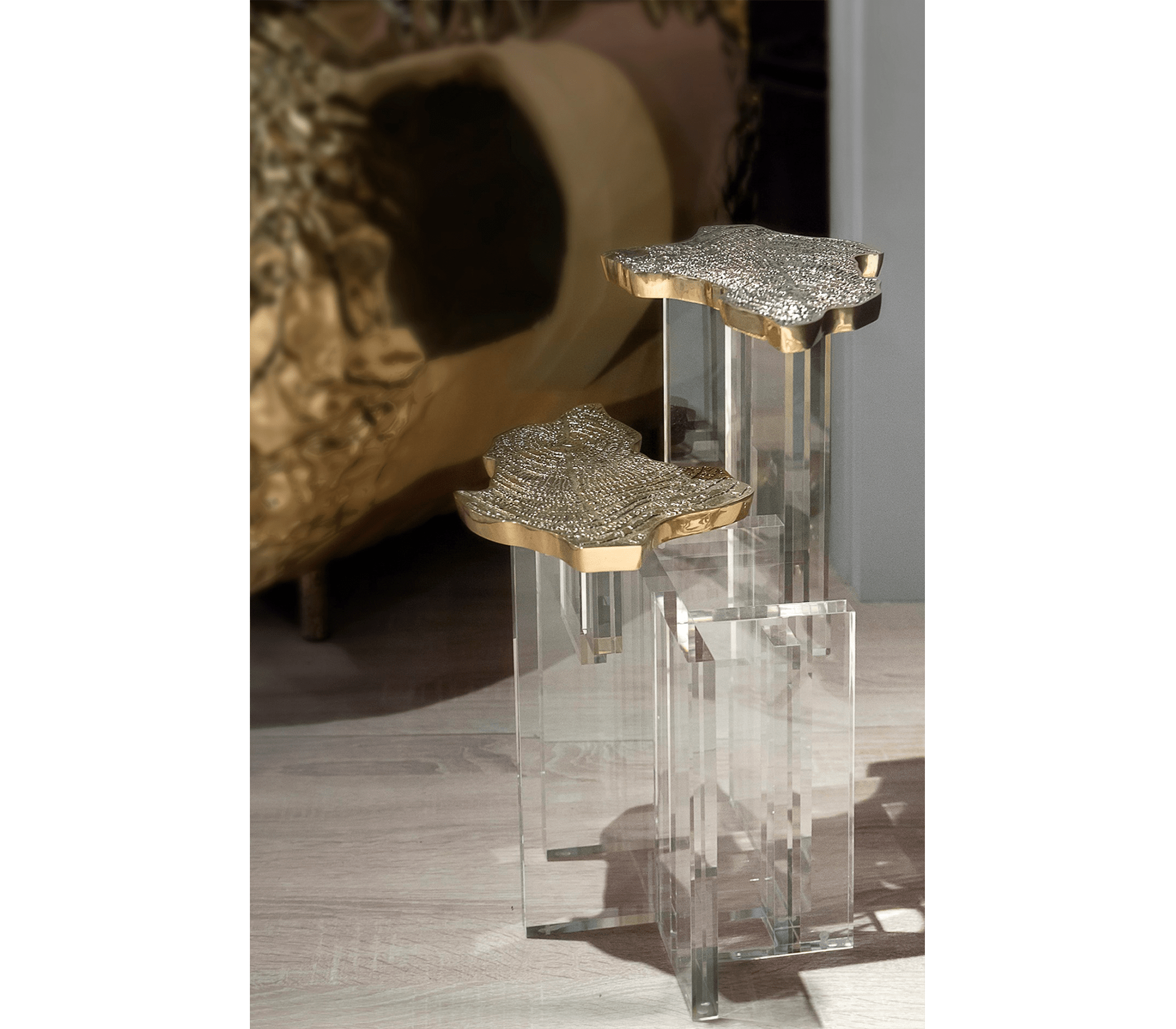 Monet is a tribute to the renowned French painter behind the Impressionism movement, and artwork that turns into a contemporary side table with a modern design twist. Innovatively depicting nature, the Water Lillies series are gently brought to life in an elegant side table with a gold surface made from cast brass with a unique textured finish. Featuring both contrasting shapes and materials, as the unconventional compositions of the artist, the contemporary side table is supported by a geometric acrylic base, allowing to capture natural light. An immersive exceptional object, the Monet side table is perfect for cutting-edge living rooms.