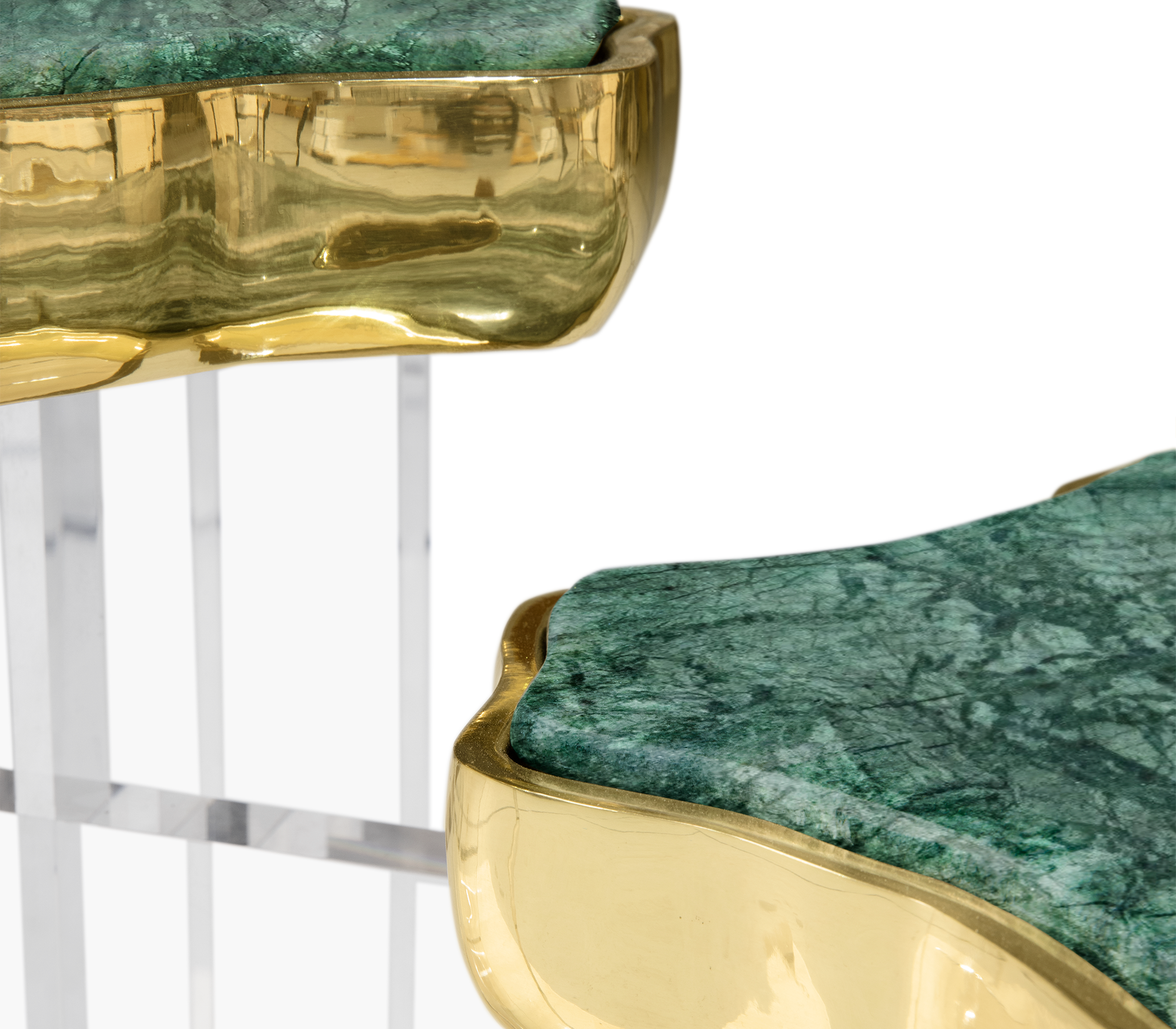 Depicting nature in an innovative way, the Water Lillies series are gently brought to life in an elegant coffee table with gold surface made from cast brass with a unique textured finish. Featuring both contrasting shapes and materials, as the unconventional compositions of the artist, the contemporary coffee table is supported by a geometric acrylic base, allowing to capture natural light. An immersive exceptional objet, the Monet center table is perfect for cutting-edge living rooms.