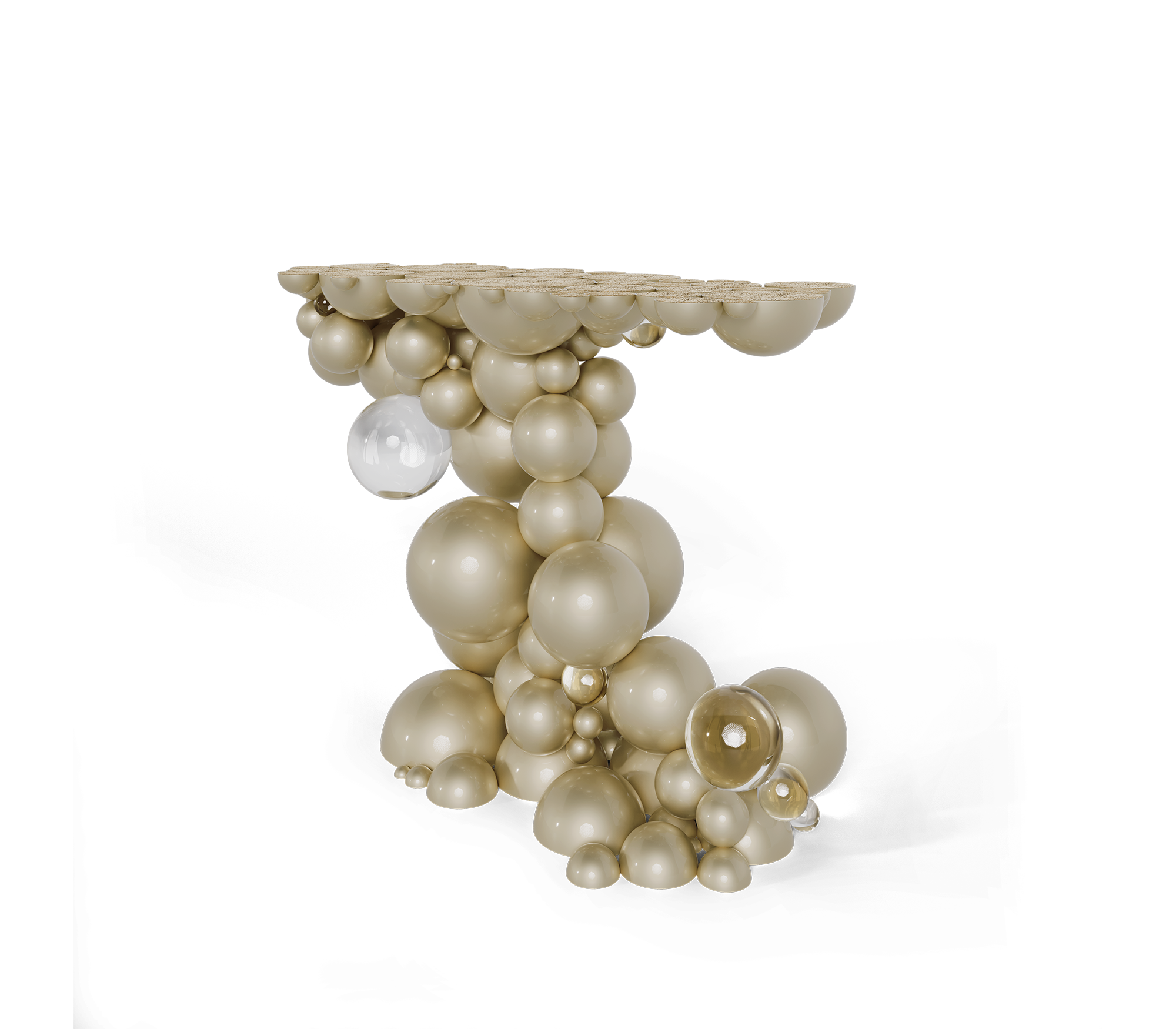 Built from aluminium spheres and acrylic, joint to produce a pattern and structure, finished in cromioand polished acrylic. Its surface texture designed to resemble cut wood is gold plated.