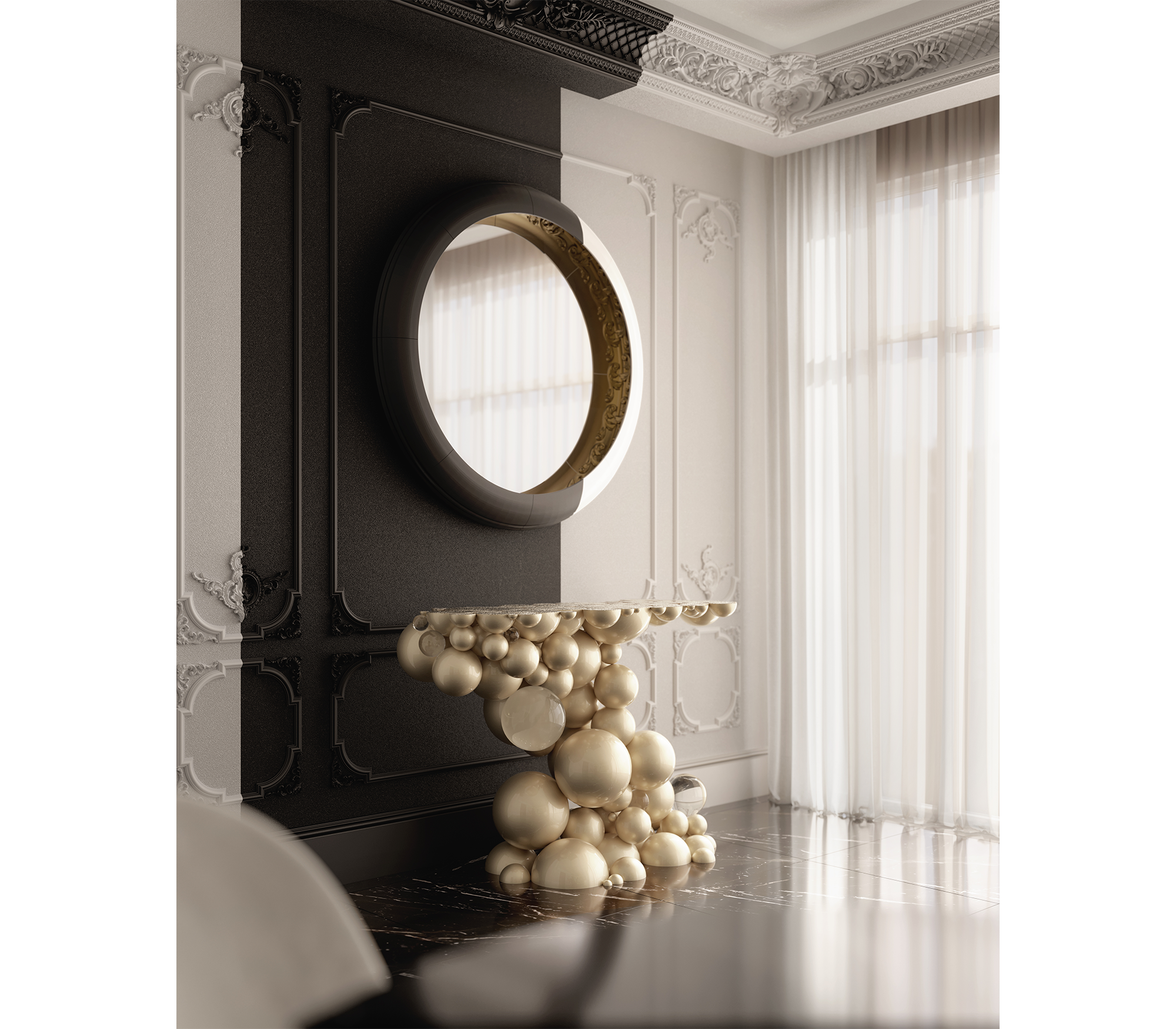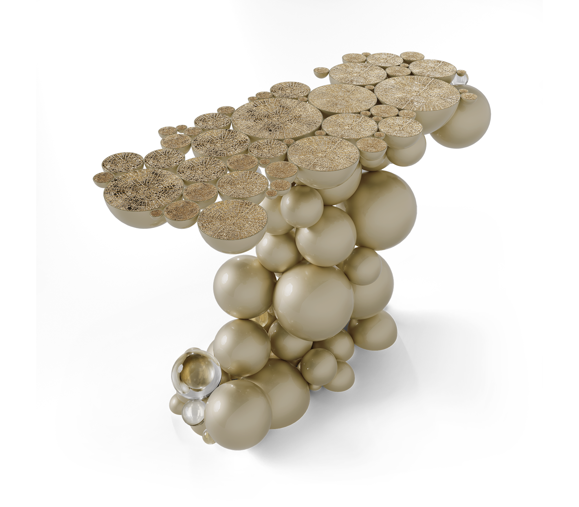 Defying the laws of physics, the Newton black and gold console has grown from the ancient art of casting metal, where metal is heated until molten into spheres and semi-spheres shape. One by one, each element is joint to produce an outstanding pattern and organic structure, finished in a dramatic black lacquer and gold plated accents. The top of this console table is composed of brass circles carved with a golden texture similar to organic wood texture. A contemporary console that carries cultural legacy while successfully moves towards the future, remaining ahead of the of the design scene. A real expression of exclusivity and high collectible craftsmanship outcome.