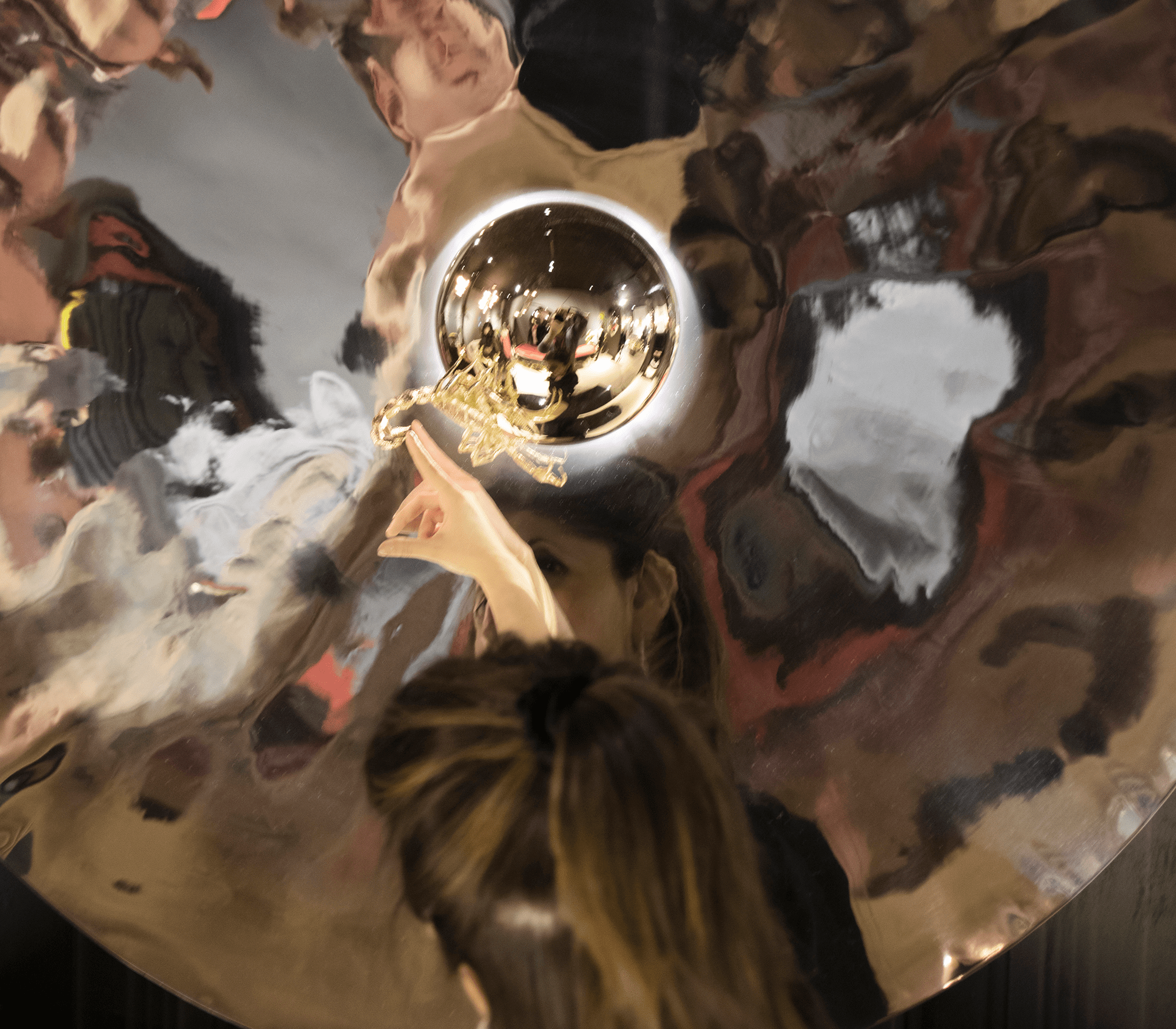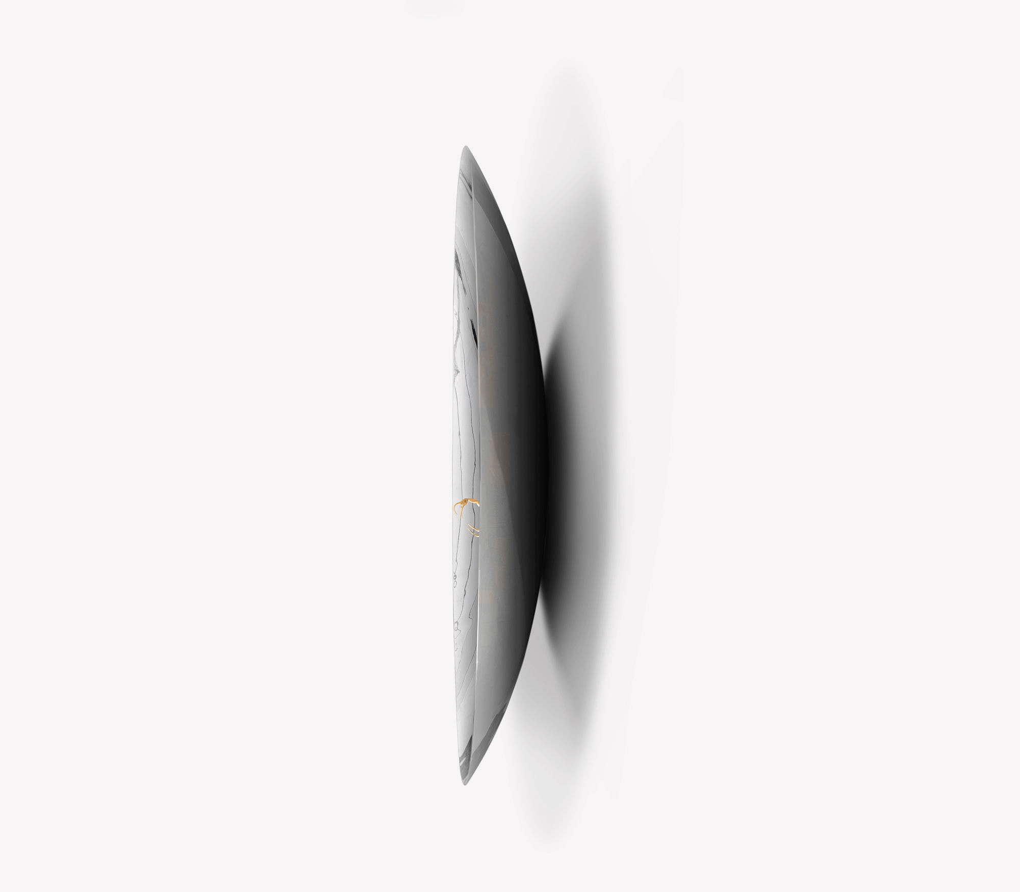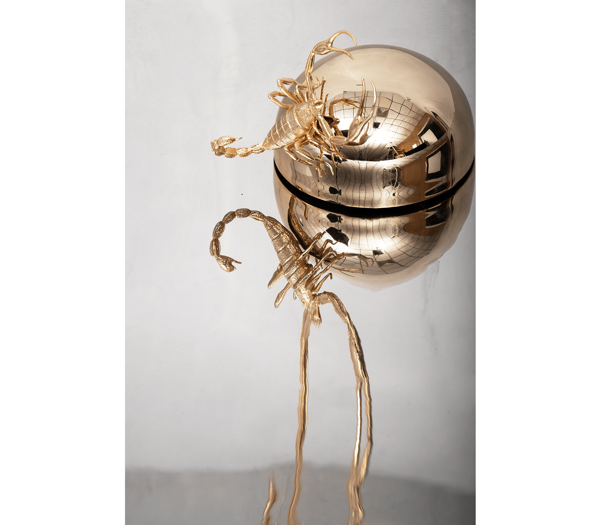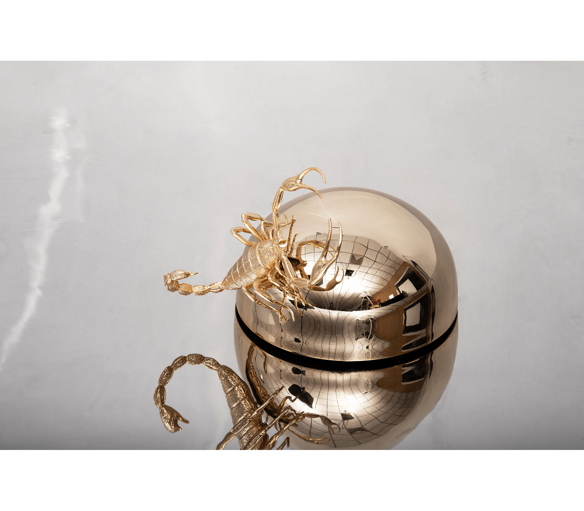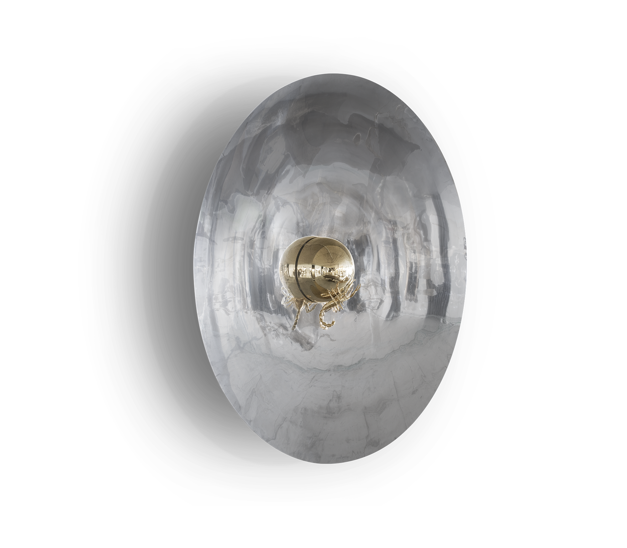 Contemporary art imagined for those who appreciate the great things in life, finding beauty in the most unexpected places. Metamorphosis large round wall mirror is conceived with the concave shape of polished stainless steel and coated in a nickel bath. A restless yet sleek gold scorpion of casted brass raises in the centre, landed in a polished stainless steel semi-sphere encircled by a warm light. This statement wall decoration piece is born from the finest craftsmanship for the most exceptional rooms and remarkable interiors. A tribute to the darkest side of nature where challenges never cease to exist.