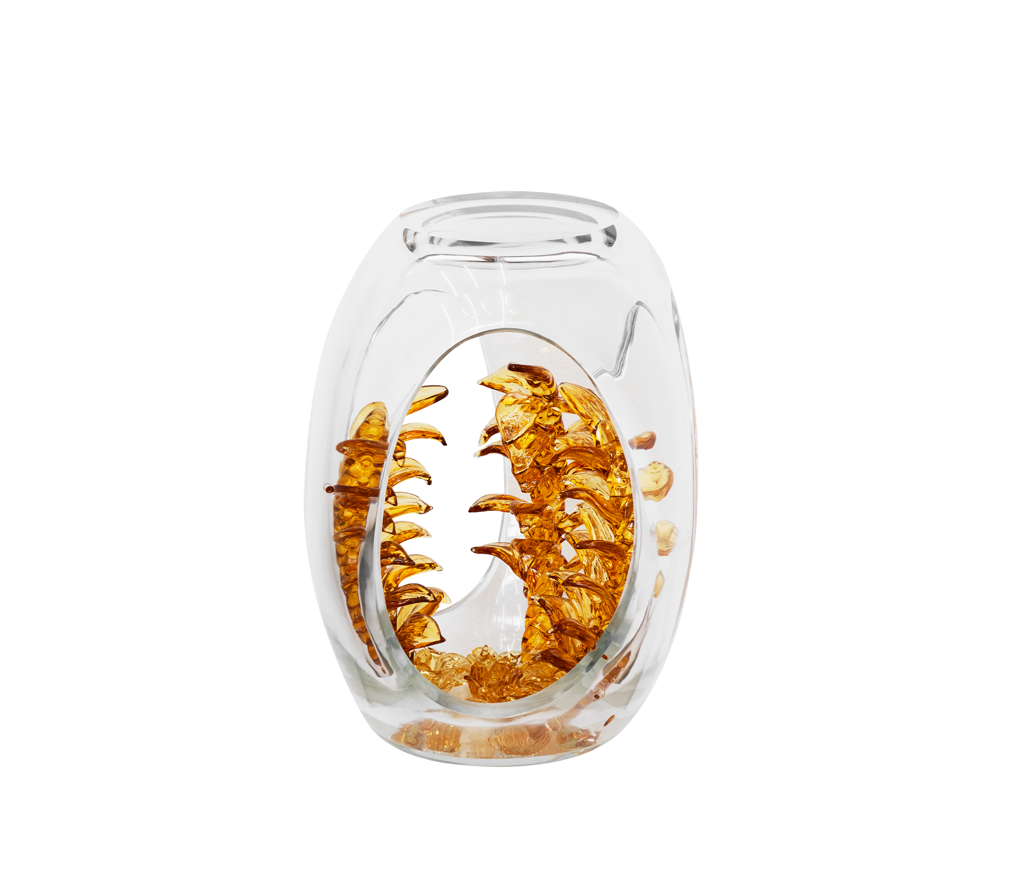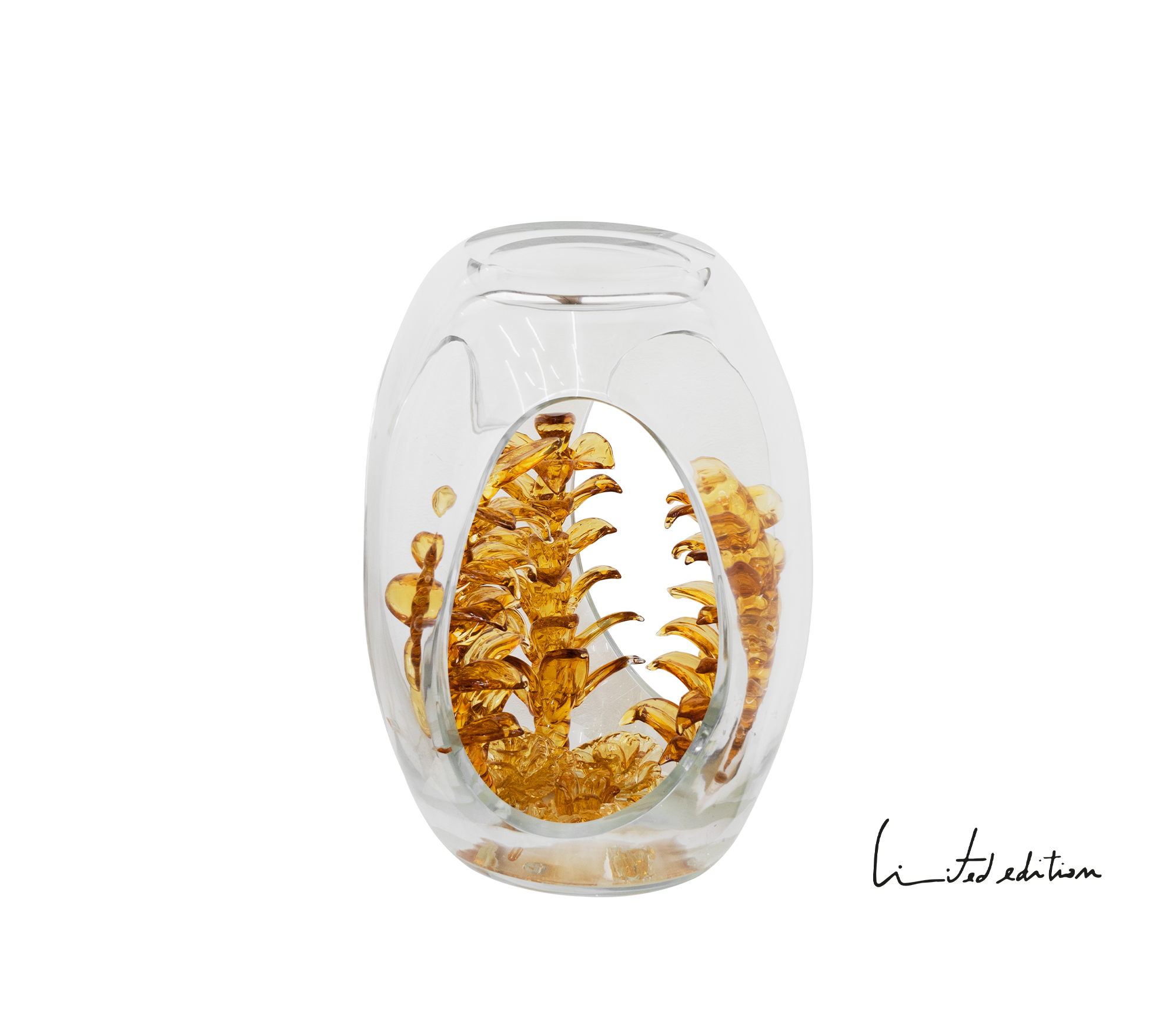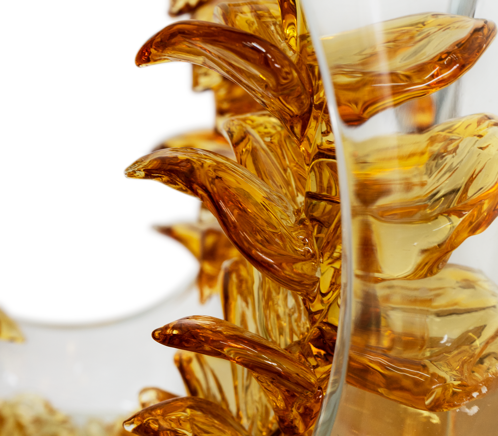 Ethereal Garden is a unique and exclusive stool created using the highest quality glass from the Italian Murano island. It is the reinvention of ancient techniques, such as glass blowing and glasswork, in a contemporary design, inspired by natural elements. The ancient technique of glass blowing brought to us Ethereal Garden with an interior made of molten glass, carefully modeled to nurture the floral elements. This masterpiece handles concepts like extreme delicacy and lightness. Glass is almost an ethereal material in the magically talented hands of Florentine master artisans. The shape of this stool is very unusual for a glasswork, so the challenge developed from it. For a while, it was considered impossible to surpass, even by the Murano’s workshops excellency. However, after true dedication and a long process of trial and error, without giving up, the master artisans were finally able to dominate glass and subdue it into a Carved design. First, three master artisans were needed just to put 40 kg of silica into the kiln. Then, the shape of the artwork was achieved by blowing hot glass and sculpting, once again with the help of several artisans to handle the dimensions and weight of it. Using ancient and traditional techniques glass was heated, turned, molded and blown, through a thin iron pipe. After three attempts and a week dedicated to the repetitive process of heating and molding glass while it rotates, this final and unique masterpiece was achieved, after cooling. The challenge was so demanding that the Florentine master artisans had to change the initial proposed dimensions to be able to transform this conceptual piece into reality. Ultimately, the floral elements made of glass were introduced, following Murano’s tradition. Using fire and the precious knowledge of master artisans, the translucent stool was adorned.