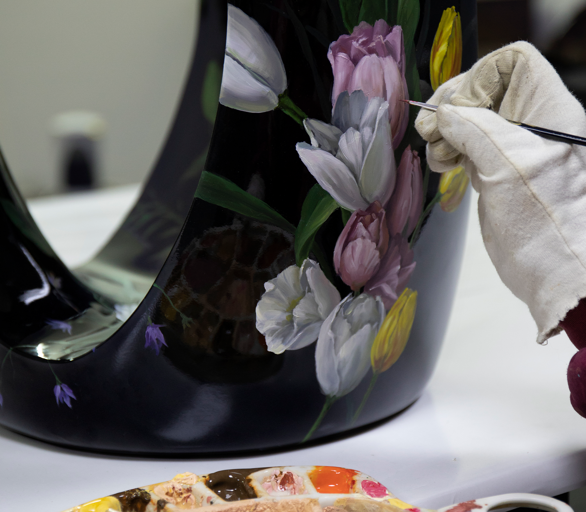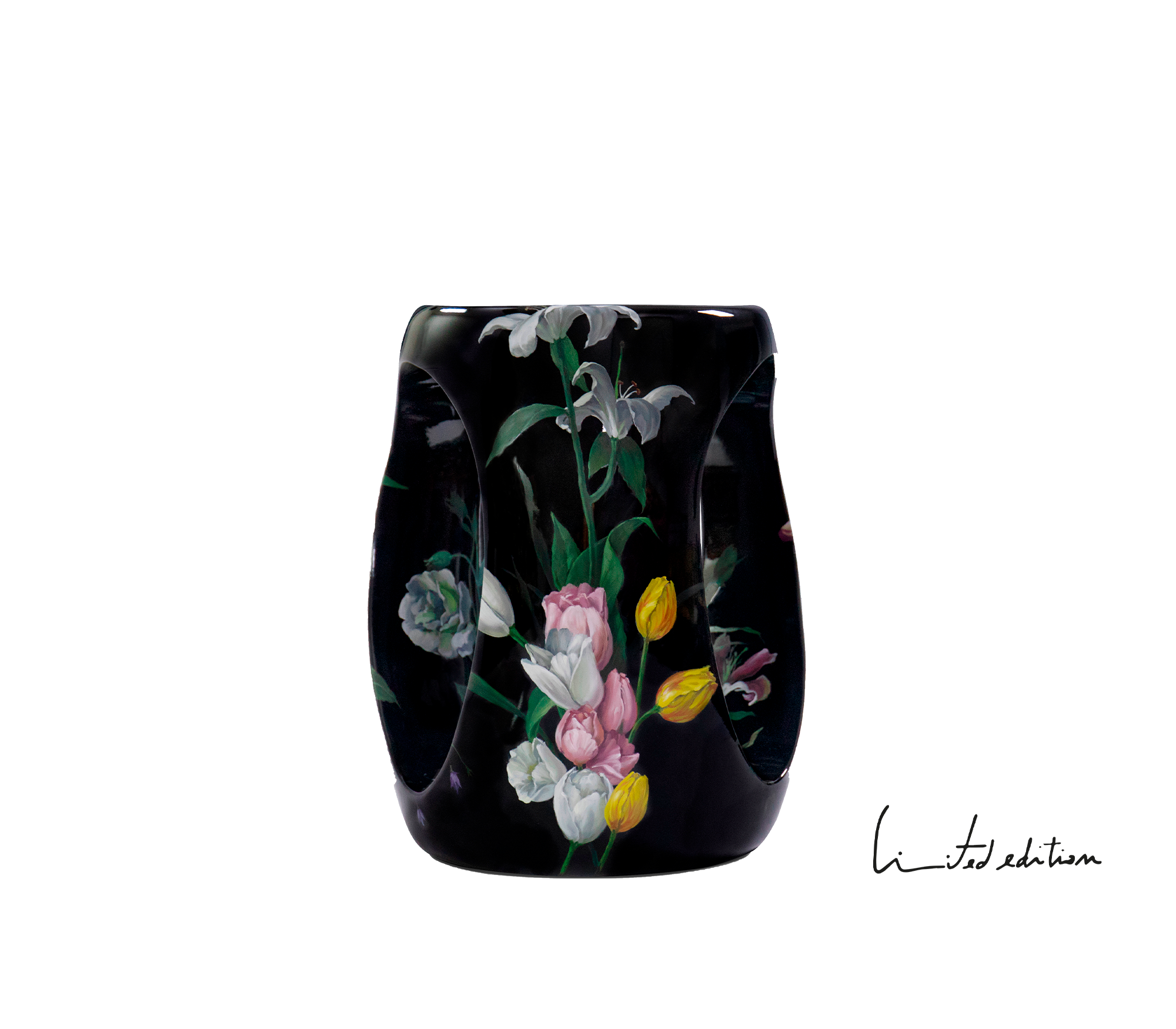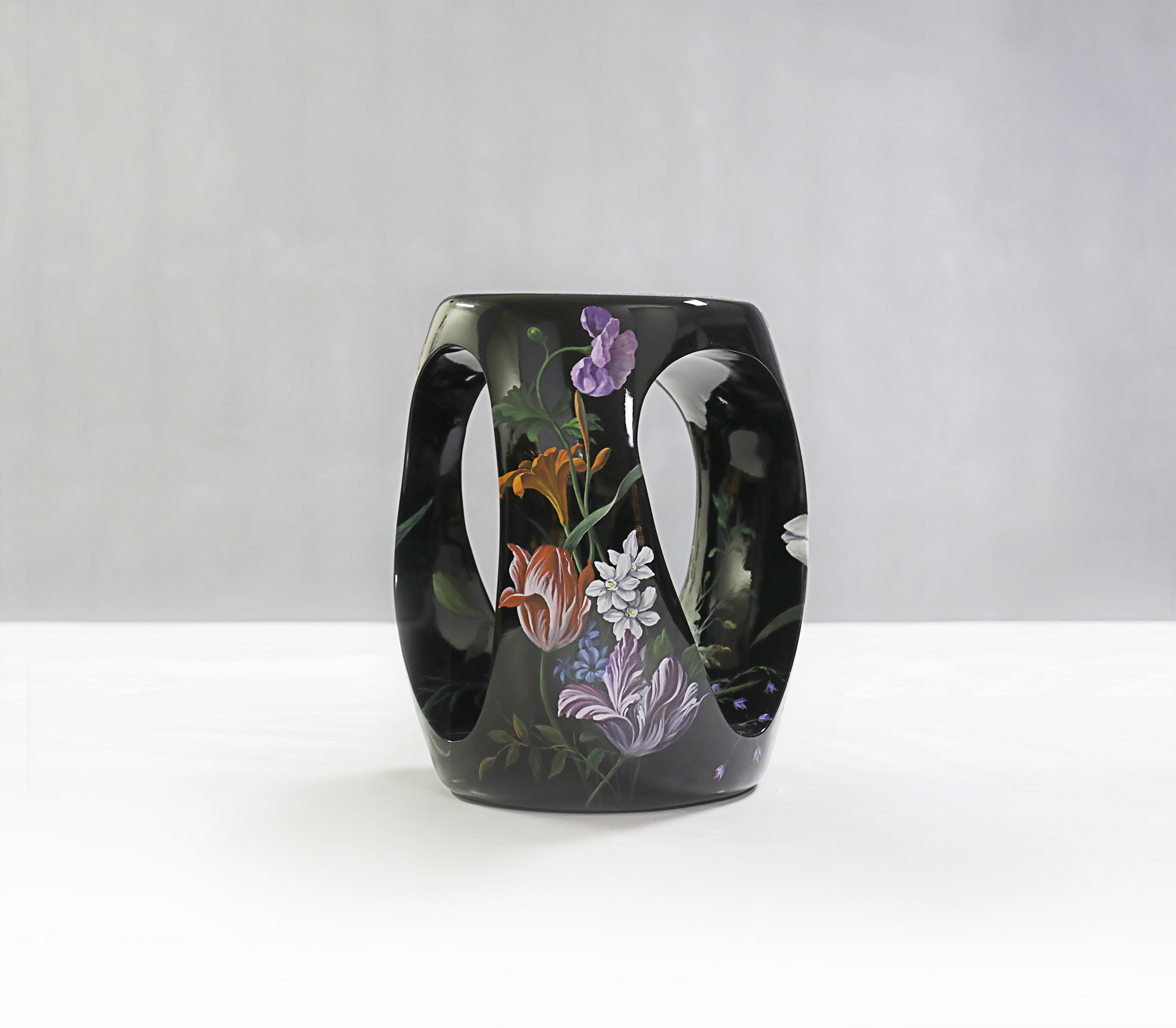 Floral is a soulful stool which evokes Portuguese Romanticism traditions thanks to its gentle flowers delineated with oil paint over a black background. It marries perfectly ancient painting techniques with contemporary design. The Floral art piece was born from the delicate oil painting, which gives a modern look to floral elements. The challenge of recreating an ancient technique to bring to life an Art stool was proposed to Santa Bárbara’s atelier, renowned in Portugal due to its high quality and detail in painting applied to restoration. Expertise in craftsmanship allowed master artisans to adapt this craft often used in furniture and murals. The result is a masterpiece filled with a unique elegance and detail which can only be achieved by hand craft. Its pictorial quality is remarkable.