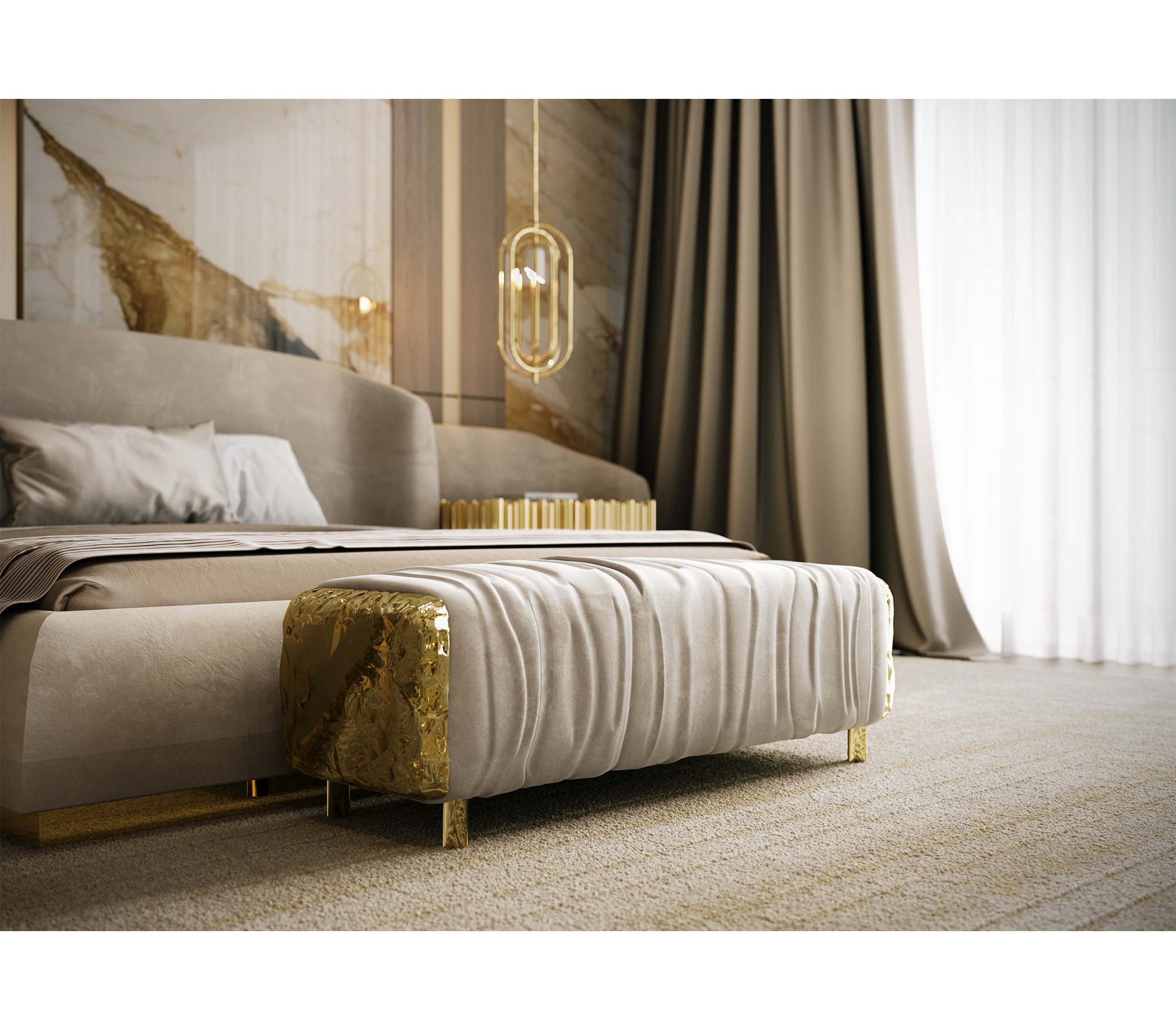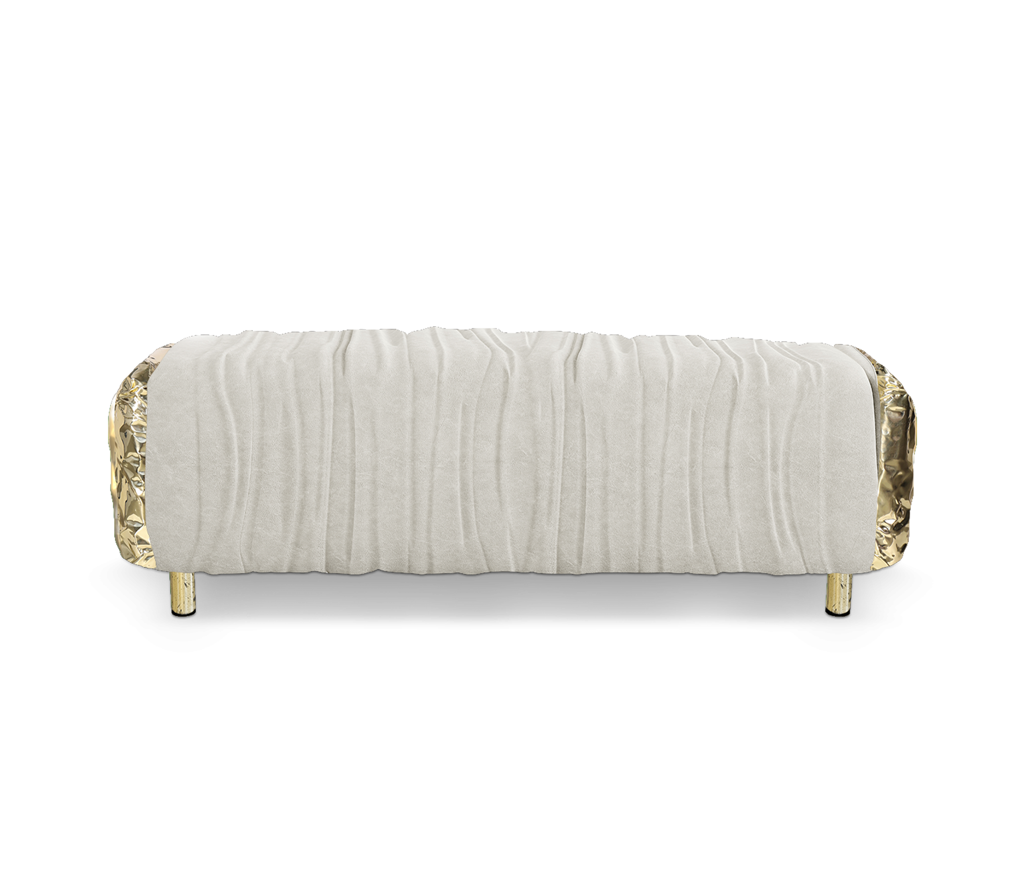 The Imperfectio Bench takes exceptional craftsmanship and design to a new realm, celebrating the charm of imperfect aesthetics and the true essence of artisanal art. This distinctive seating piece joins the iconic Imperfectio family, extolling intentional irregularities as the ultimate form of beauty. The true essence of this bench lies in its hand-hammered polished brass details, which artfully envelop the sides of the structure. Like a story told through metal, these golden accents feature a rough, organic texture that creates a sophisticated play of light and reflections. The body is meticulously upholstered in premium Putty leather, featuring soft, rhythmic folds that provide a unique smoothness and comfort, inviting you to enhance your living space or bedroom sanctuary. This design portrays a beautiful duality between the raw power of the brass and the refined elegance of the leather. A functional artwork piece born from the fusion of curated materials and historical know-how, the Imperfectio Bench is an invitation to celebrate authentic design. It encapsulates a new contemporary verve into interior design, honoring the dedicated work of metalworking, woodwork, and upholstery.
