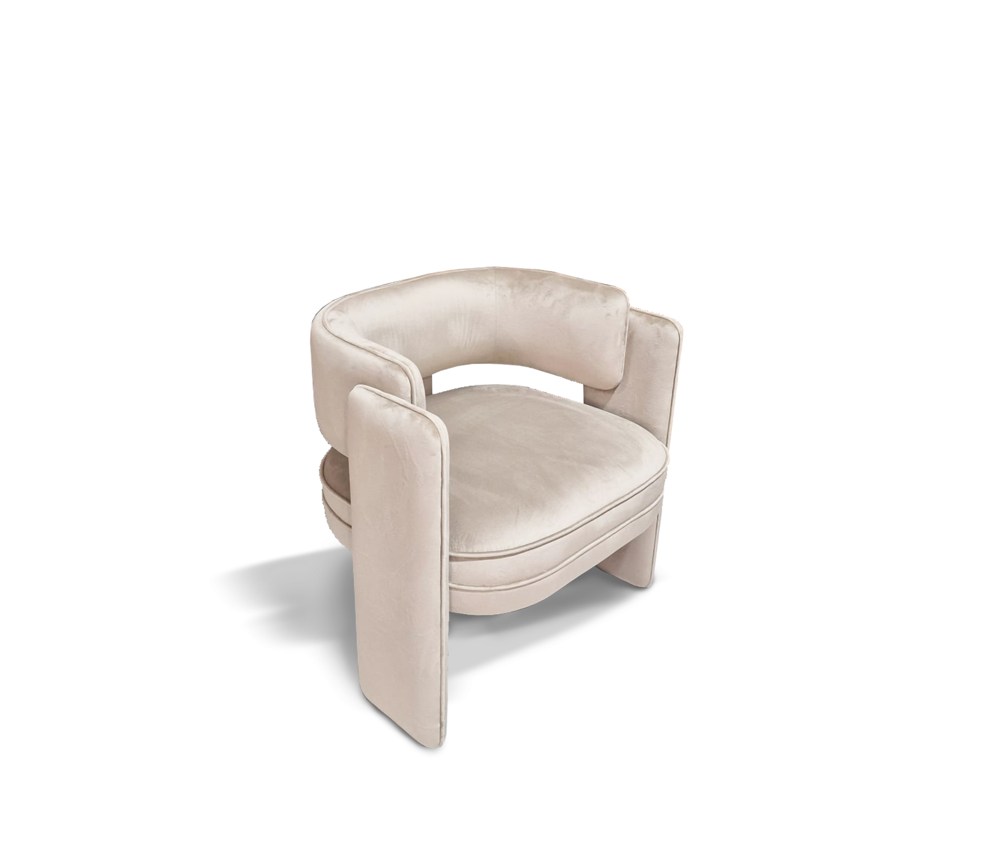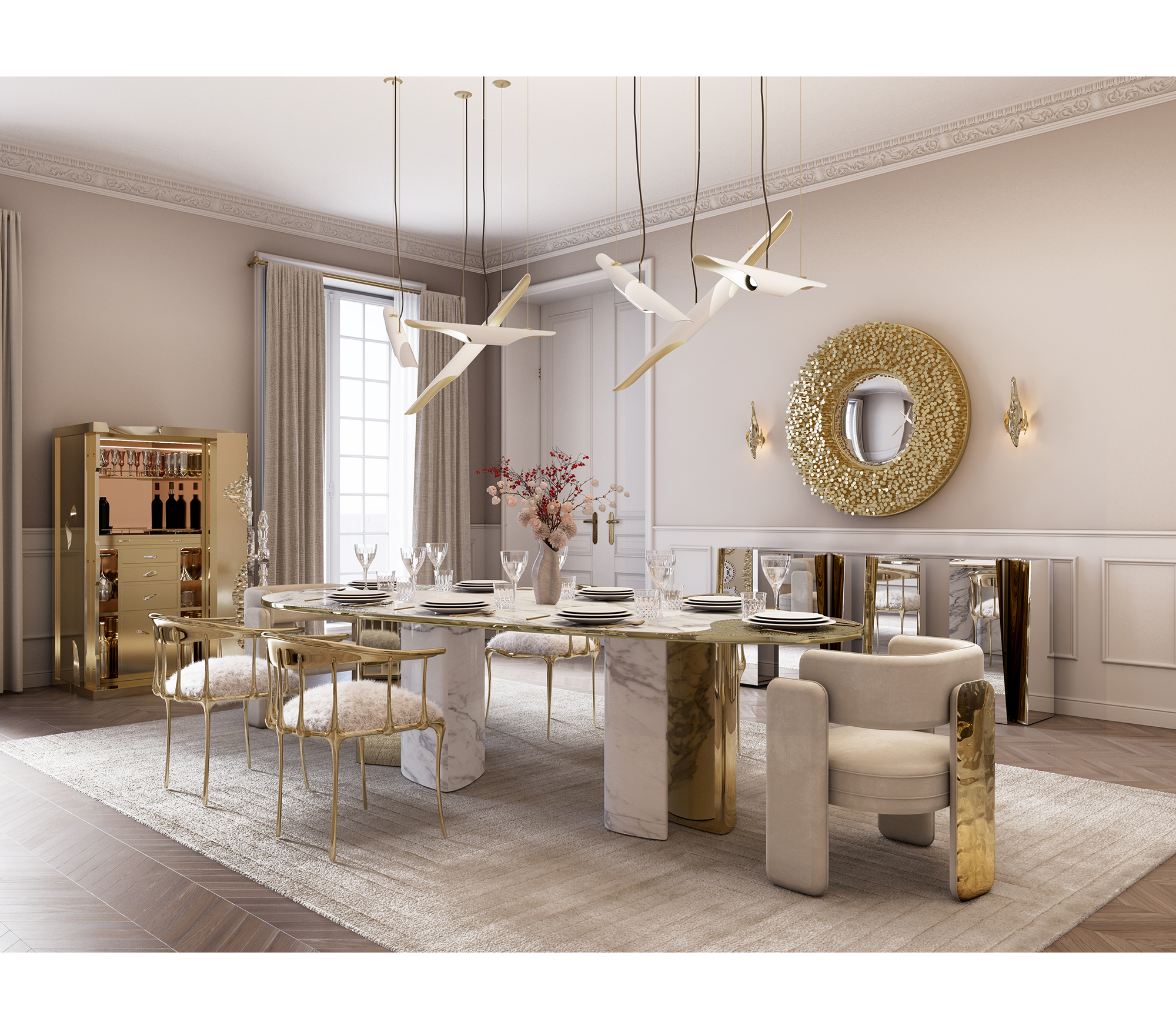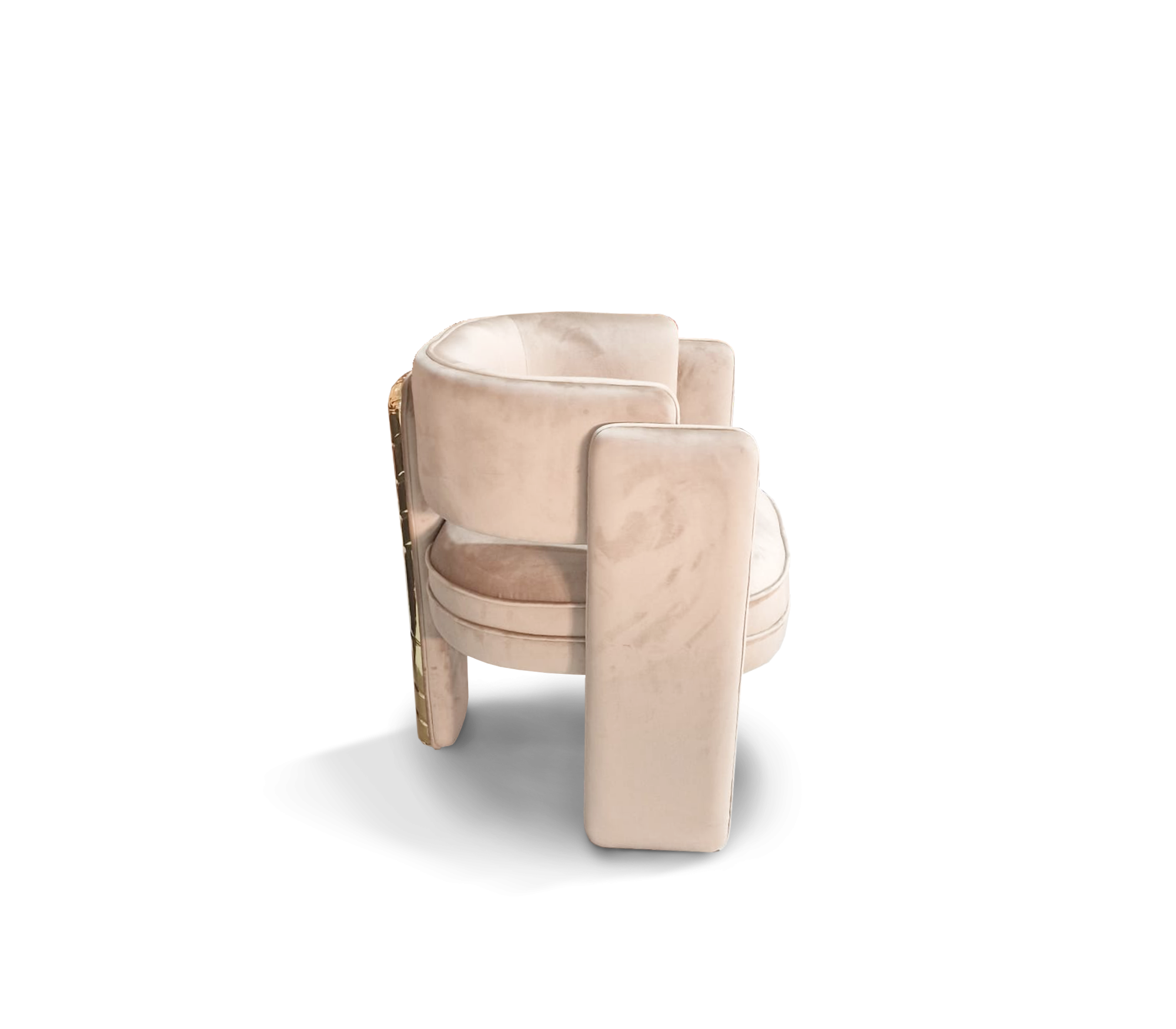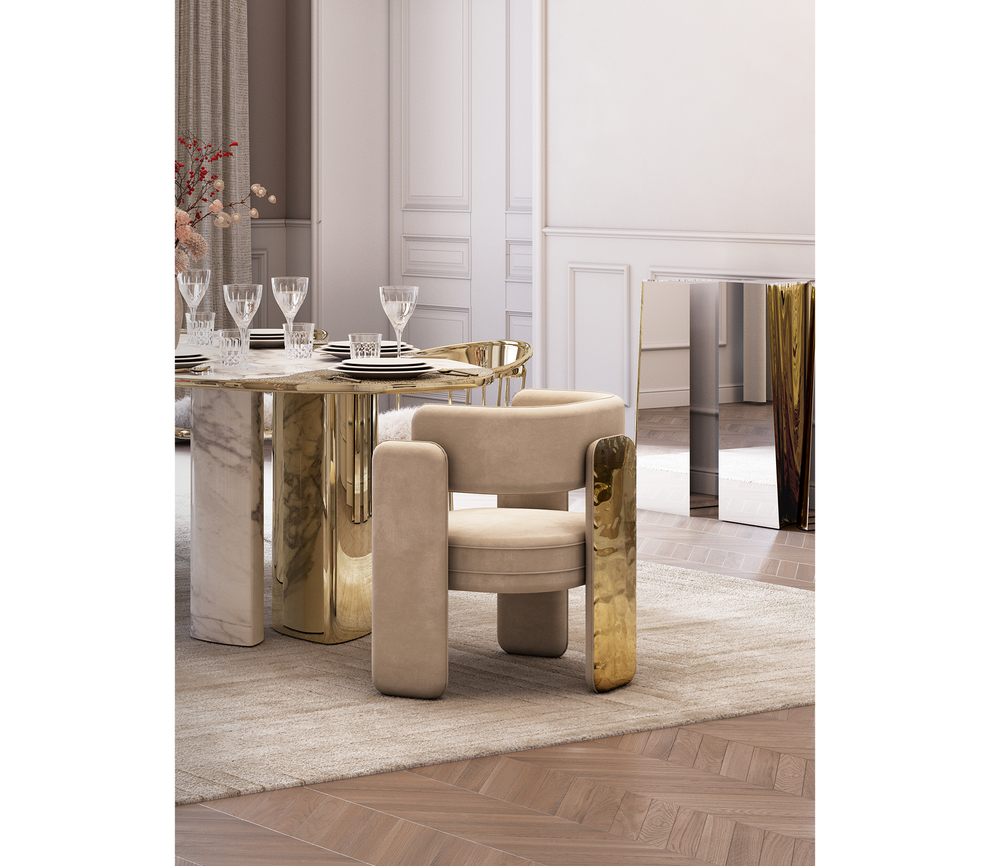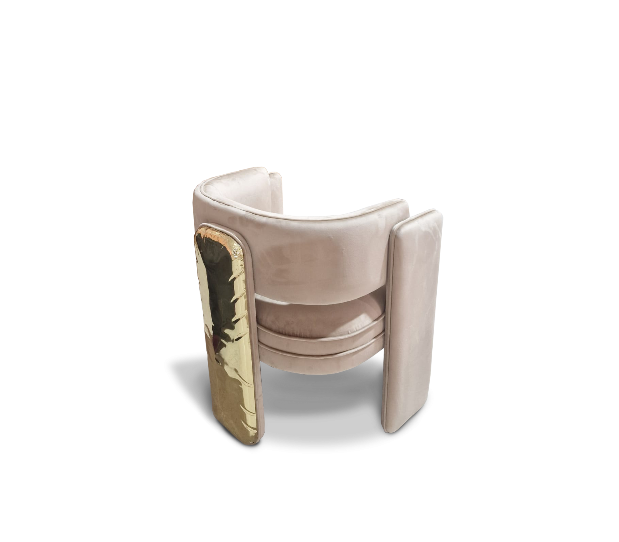 Noble dining chair takes exceptional craftsmanship and design to a new realm, where the softness of Macau Sand Velvet meets a bold architectural spirit. Finding beauty in the most unexpected places, this contemporary piece is defined by its striking silhouette and a monumental back leg in polished brass that portrays a perfect mirror. A functional artwork piece born from the fusion of woodwork and meticulous metalworking, the Noble chair conveys both dynamics and elegance. It is a beautiful duality between power and refinement, designed to bring a new contemporary verve and a touch of sophisticated art into the most exclusive dining rooms.