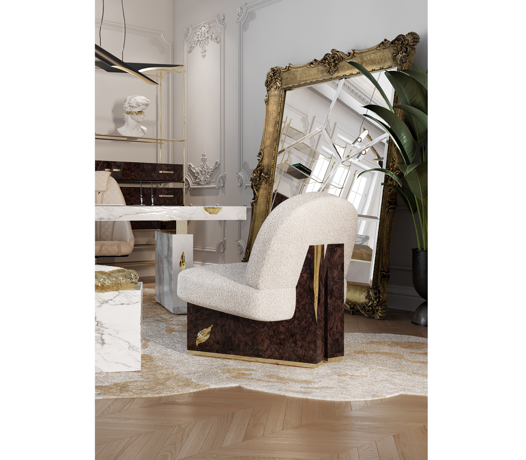 Sancho armchair takes exceptional craftsmanship and design to a new realm, where bold architectural forms meet a striking curvilinear silhouette. Finding beauty in the most unexpected places, this contemporary piece is defined by its monumental split base, now reimagined in the rich, swirling textures of walnut root veneer. The true essence of Sancho lies in its dual nature, featuring the deep, organic grain of noble wood that portrays a story thousands of years old, harmoniously interrupted by organic cast brass details. This meticulous work creates a beautiful duality between the warmth of the earth and the cold, golden brilliance of the metal, a testament to the mastery of our artisans. An invitation to elevate your space with a functional artwork piece born from the fusion of curated materials and historical landscapes.