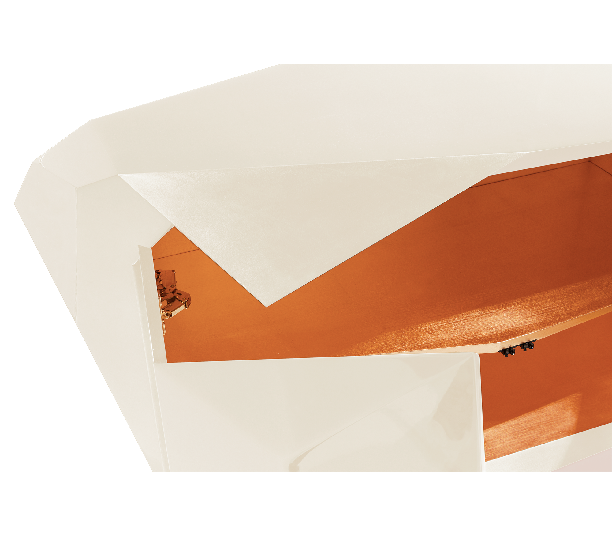 The iconic faceted Diamond Pyrite sideboard is reinvented as a remarkable outcome of architectural thinking with a powerful glistening effect.