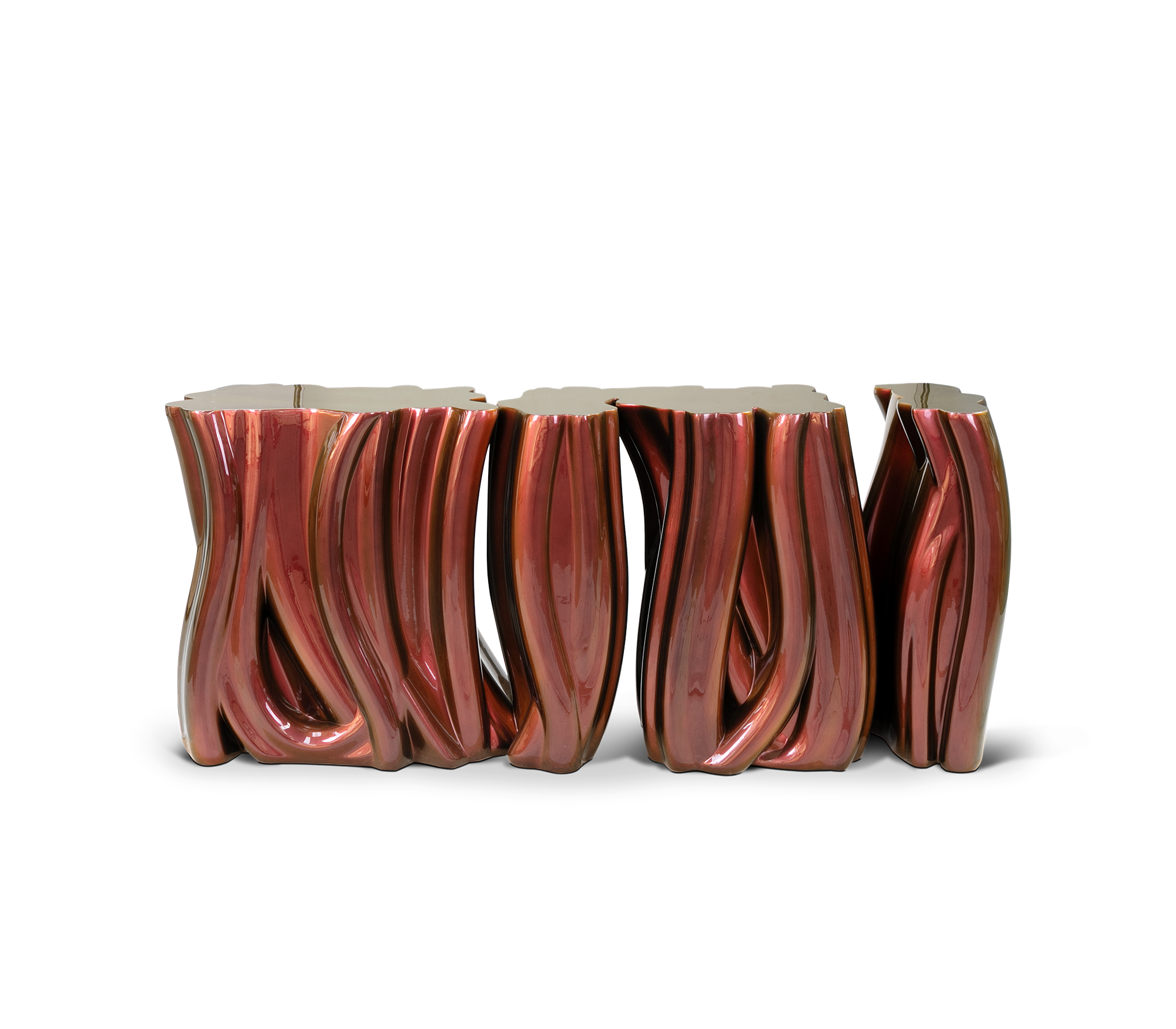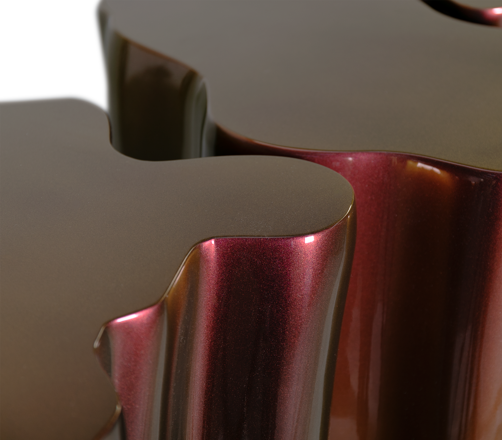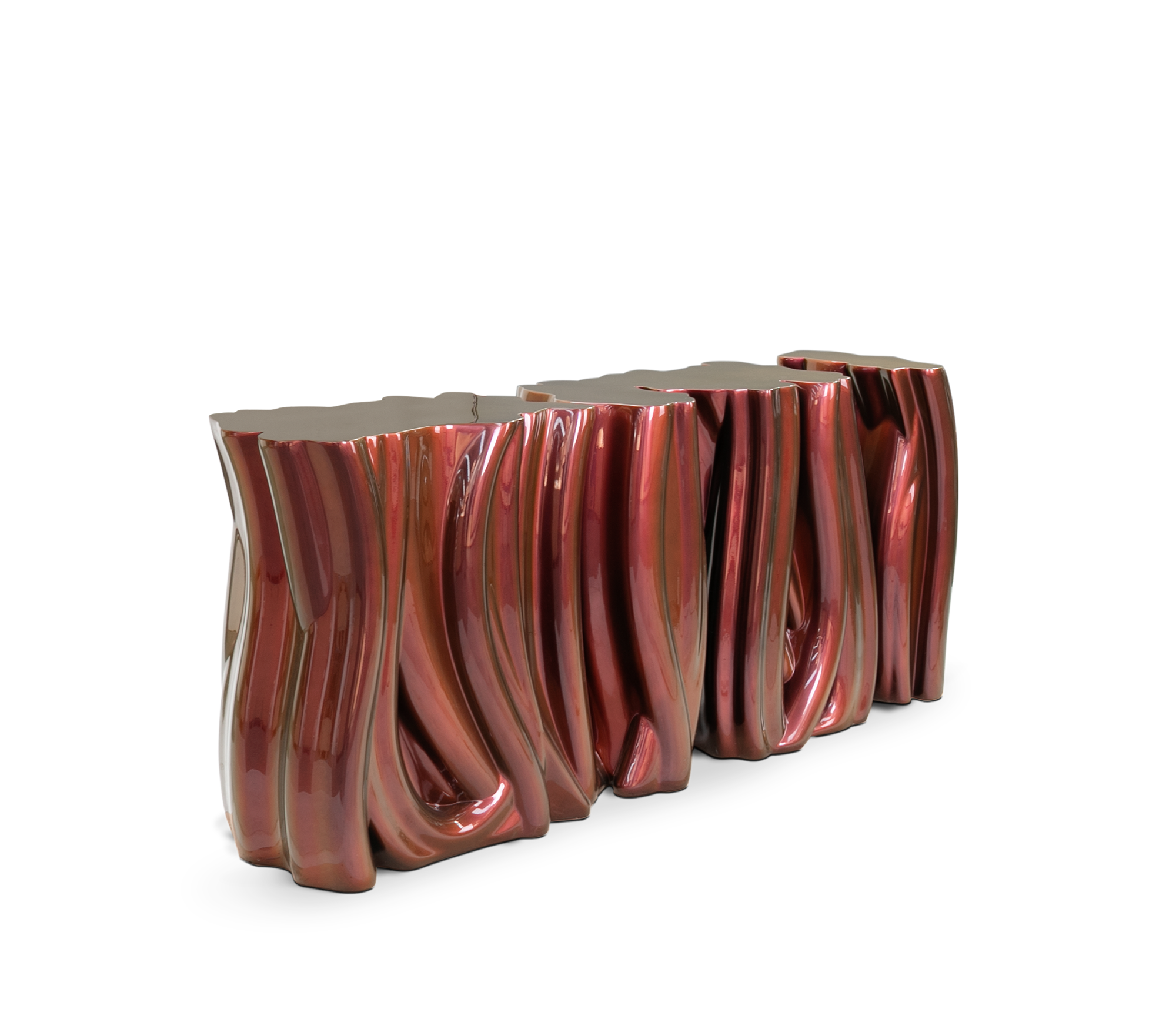 The contemporary console Monochrome embraces delicate craftsmanship and embodies leading-edge design, through its daring curvy shapes and chameleon tones. Carefully sculpted from fiberglass and resin, the Monochrome is composed of three separate modules, embellished with Chameleon color-shifting pigment in red-violet/gold/bronze, and finished with a high gloss varnish coat. Perfect for contemporary homes, this avant-garde console conveys a seductive and fearless attitude due to its unique and bold style. A statement design piece that stands out in any room or setting.