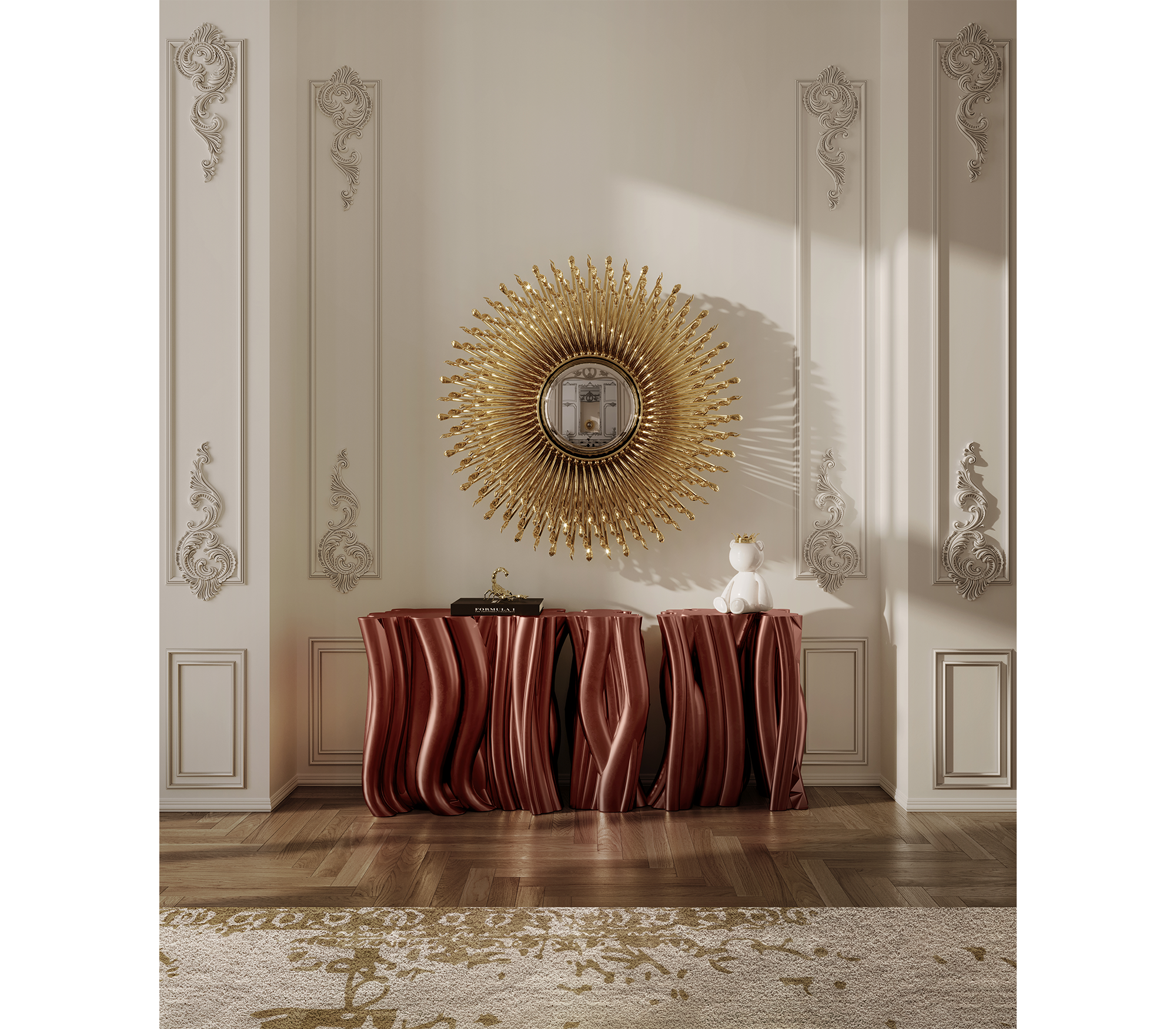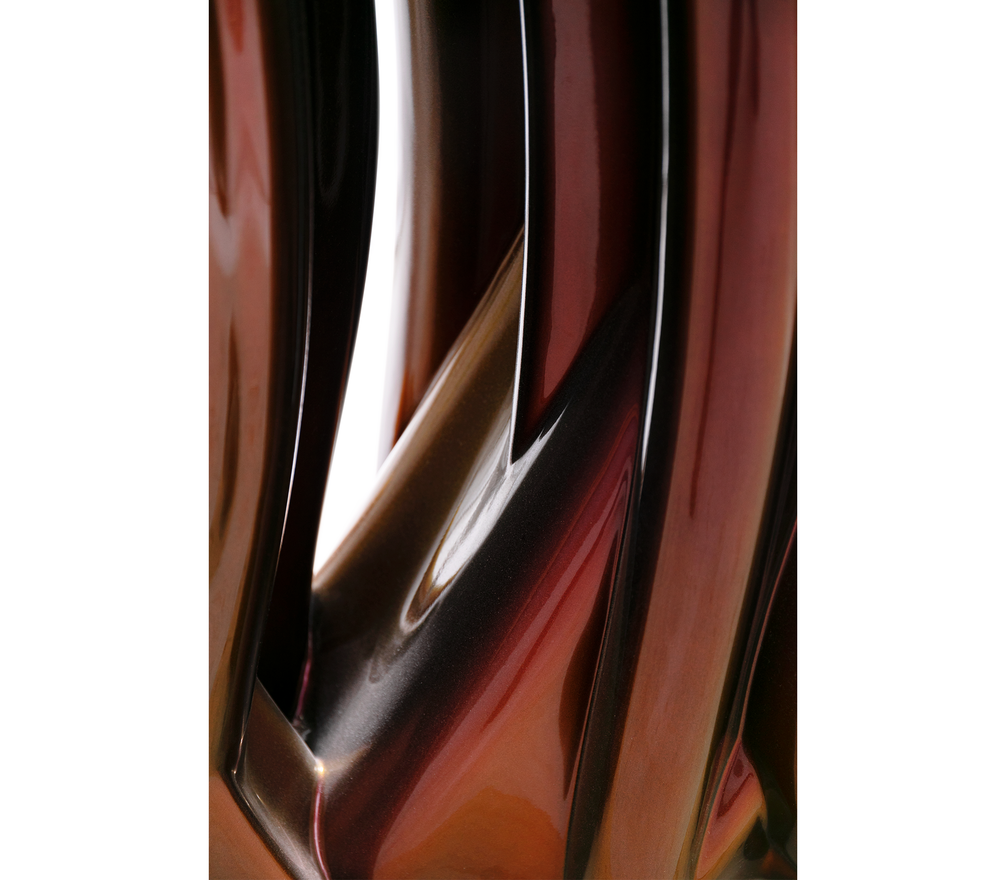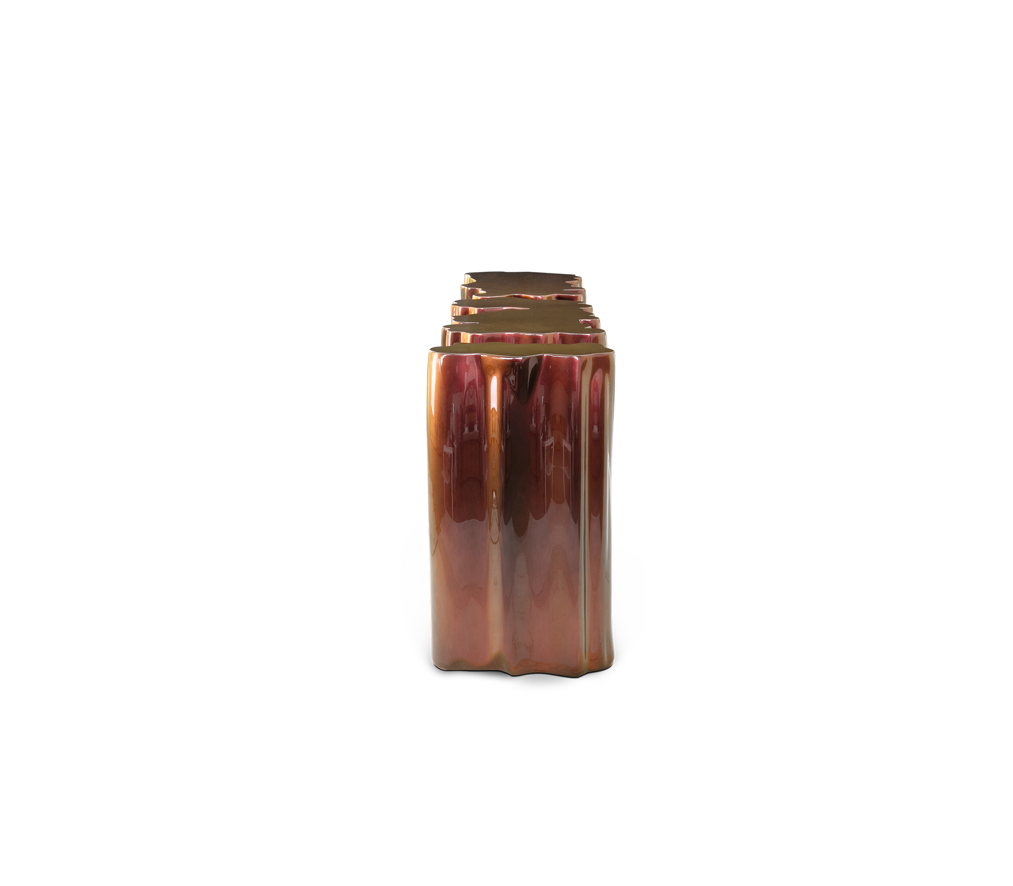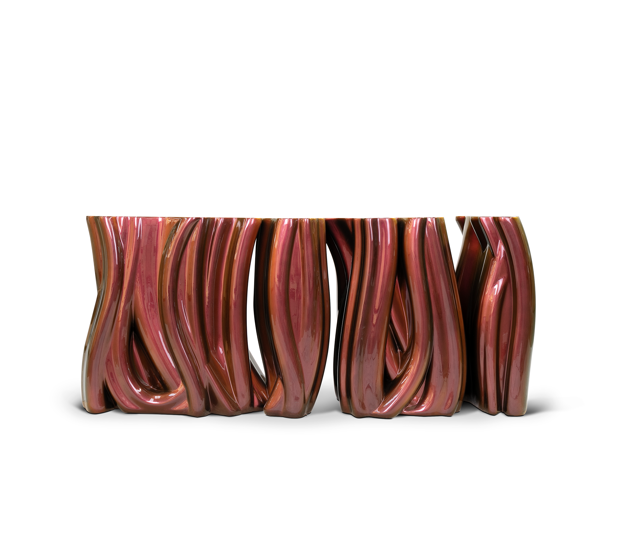 The contemporary console Monochrome embraces delicate craftsmanship and embodies leading-edge design, through its daring curvy shapes and chameleon tones. Carefully sculpted from fiberglass and resin, the Monochrome is composed of three separate modules, embellished with Chameleon color-shifting pigment in red-violet/gold/bronze, and finished with a high gloss varnish coat. Perfect for contemporary homes, this avant-garde console conveys a seductive and fearless attitude due to its unique and bold style. A statement design piece that stands out in any room or setting.