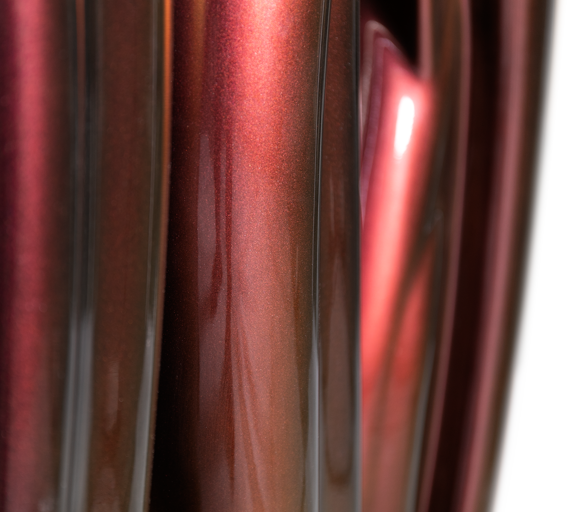 Sculpted fiberglass resin filled with expandable polyurethane. Chameleon color-shifting powder pigment in red-violet/gold/bronze. High gloss varnish coat.