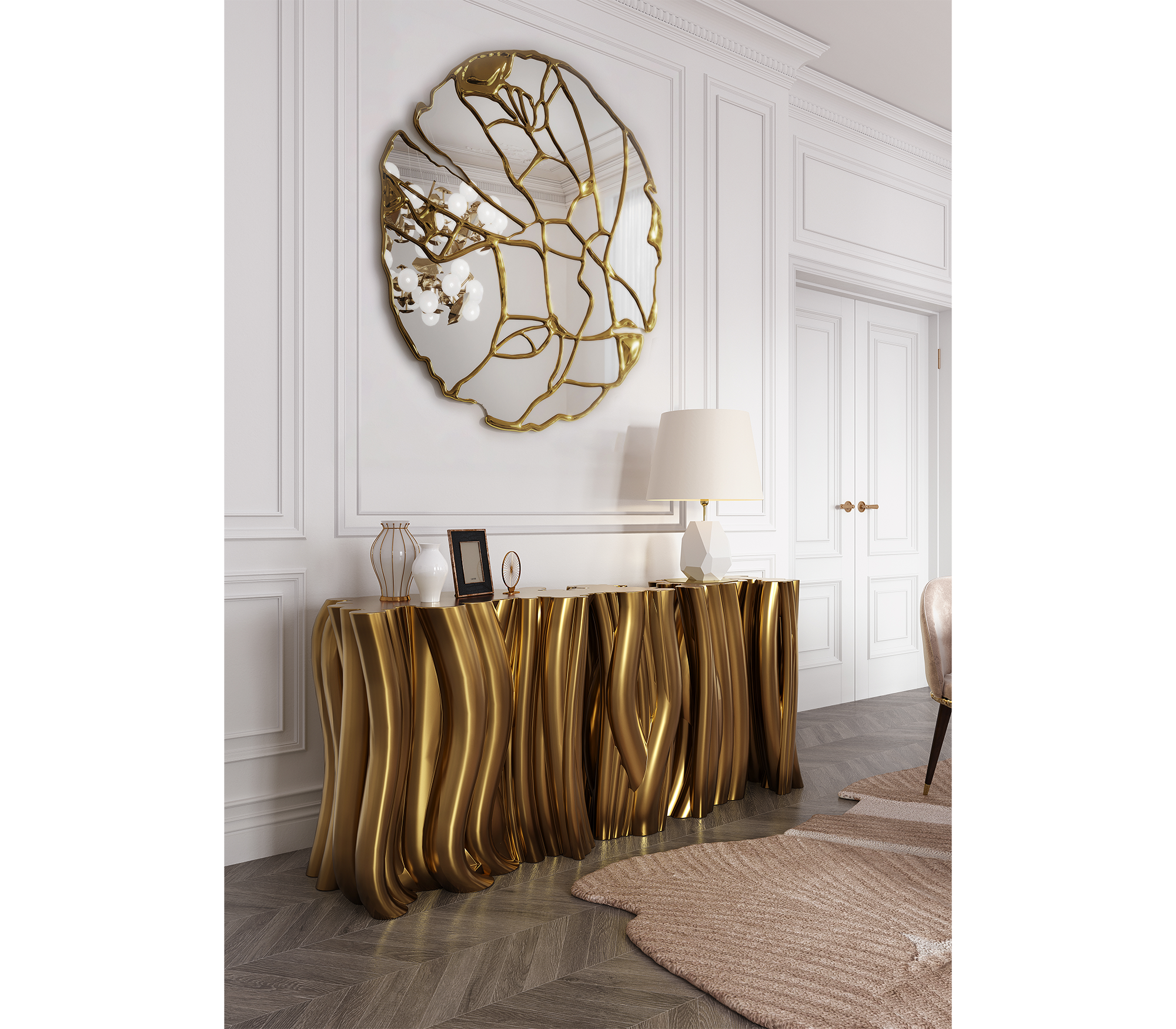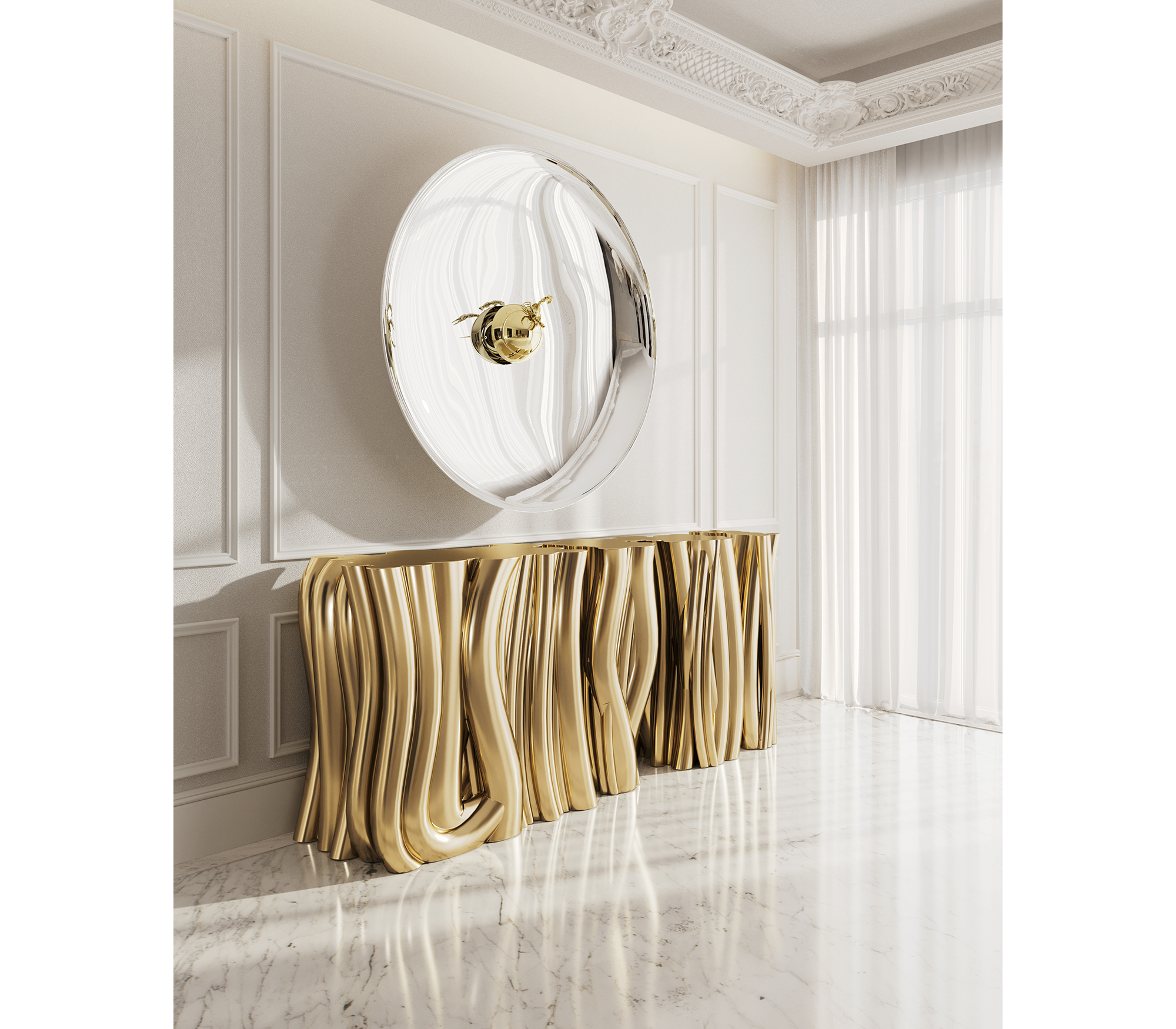 A demonstration of both imagination and strong design skills, the Monochrome console is a remarkable piece that stands out in any room or setting. Perfect for living spaces grounded in contemporary style as they embrace careful craftsmanship, this console expresses a leading edge outlook through its daring curvy shapes and gold tones.