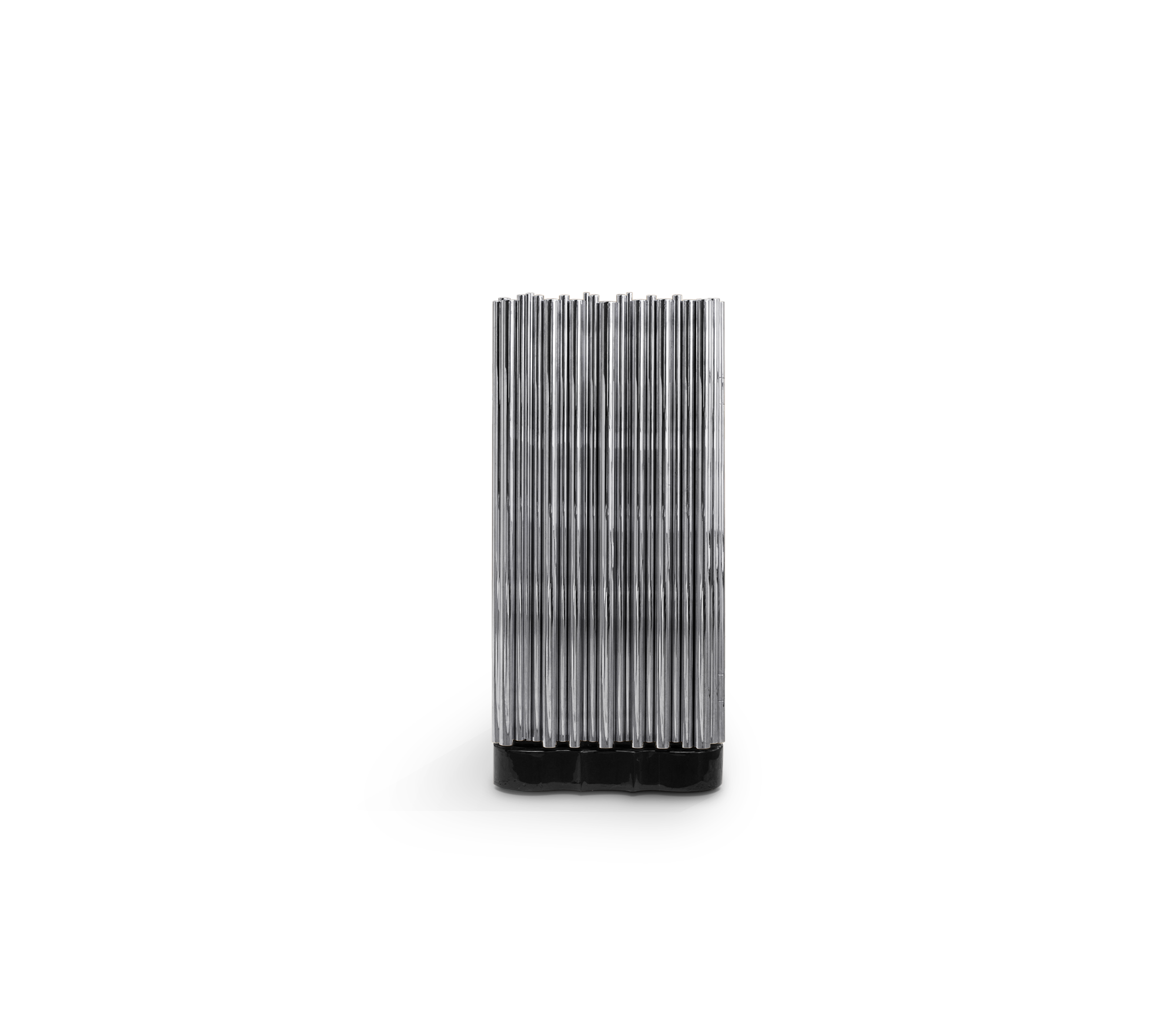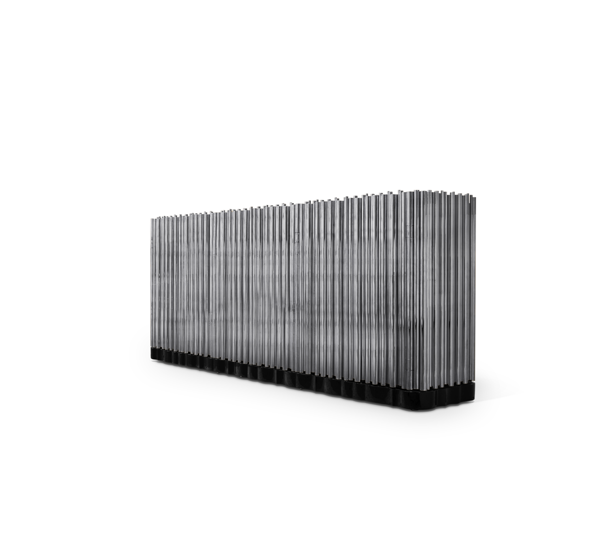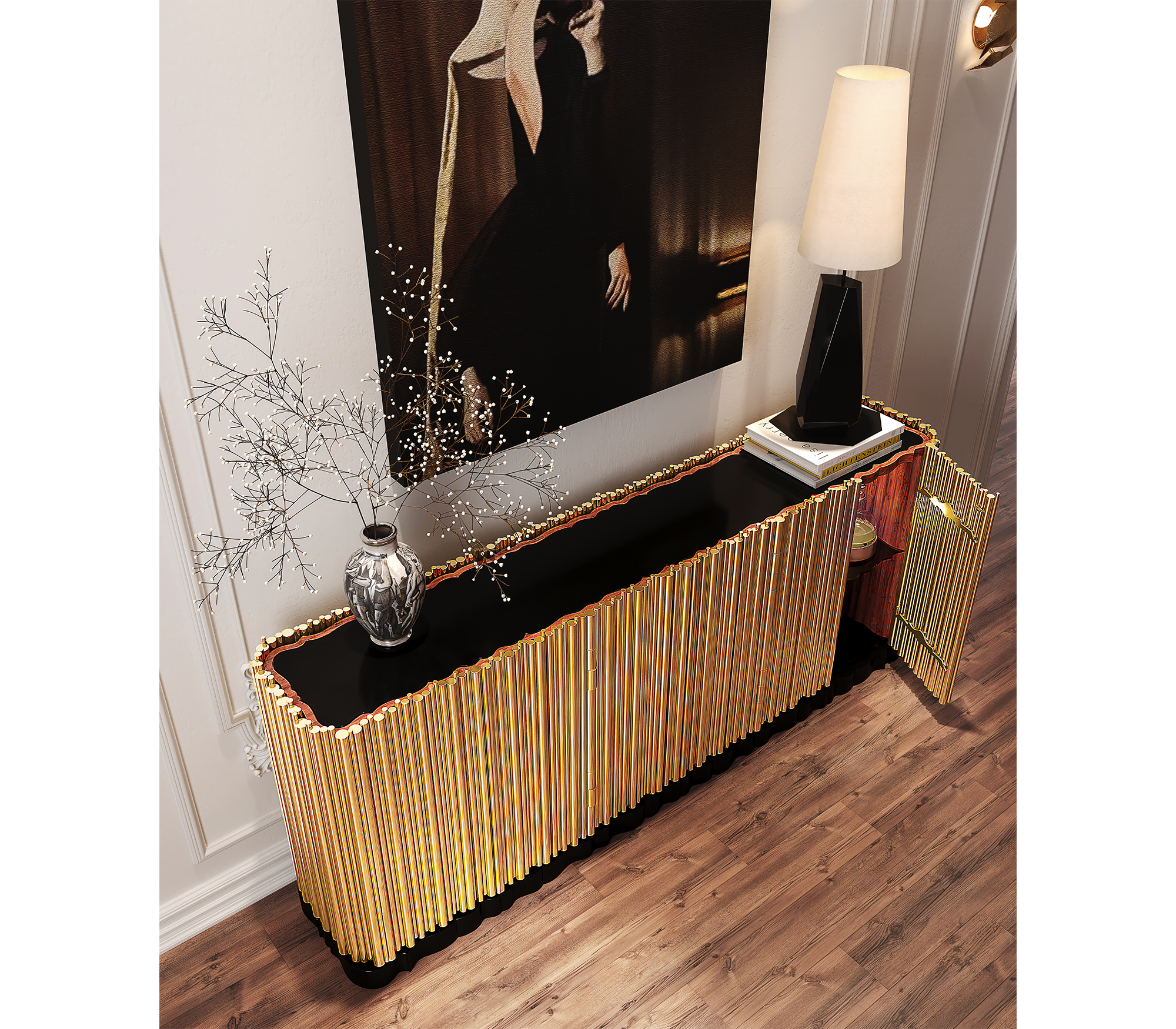This buffet presents a strong wood body enveloped in a tubular cluster of either gold or nickel plated brass tubes, where each door is carefully welded with cutting edge-technology. A harmonious artful juxtaposition that adds rhythm and sophistication to any space. Symphony is wrapped up by a strong black lacquered base, while the top is finished in opaque black glass.