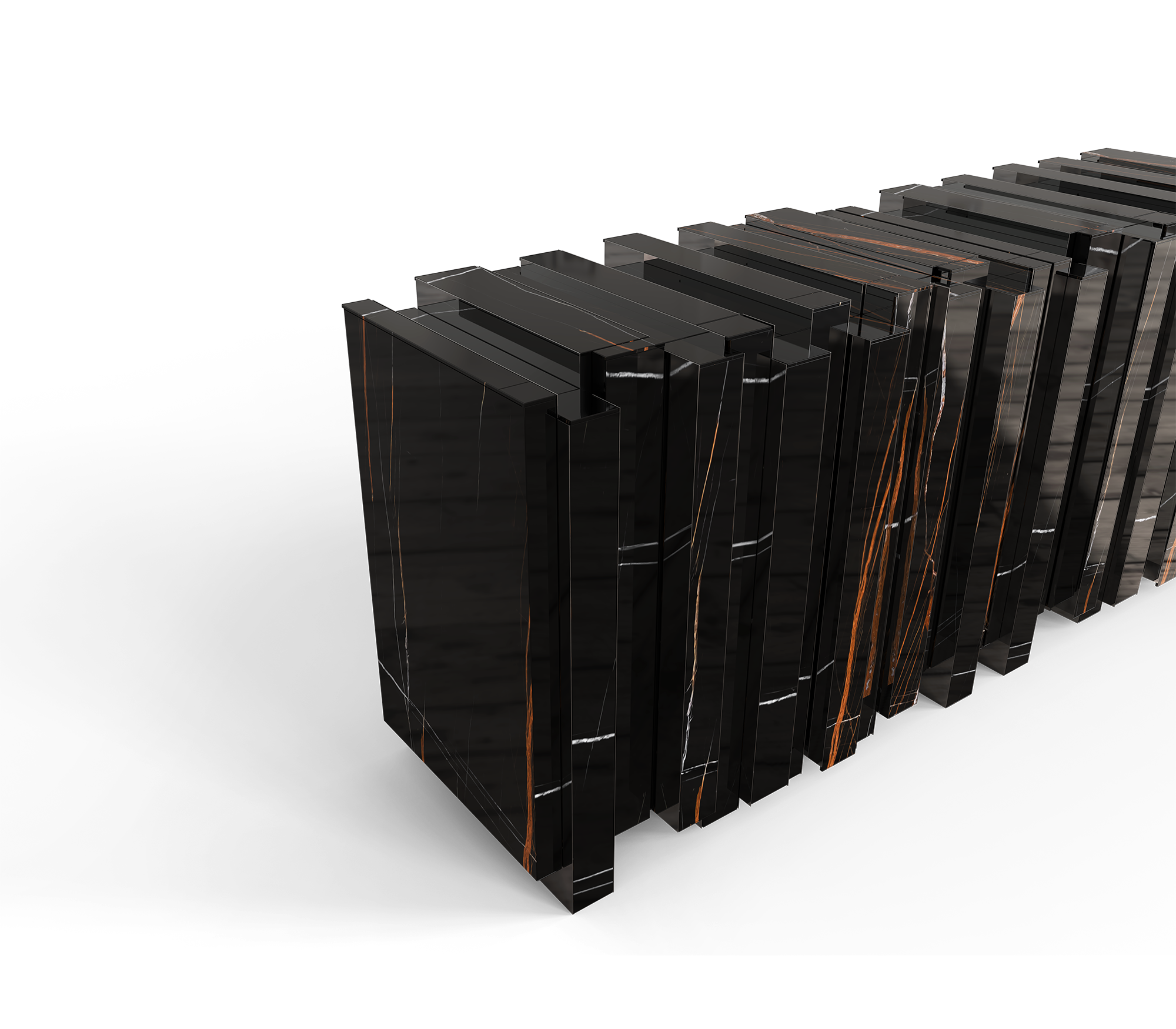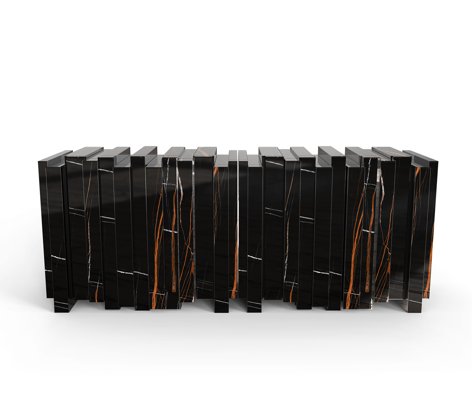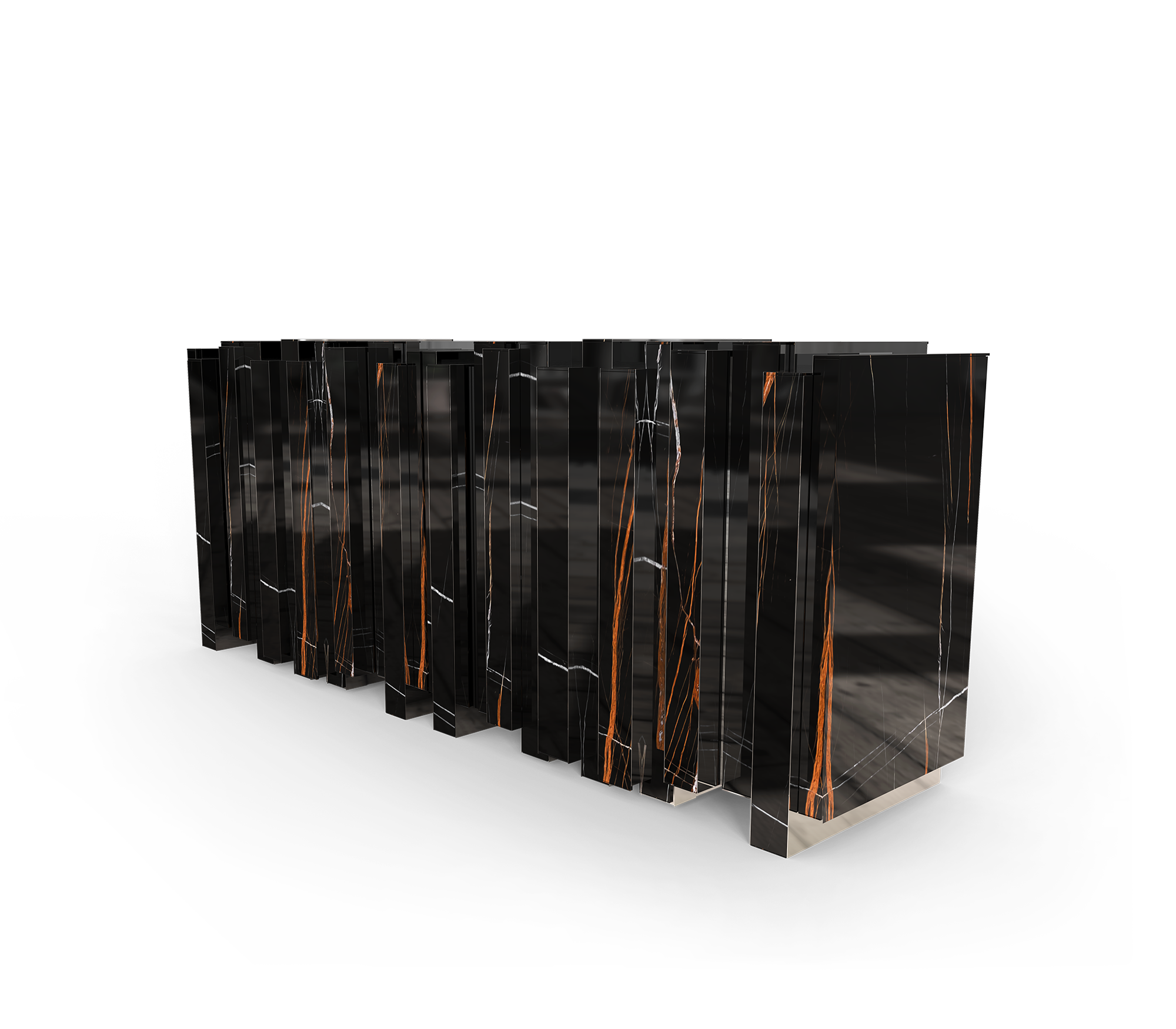 Vertigo sideboard is the perfect union of art and functionality. Divided into two parts, the luxurious design is accentuated by slabs of Sahara Noir marble, which add a touch of sophistication and exclusivity. The bronze mirror adds an extra dimension of depth and elegance, reflecting the beauty of the surrounding environment.