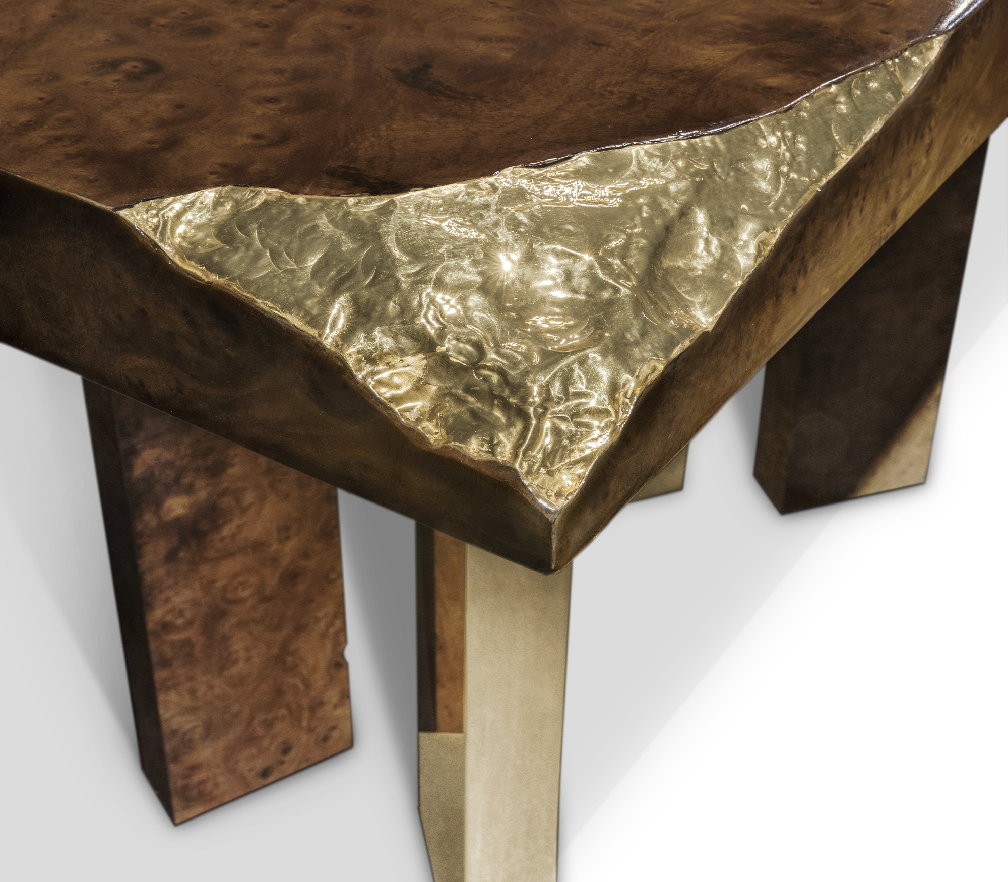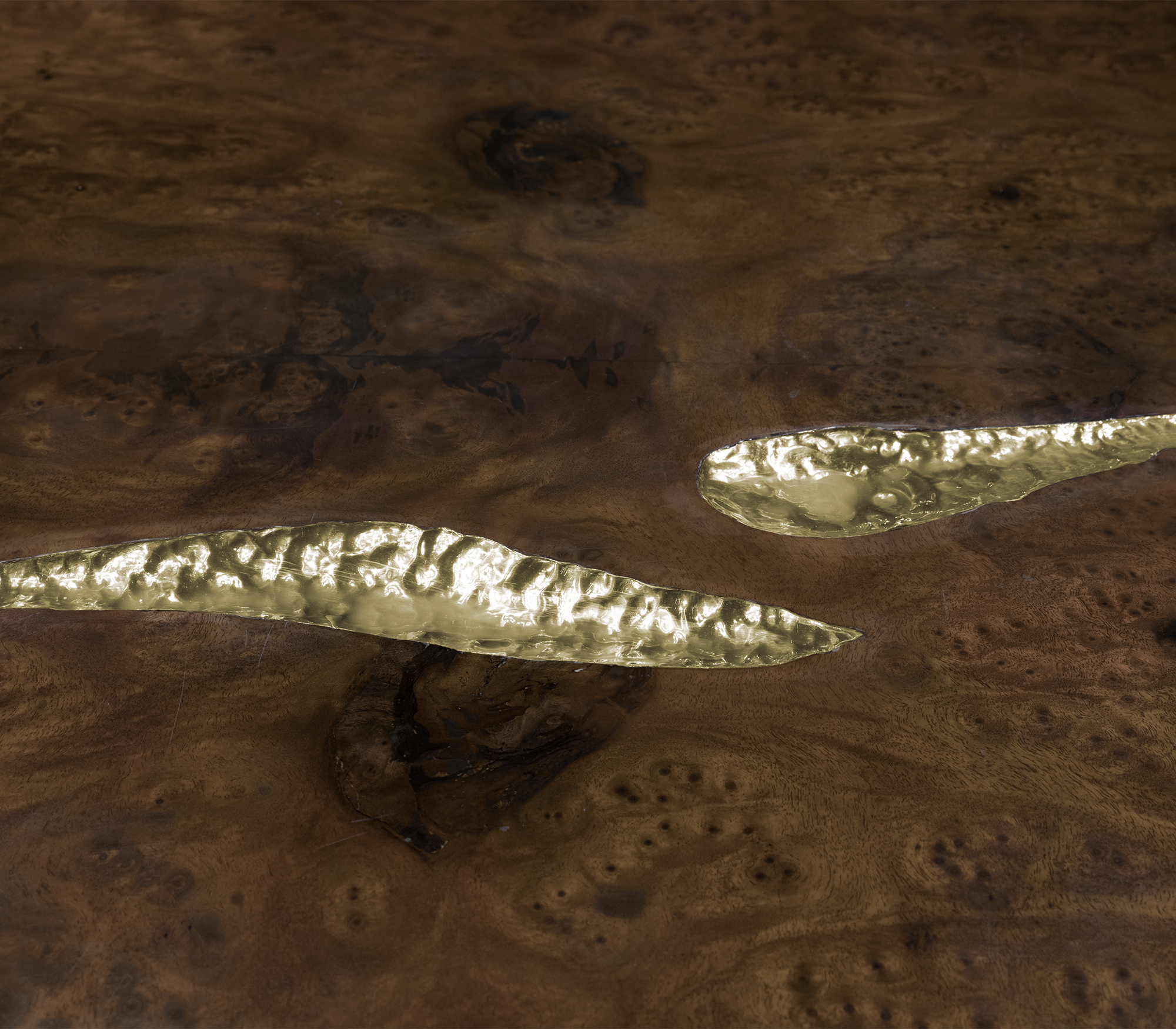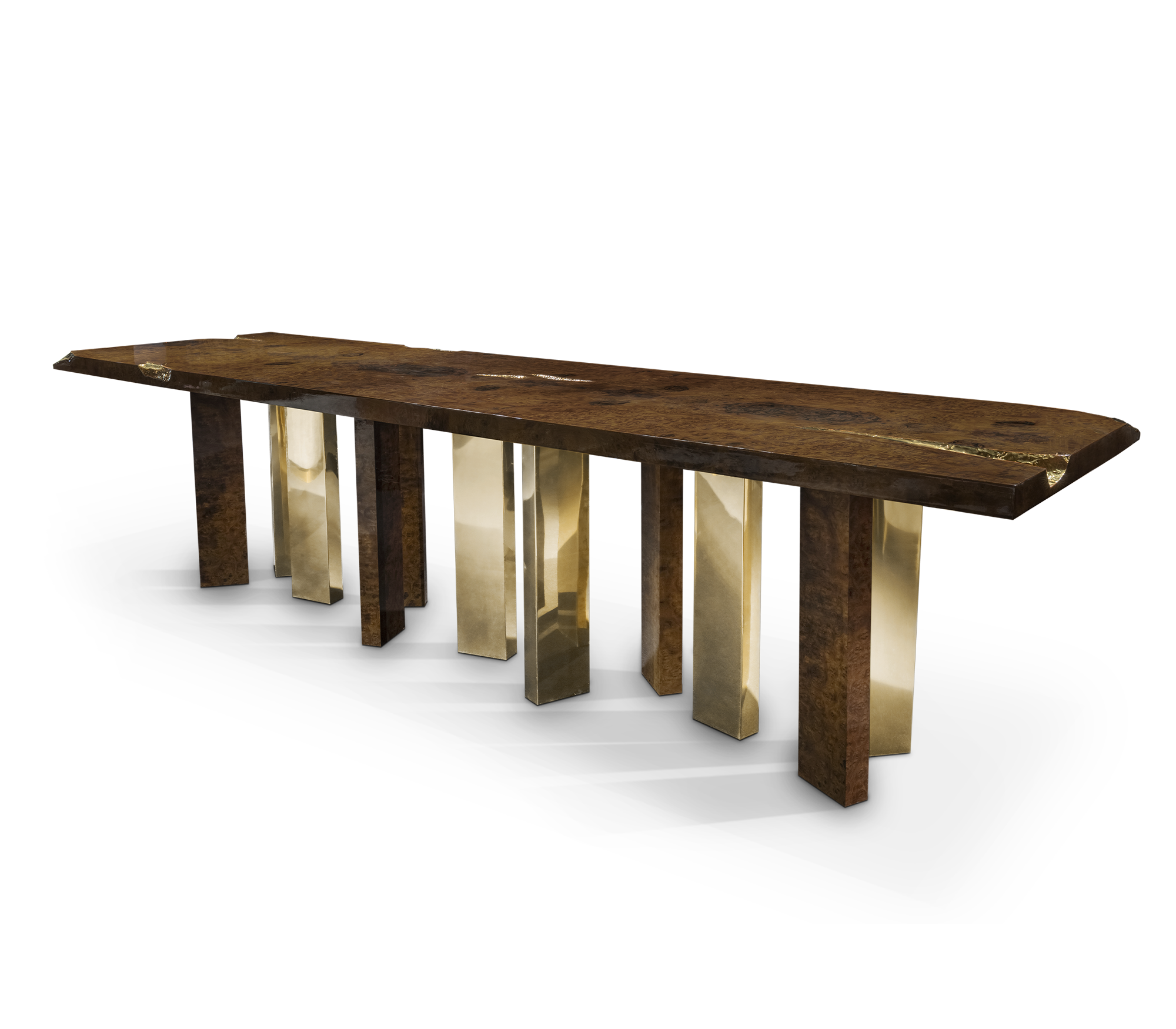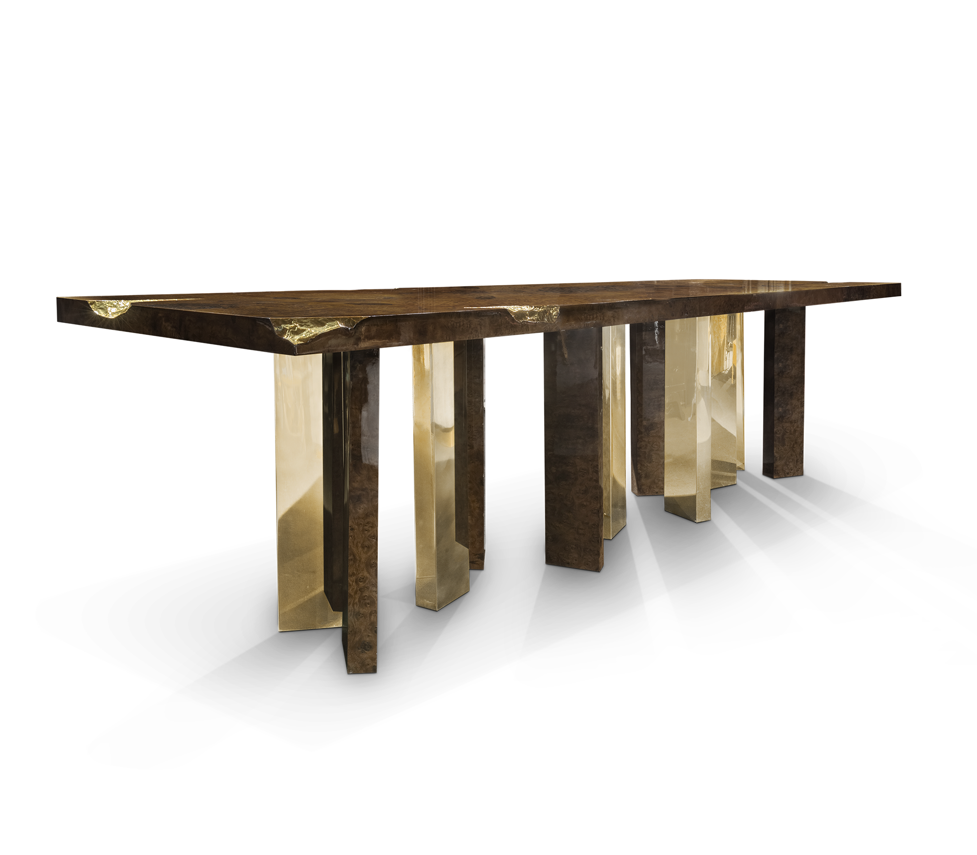 Great Empires take centuries to build, and those who rise after taking a fall find their true strength. It goes without saying that great decisions are taken around powerful tables among determined minds. The Empire dining table symbolizes generations of gatherings and decisions, both in times of celebration or tension. Its cracks reflect tough times, revealing a gold interior in a manifesto towards power. Flawless and bright, the remaining surface points towards a thriving future, reminding one to toast to prosperity.
