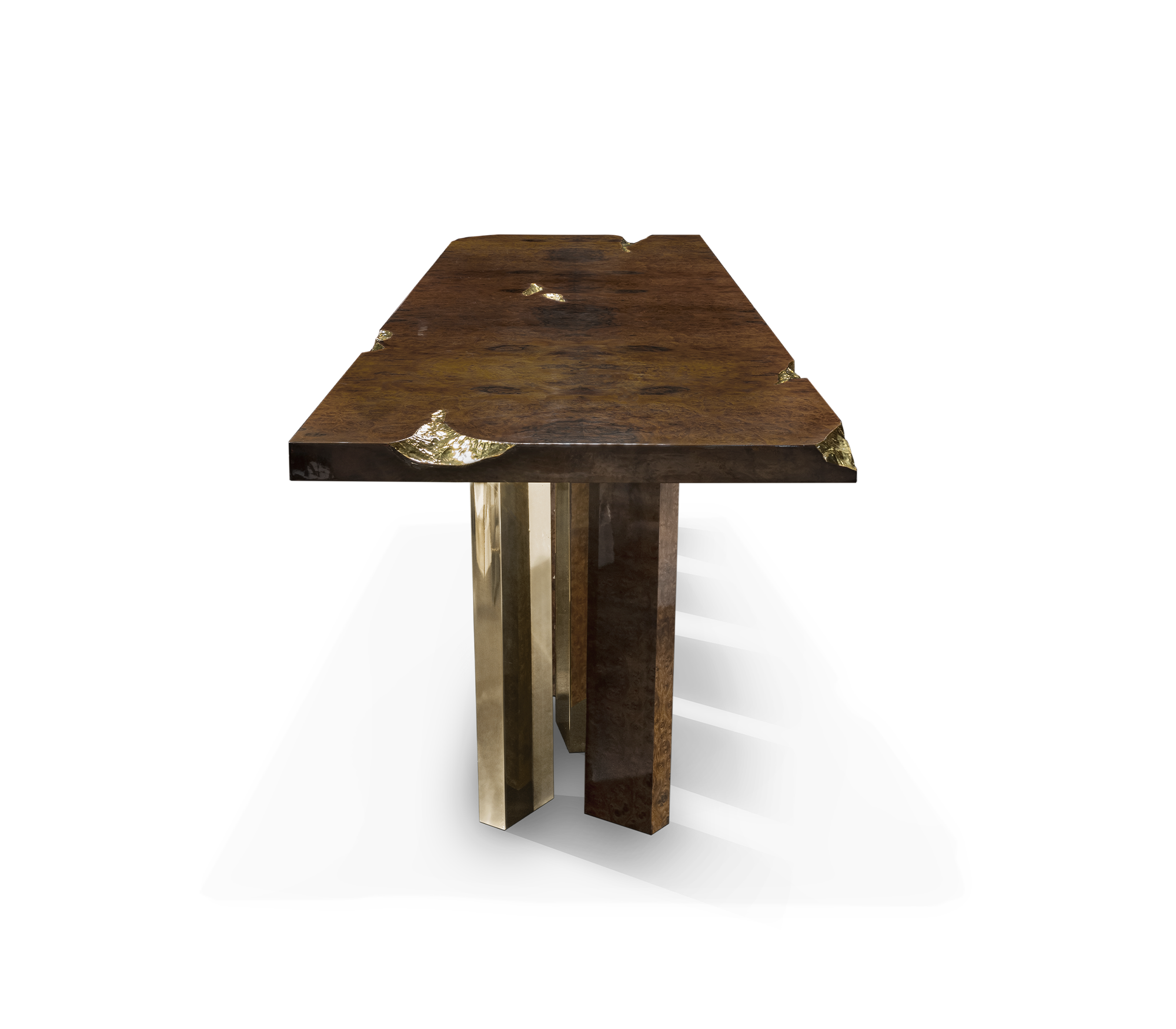 The Empire dining table’s surface is made in mahogany, coated in a fine wood veneer, with high polished brass details to fill the cracks. Its legs, also made from mahogany are finished the same way, and with polished brass sheets.