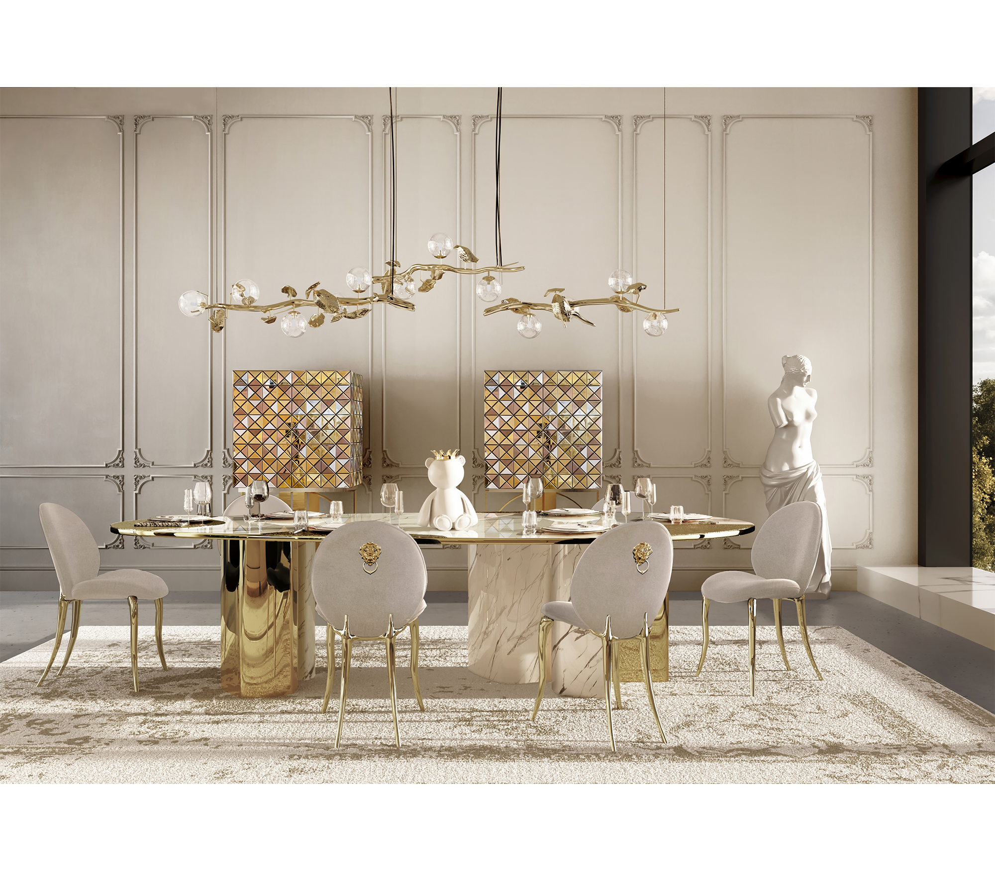 Introducing the Ophelia dining tables, a piece of furniture that lives up to its name. Derived from the Greek word 'opheleo', which means 'she helps', Ophelia is designed to help you take your interior aesthetics to new heights. This beautifully crafted dining table isn't just about functionality; it's a design companion that combines modern design with the natural beauty of marble and brass. Its versatile design ensures that it's not just a table, but a multifunctional addition that elevates any dining room.