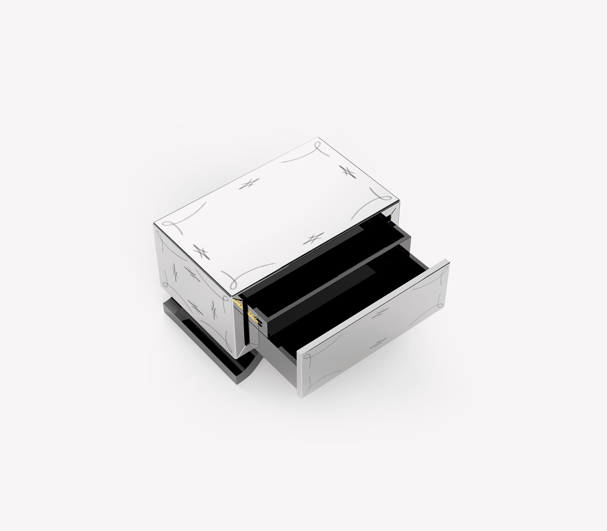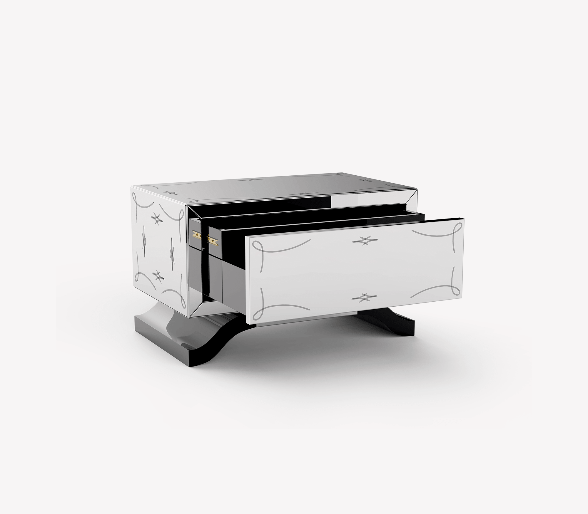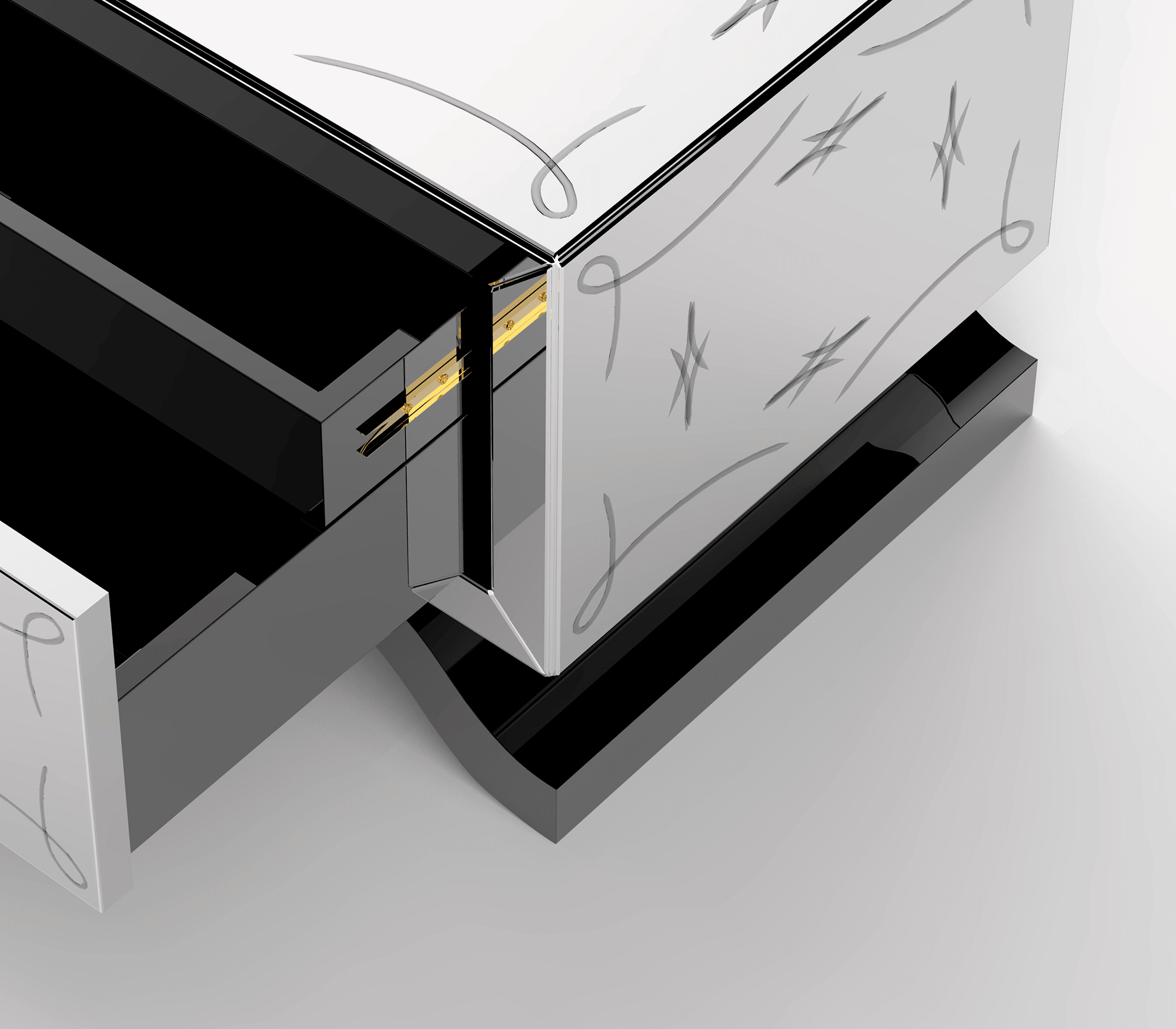 Made from poplar wood, lined by a black lacquered glass or clear mirror. The glass contains polished ornaments. It has two doors and three drawers. Its base is made in lacquered wood and finished in high gloss black. Contains two drawers ( one secret).