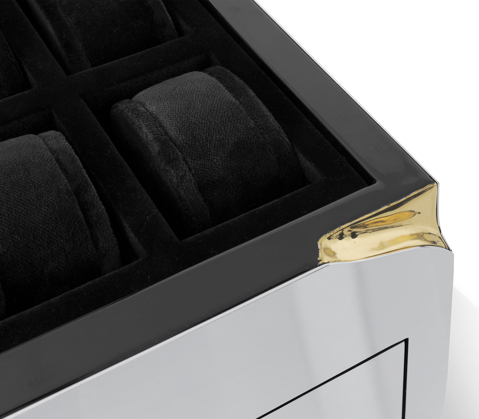 Polished stainless steel exterior with delicate hammered brass accents. Interior lined with fabric with spaces fitted for watches.