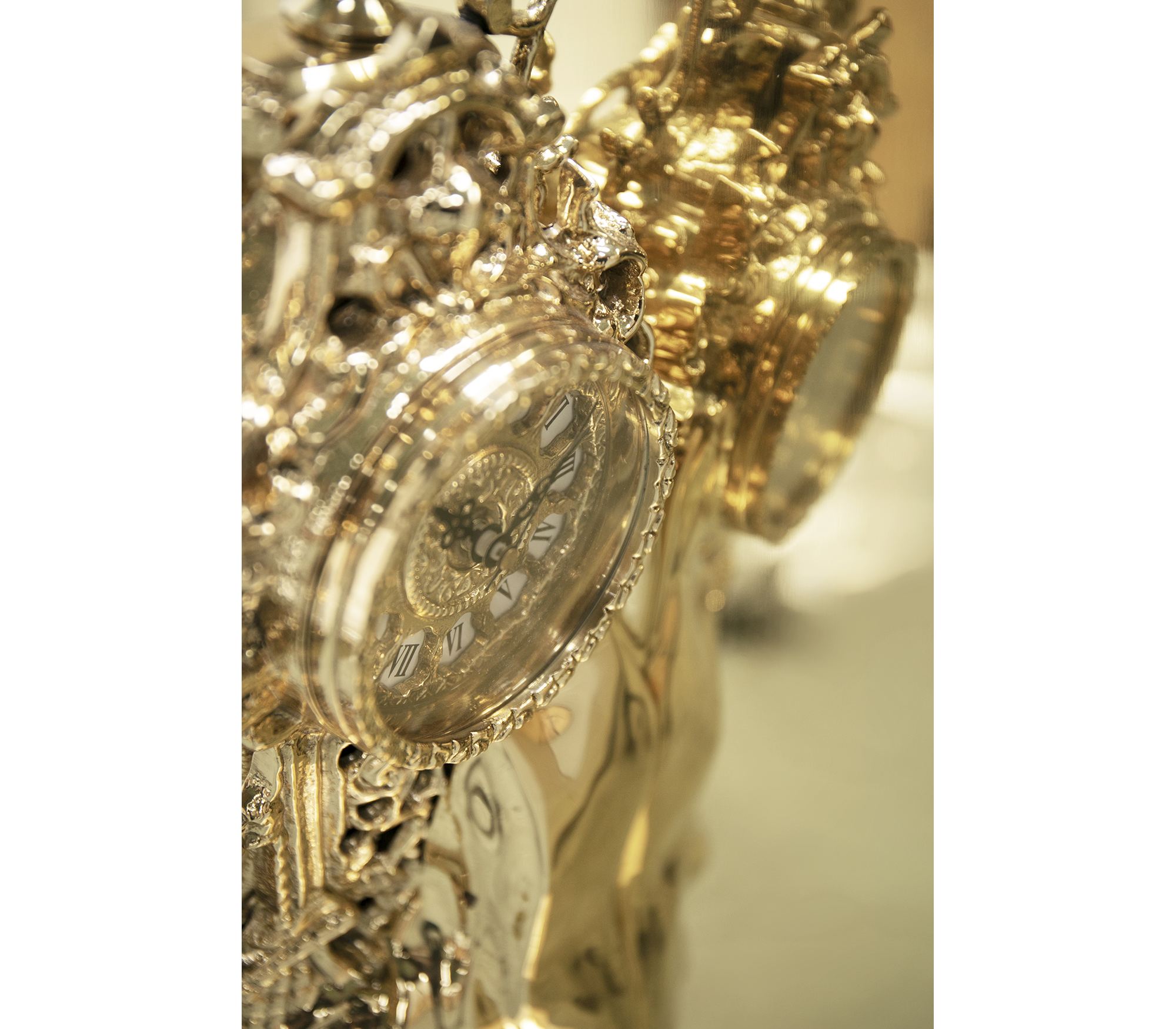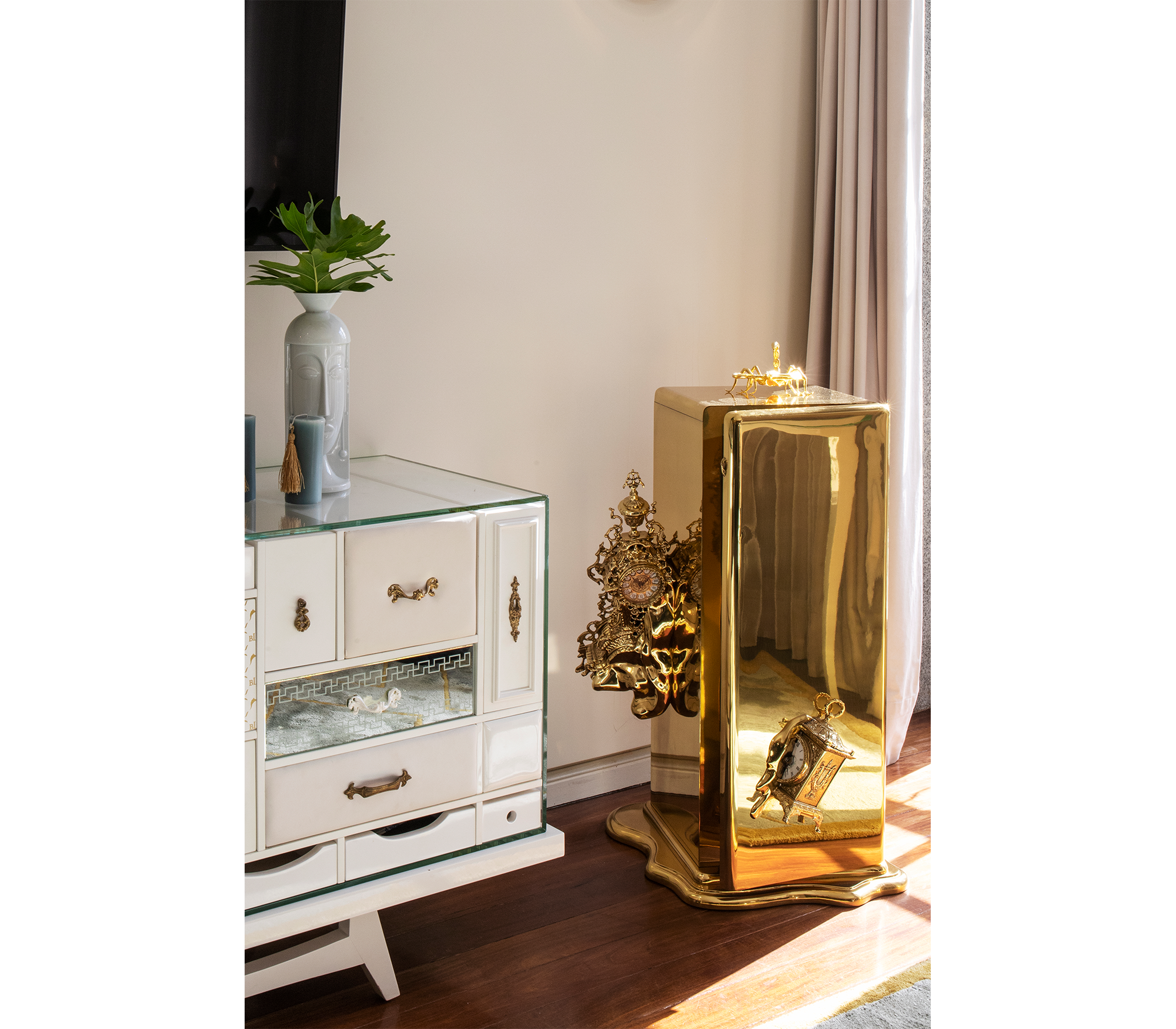 An intriguing dreamlike luxury safe inspired by the renowned artist and surrealist art movement, Salvador Dalí, and its most recognizable work: The Persistence of Memory. It is commonly known as the soft melting clocks painting which illustrates the preservation of values, amidst liquid modernity and volatility. Crafted from a mahogany wood frame, Dalí is covered in cast brass and finished with a gold plating layer. It boasts a slim and elegant look, accented by two highly ornamented mantel clocks casted on the body. Both use filigree, a delicate jewelry metalwork technique that draws inspiration from the artistic motifs of Portuguese craftsmanship. Inside, secret compartments and three watch winders can be regulated in order to take the best care of the most exquisite automatic watches. The interiors can be customized with different sets of watch winders.
