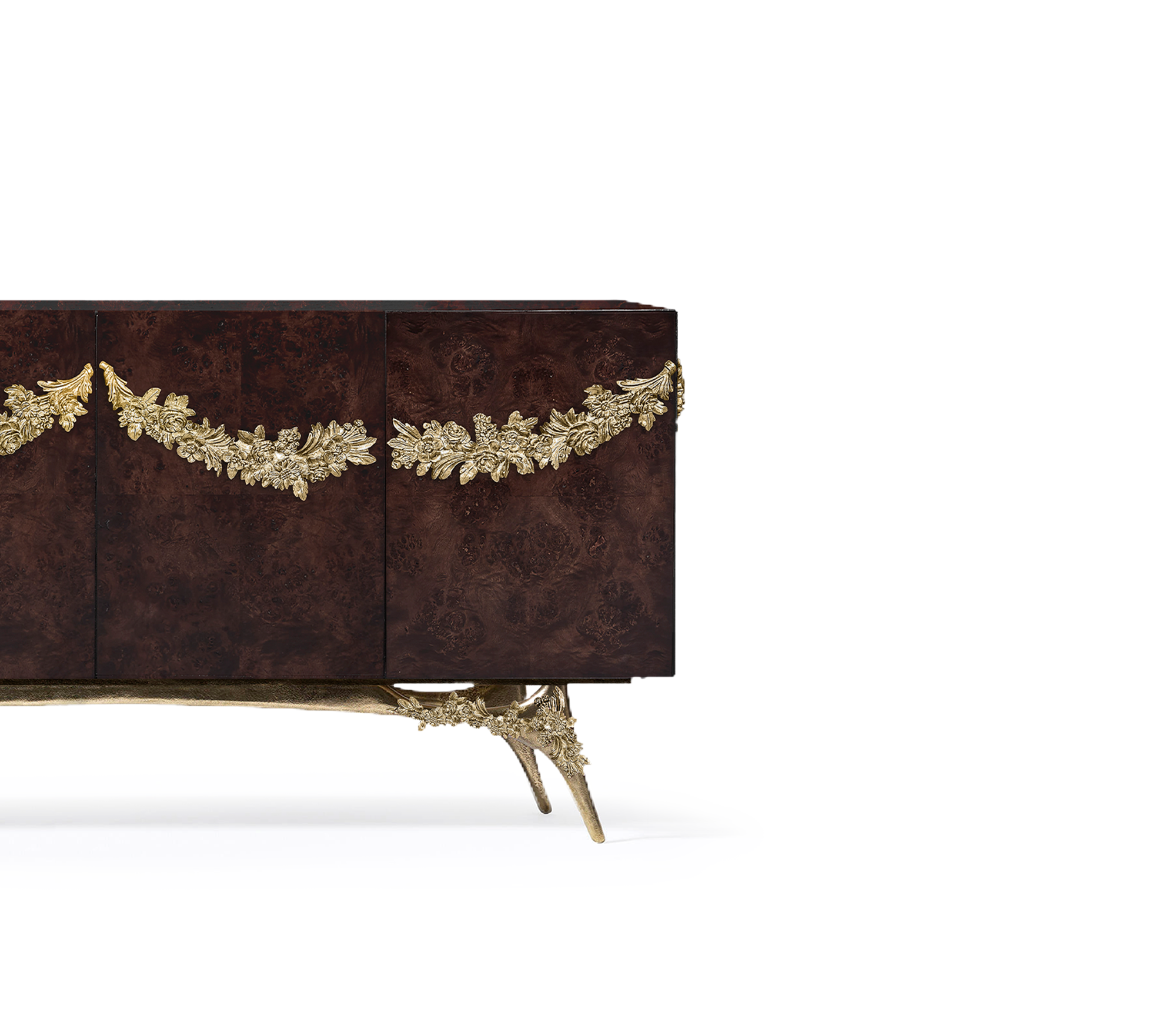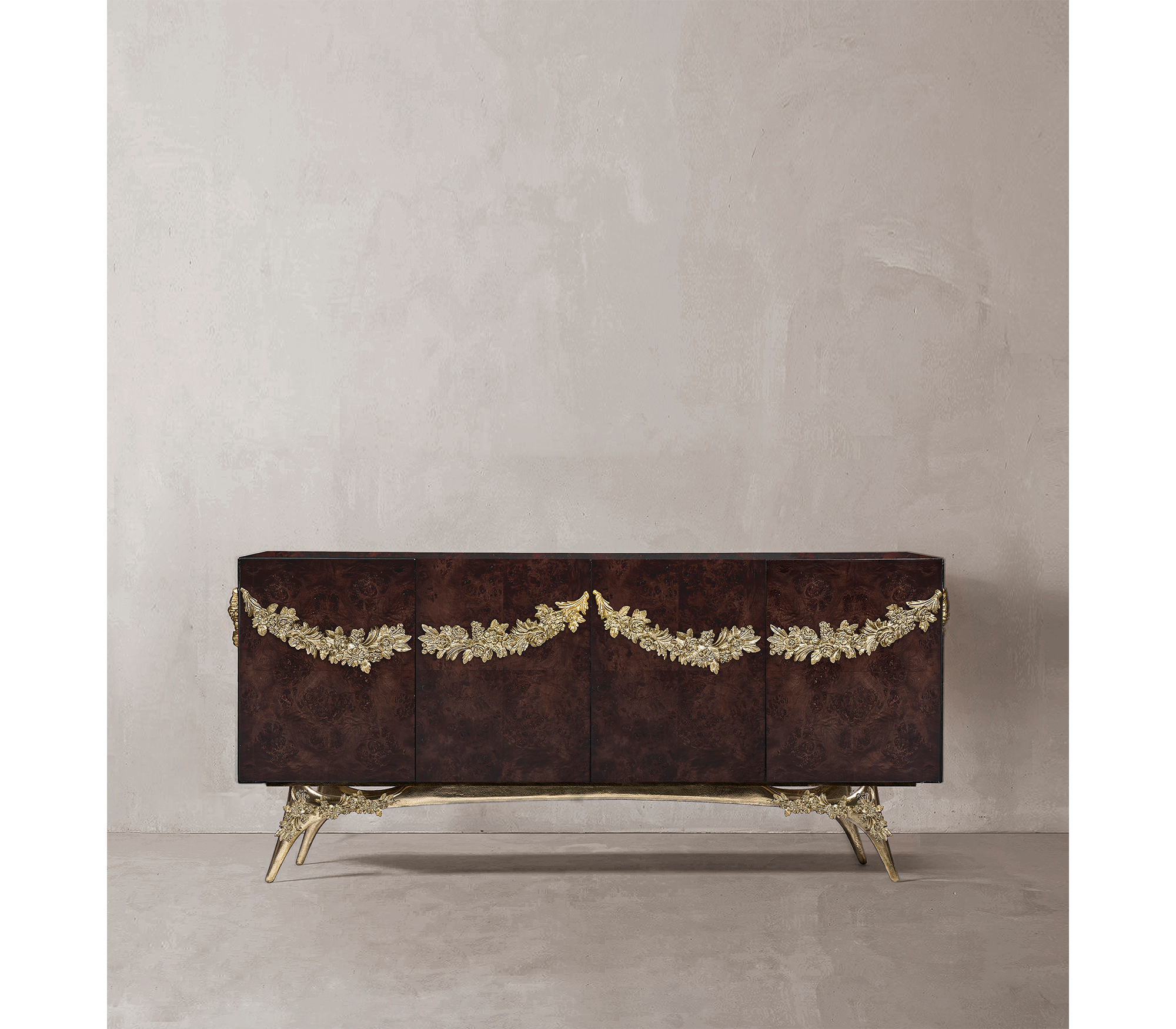 The Majestic reintrepreted by KOKET is a stunning showcase of love for the original Majestic Sideboard by Boca do Lobo. Majestic graces the Infatuation Collection BOCA DO LOBO x KOKET's, highlighting both brands' passion for metalwork. The detailed metal illuminates the formerly wood floral garland ingold as it elegantly drapes across the matte walnut root veneer frame. KOKET’s love for flowers carries the floral garland motif onto the piece’s metal base with a graceful touch near each foot, also showcasing the brand’s signature feminine curves.