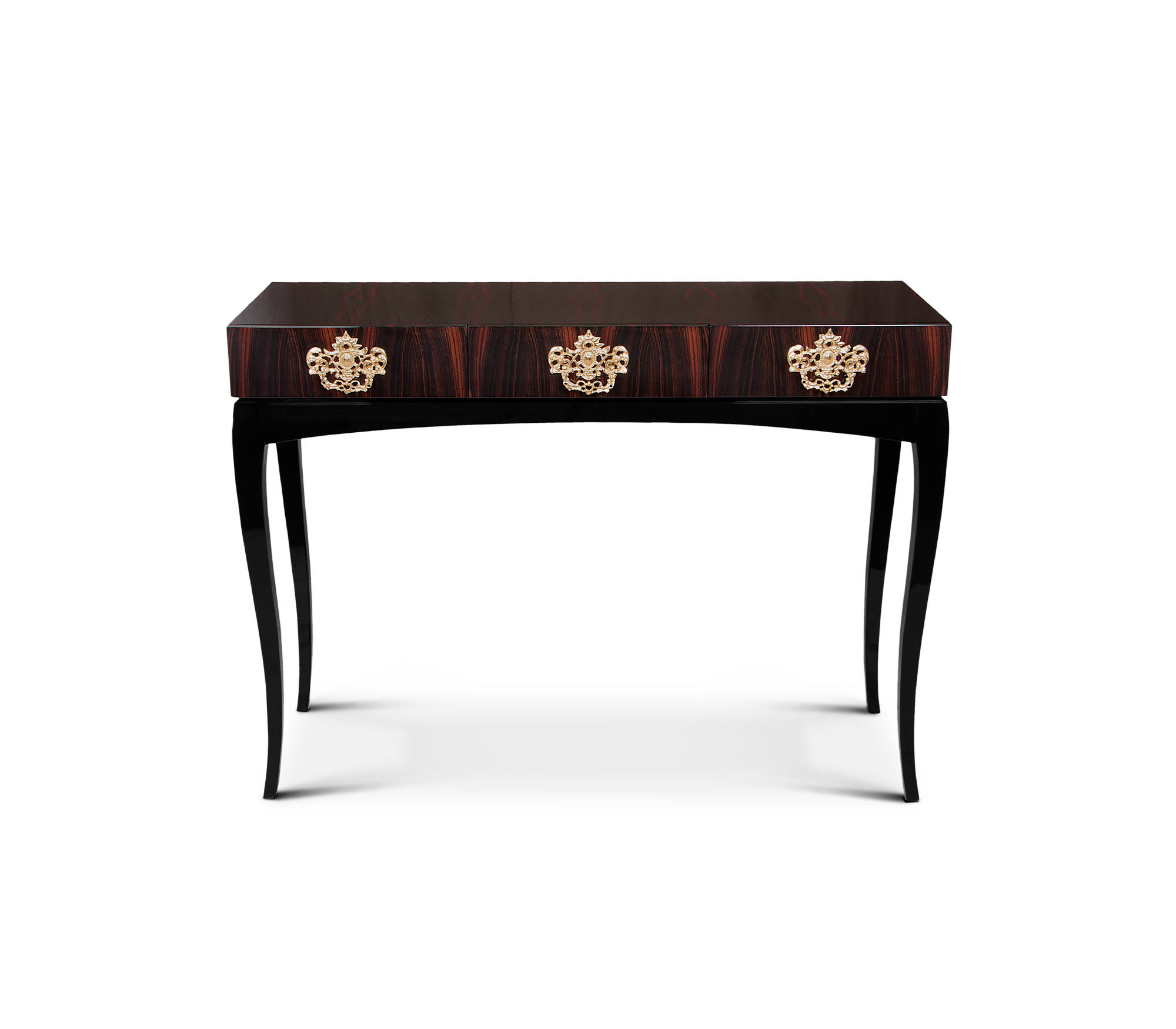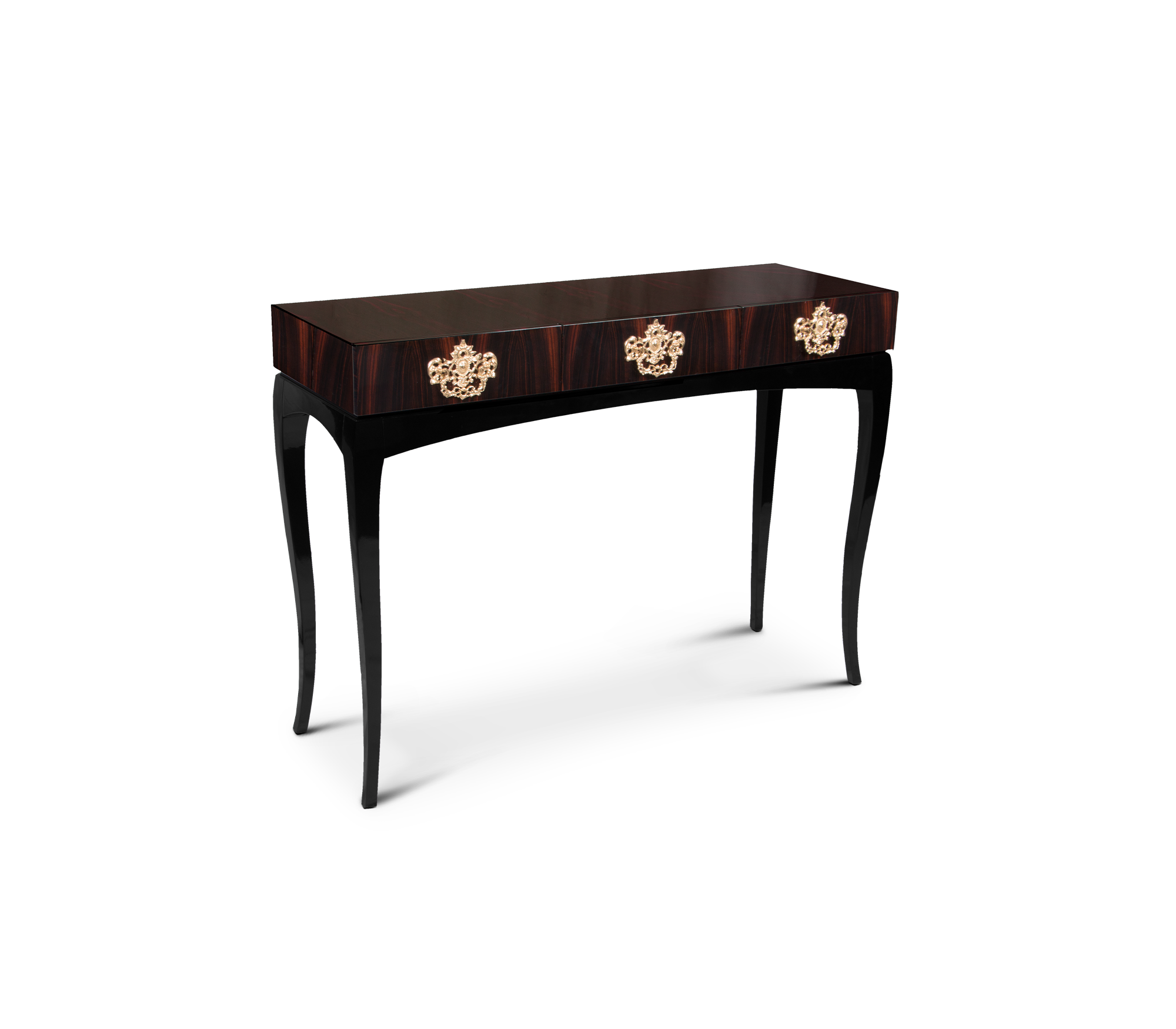 Console made in mahogany. A black glass box with floral etched accents encases three wood drawers with brass hardware, and is supported by handcrafted wood legs.