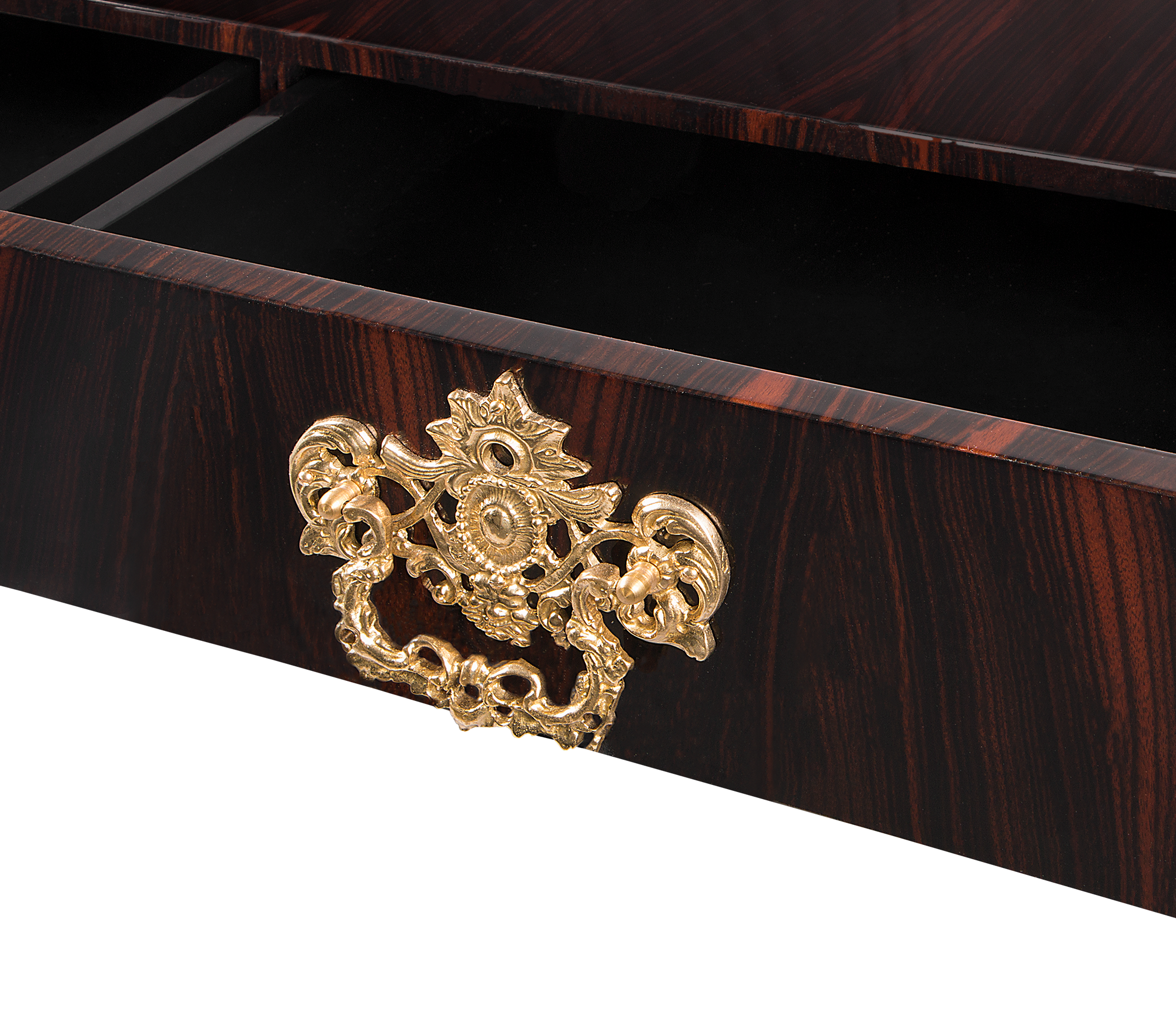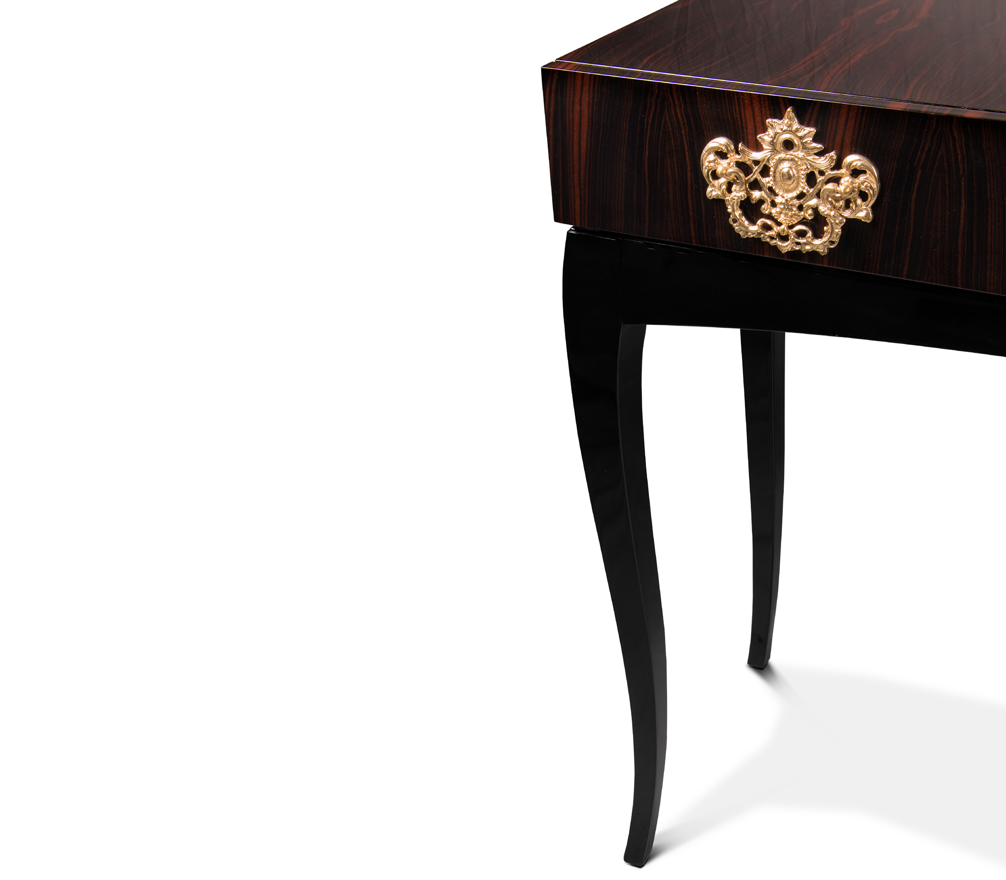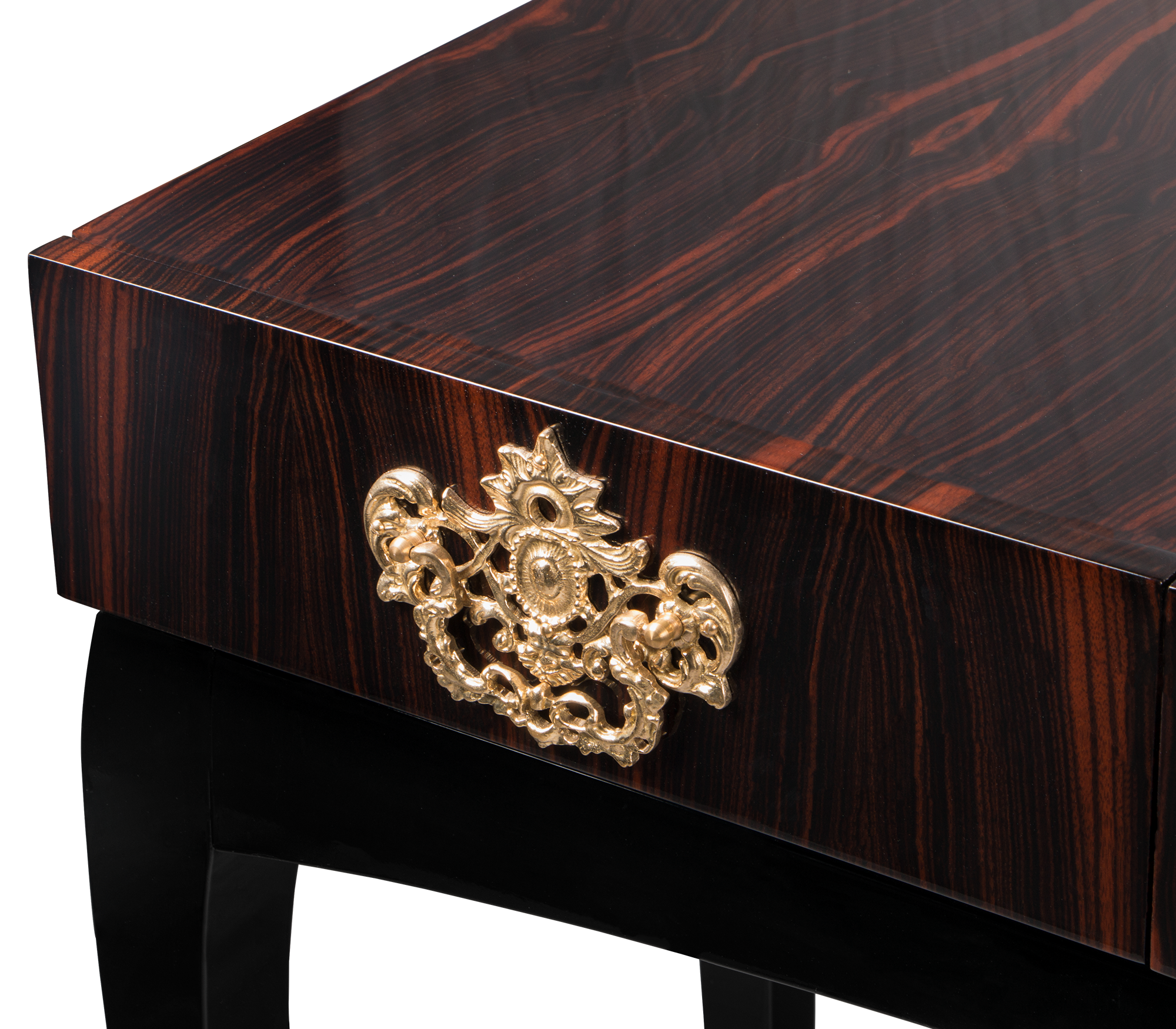 Mahogany Wood, Gold, Silver or Copper leaf, Polished Brass, Black Glass.